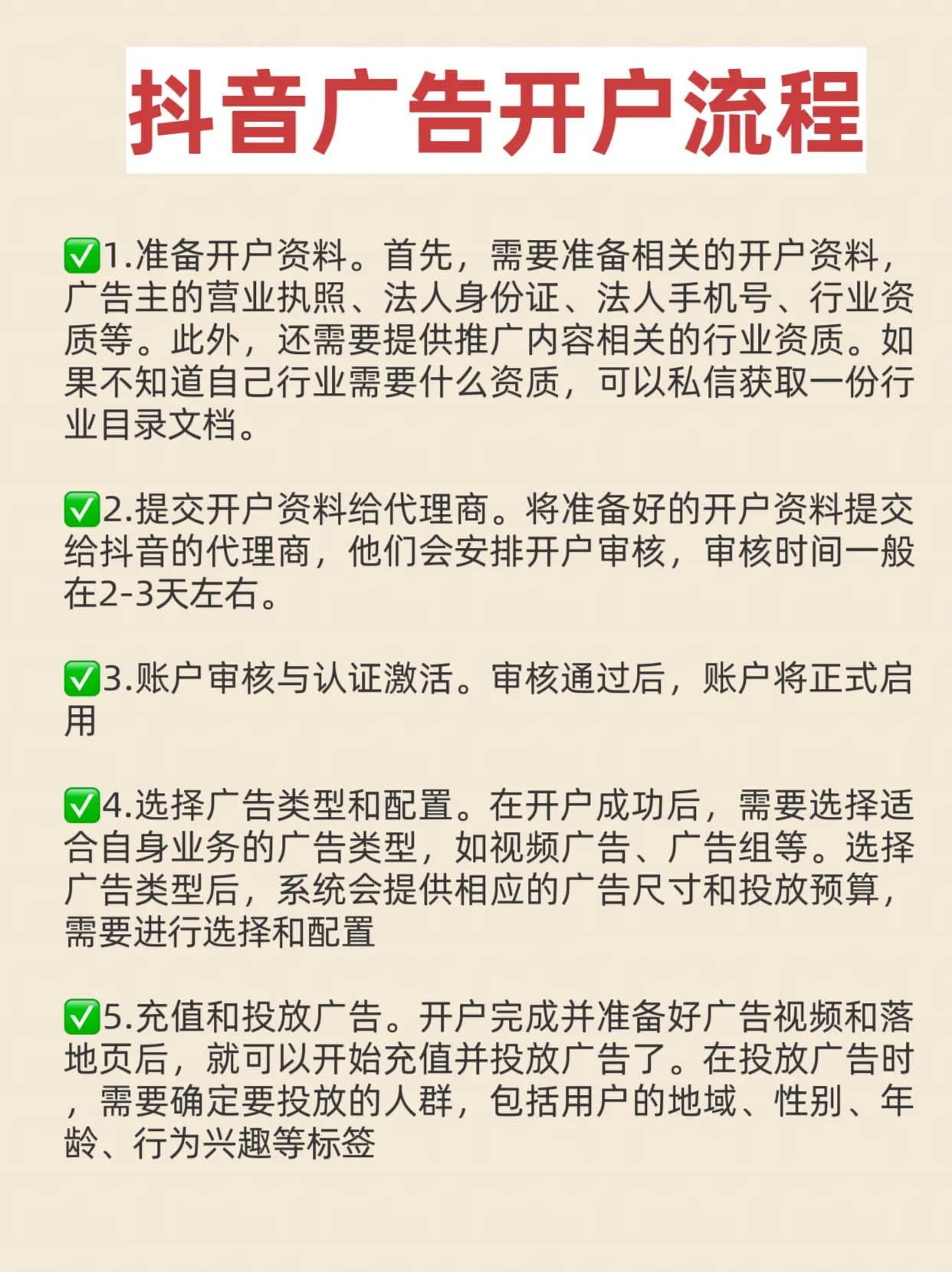 [右R]1。准备开户文件。首先,需要准备相关的开户文件,如广告主的营业执照、企业身份证、企业电话、行业资质等。此外,还需要提供与推广内容相关的行业资质。如果你不知道你所在的行业需要什么资格,你可以私下发信息获取行业目录文件。 [右R]2。向代理人提交开户信息。将准备好的开户材料提交给抖音的代理商,代理商会安排开户审核,一般需要2-3天左右。 [右R]3。帐户审查和身份验证激活。批准后,该帐户将被正式激活。 [右R]4。选择广告类型和配置。成功开户后,需要选择适合自己业务的广告类型,如视频广告、广告群等。选择广告类型后,系统会提供相应的广告规模和广告预算,这些都需要选择和配置。 [右R]5。充电并做广告。完成开户并准备好广告视频和登陆页面后,即可开始充值和广告投放。在做广告时,有必要确定目标受众,包括用户的地理位置、性别、年龄和行为兴趣等标签。