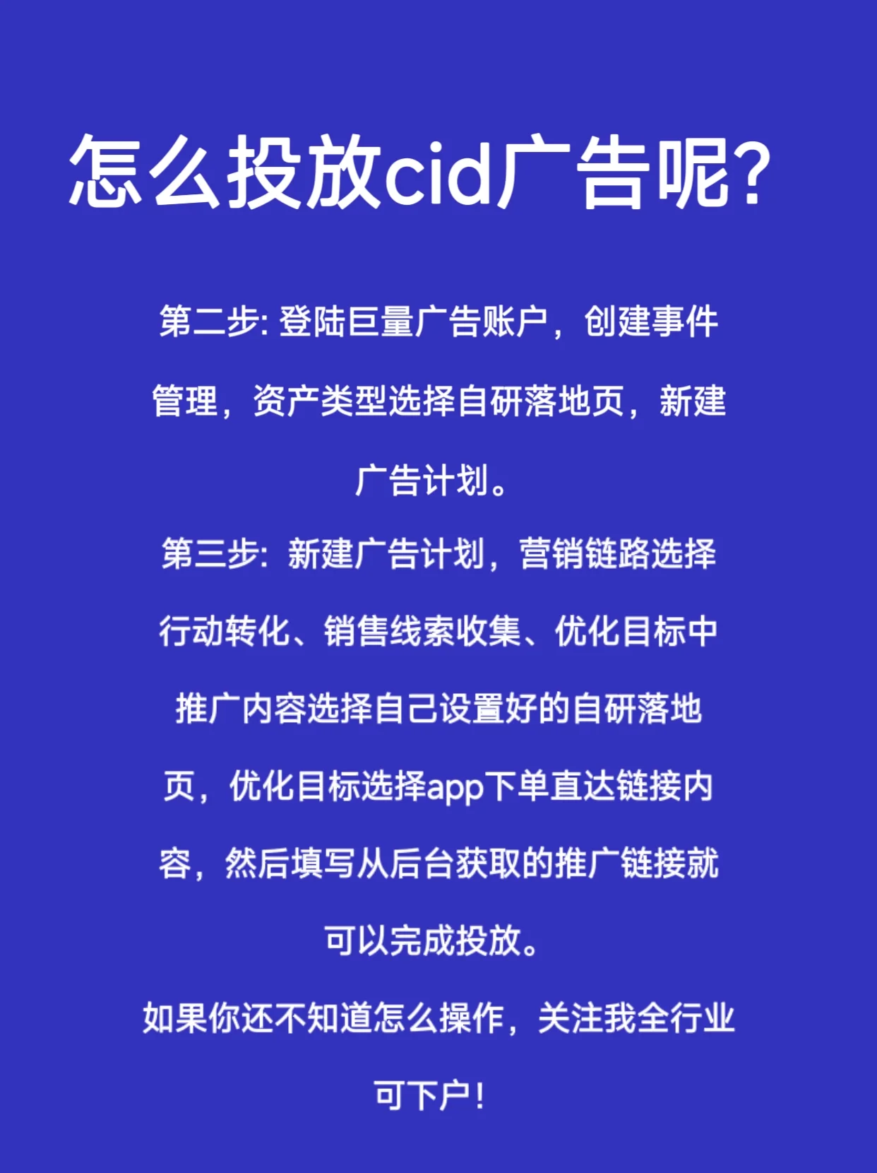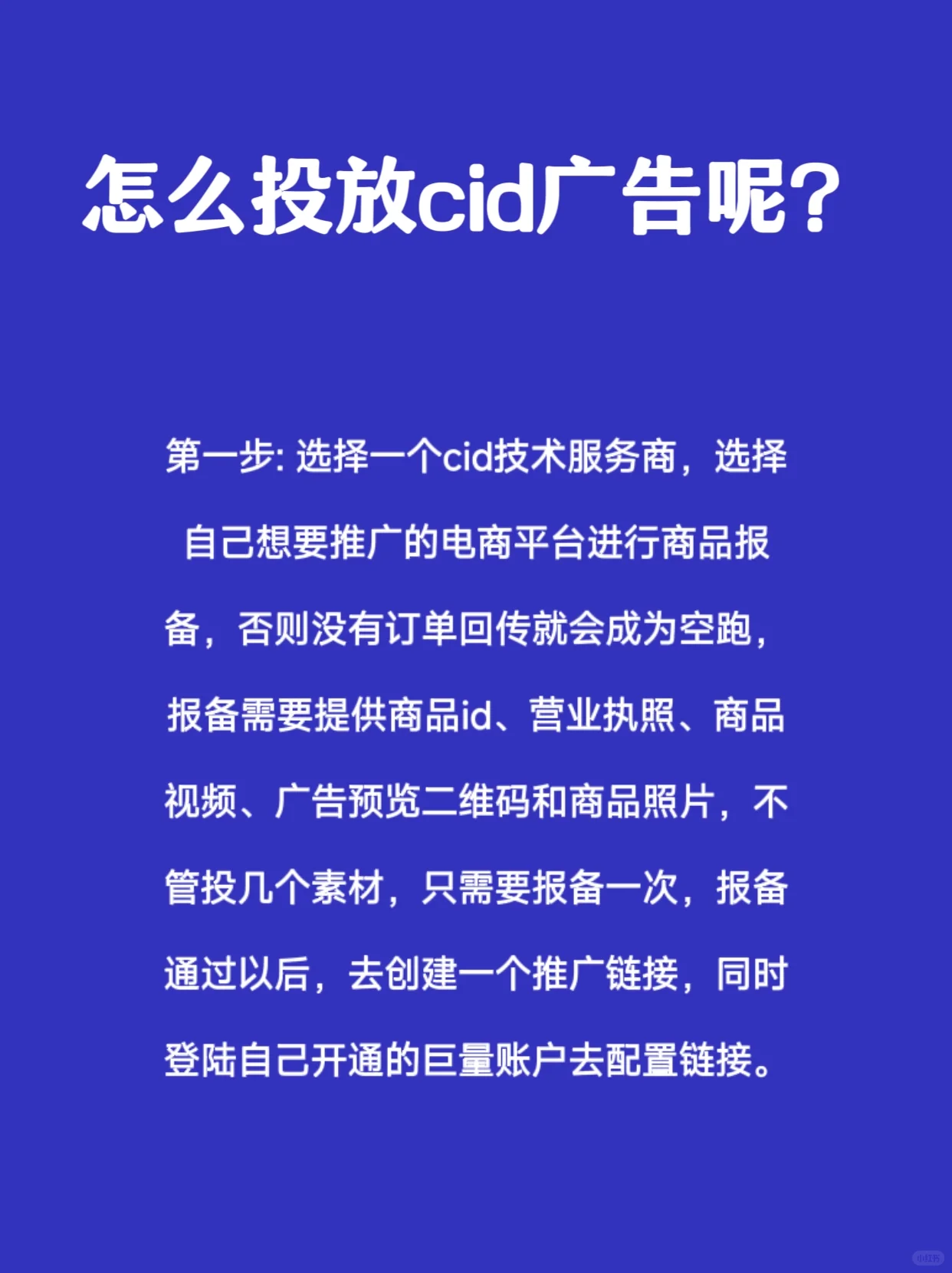 步骤1:选择CID技术服务提供商,并选择您想要推广的电子商务平台进行产品报告。否则,如果没有订单反馈,它将变成空运行。举报要求提供产品ID、营业执照、产品视频、广告预览二维码、产品照片。无论你提交了多少材料,你只需要报告一次。报告批准后,创建一个推广链接,并登录您打开的海量帐户来配置链接