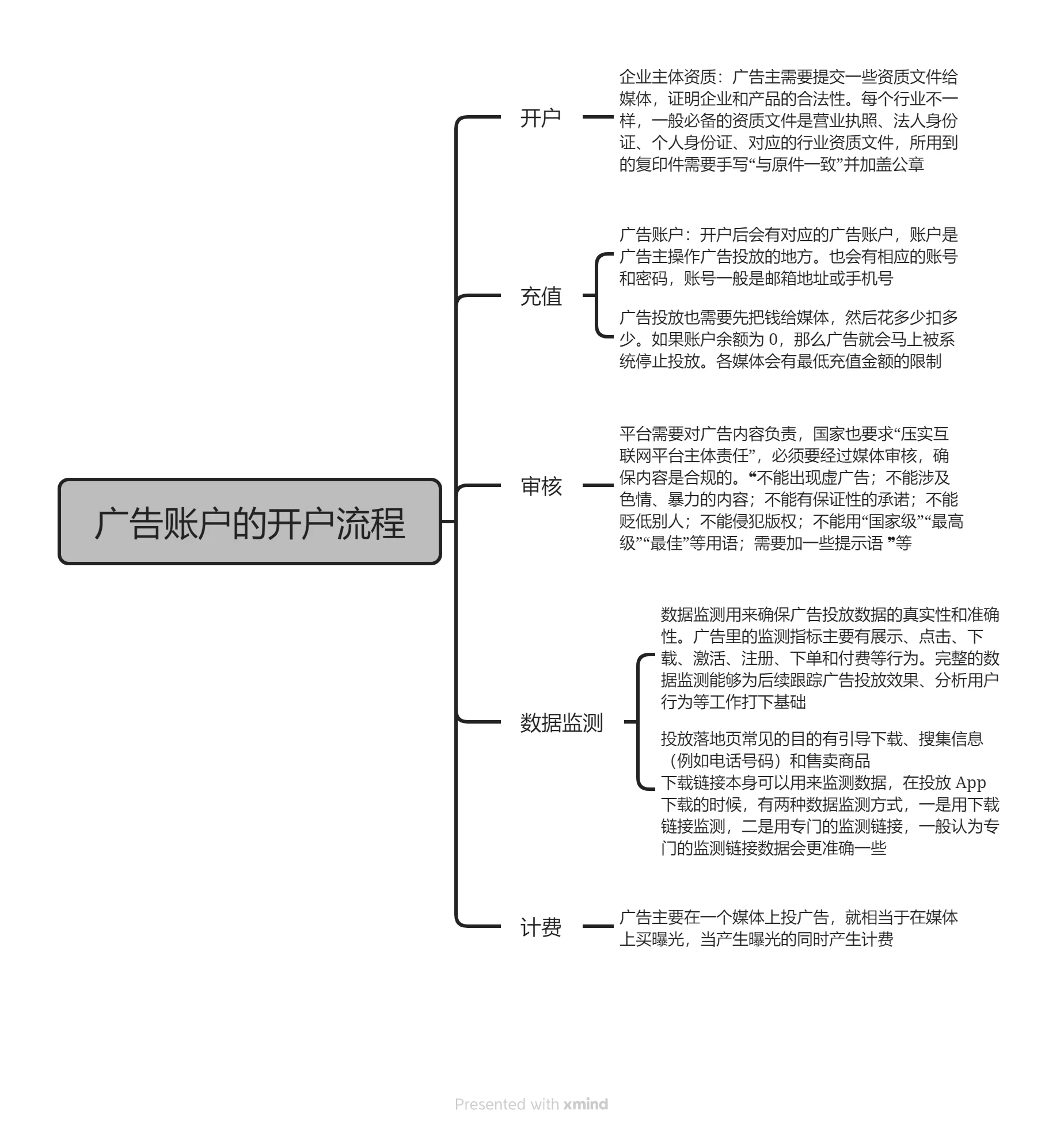 信息流广告的开户流程是什么 [1R]开户 企业资质:广告主需要向媒体提交一些资质文件,以证明企业及其产品的合法性。每个行业都不一样,一般必备的资质文件是营业执照、法人身份证、个人身份证以及相应的行业资质文件。使用的复印件需要手写“与原件一致”并加盖公章 [2R]充电 广告账号:开户后会有相应的广告账号,是广告主操作广告投放的地方。还会有相应的帐户和密码,通常是电子邮件地址或电话号码 广告植入还需要先给媒体钱,然后扣除你花的钱。如果帐户余额为0,系统将立即停止广告。每个媒体都有最低充值金额限制 【三个R】评审 平台需要对广告内容负责,国家也要求“压实互联网平台主体责任”,必须经过媒体审核,确保内容合规。不得出现虚假广告;不能涉及色情或暴力的内容;没有承诺的保证;不要贬低他人;不能侵犯版权;不能使用“国家级”、“最高级别”和“最佳”等词;需要添加一些提示语言等 【四R】数据监控 数据监控用于确保广告投放数据的真实性和准确性。广告中的监控指标主要包括显示、点击、下载、激活、注册、订购和支付行为。完整的数据监控可以为后续的广告效果跟踪、用户行为分析等相关工作奠定基础 广告登陆页的常见目的包括引导下载、收集信息(如电话号码)和销售产品。下载链接本身可以用于监视数据。广告应用下载时,有两种方式可以监控数据:一种是使用下载链接进行监控,另一种是通过专用的监控链接进行监控。人们普遍认为,专用的监测链路将提供更准确的数据 [5ve R]计费 广告主要在媒体平台上进行,相当于在媒体上购买曝光率。当产生风险敞口时,同时产生账单