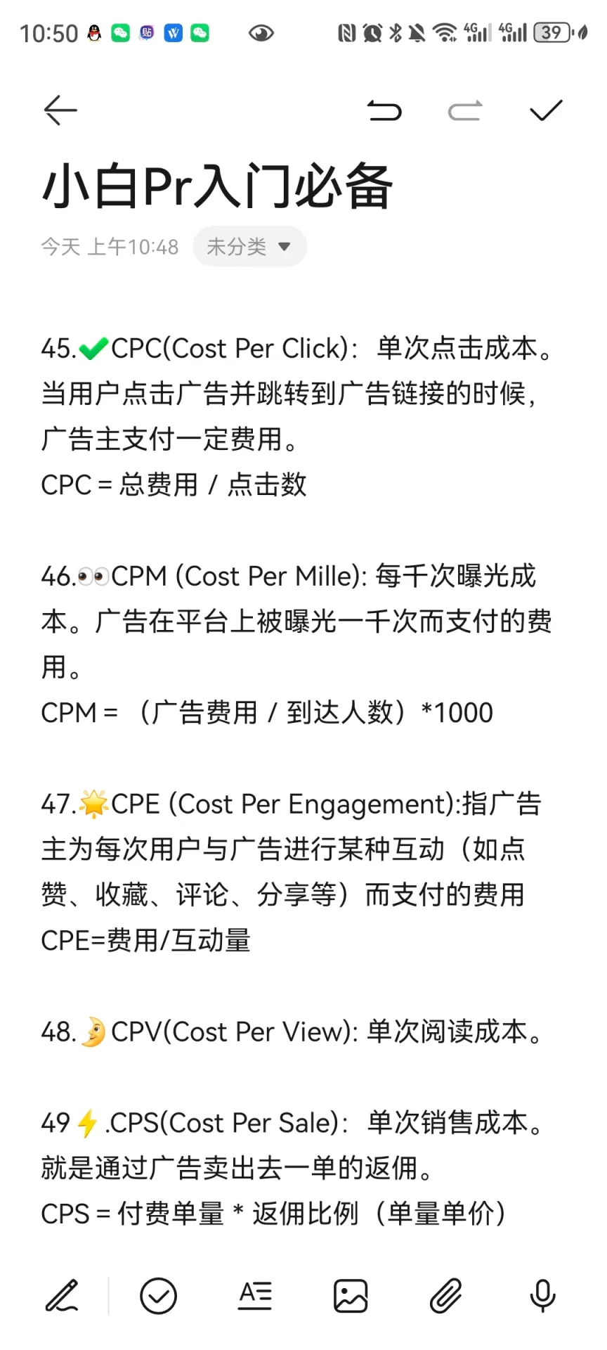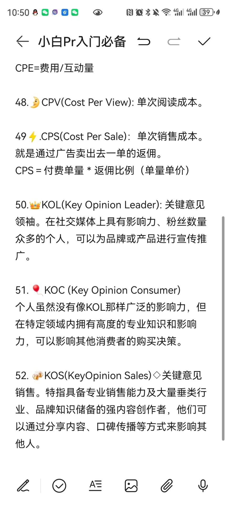 大家好,我是小麒麟, 今天,继续前面的内容,让我们继续分享一些关于PR计费方式和专有条款的信息 45️ CPC(点击成本):点击成本。当用户点击广告并重定向到广告链接时,广告商支付一定的费用。 CPC=总成本/点击量 46? CPM(每千年成本):每千次曝光的成本。广告在平台上曝光1000次所支付的费用。 CPM=(广告成本/到达人数)*1000 47? 每次参与成本(CPE):指广告商为用户和广告之间的每次互动支付的费用,如点赞、书签、评论、分享等 CPE=成本/交互量 48? CPV(每次查看的成本):每次读取的成本。 49⚡. CPS(每次销售成本):每次销售的成本。它是通过广告销售单个订单的佣金。 CPS=已付款订单数量*折扣率(每订单数量的单价) 50? KOL(关键意见领袖):关键意见领袖。在社交媒体上有影响力和大量追随者的个人可以推广他们的品牌或产品。 51? KOC(主要意见消费者) 尽管个人可能没有KOL那么广泛的影响力,但他们在特定领域拥有高水平的专业知识和影响力,这可以影响其他消费者的购买决策。 52? 关键意见销售(KOS)◇ 关键意见销售。它专门指在垂直行业和品牌中具有专业销售能力和丰富知识的强大内容创作者。他们可以通过分享内容、口碑传播和其他方式影响他人。 专家布局|普通店铺数量|店铺专家探索