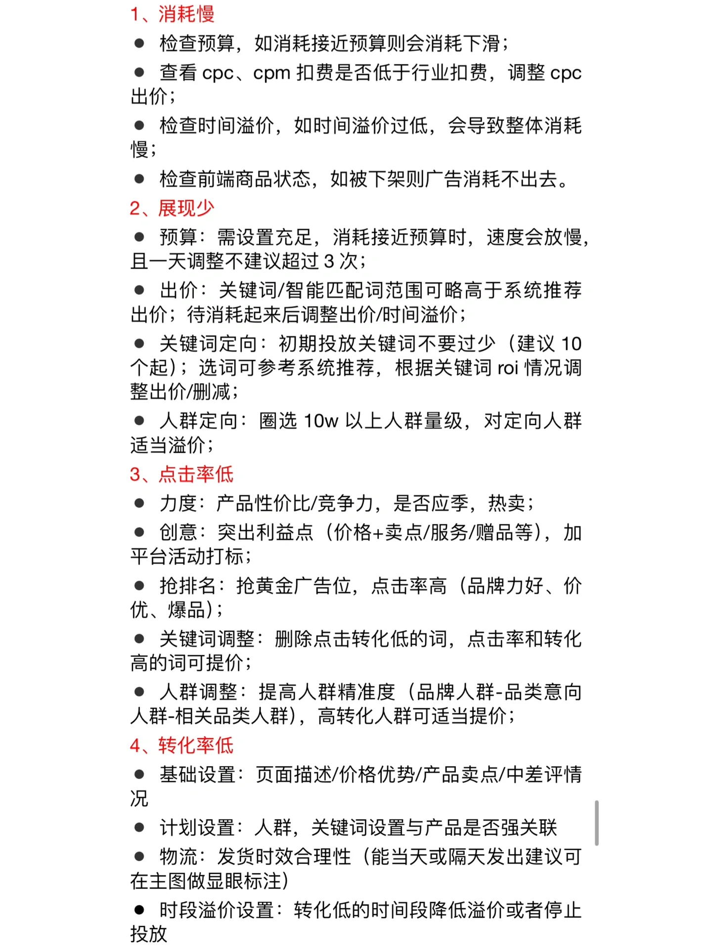 对于电子商务推广初学者来说是必不可少的,即使是初学者也能理解。建议接受它 基本指标解读 CPC(每次点击成本):每次点击成本 CPA(每次行动的成本):根据成就/行动的数量计费;一般是转化成本或订购成本,也就是说,为了方便一个订单,广告费用愿意花多少钱 CPM(每工厂成本):每千次印数收费(每千次印数价格) CPS(每笔销售成本):每笔交易的费用; CVR(点击率):转化率; 点击率:点击率; ROI:投资回报率、投入产出比 TCPA:一种以控制订单成本为目标的智能投标工具 OCPM:智能千时显示计费,这意味着平台工具将根据广告商的情况智能地显示给潜在的订购受众; 交易操作的优化逻辑 一⃣ 消耗缓慢 检查预算,如果消费接近预算,就会减少; 检查CPC和CPM扣除额是否低于行业扣除额,并调整CPC投标; 检查时间溢价,如果时间溢价过低,会导致整体消费缓慢; 检查前端产品的状态,如果它们被取下,则广告无法消费。 二⃣ 缺乏介绍 预算:需要设定充足的预算,当消费接近预算时,速度会减慢,不建议每天调整三次以上; 出价:关键词/智能匹配词的范围可以略高于系统的推荐出价;调整消费后的出价/时间溢价; 关键词定位:初期不要投入太少的关键词(建议从10个开始)。您可以参考系统推荐进行选词,并根据关键词的ROI调整出价/删除; 目标受众:圈出10万或以上的目标受众,并为目标受众提供适当的溢价; 三⃣ 点击率低 优势:产品性价比/竞争力、季节性、热销; 创意:突出盈利点(价格+卖点/服务/礼品等),增加平台活动品牌; 排名竞争:争创点击率高(品牌力好、价格有竞争力、产品爆款)的黄金广告位; 关键词调整:删除点击转化率低的词,点击率和转化率高的词可以涨价; 人口调整:提高受众精准度(品牌受众-品类意向受众-相关品类受众),针对转化率高的受众适当提价; 四⃣ 转化率低 基本设置:页面描述/价格优势/产品卖点/中差评 计划设置:受众、关键词设置,以及是否与产品有很强的相关性 物流:合理的发货时间(如果当天或第二天可以发货,建议在主图片上做显著标记) 时段溢价设置:在低转换时段降低溢价或停止广告 ☑️ ROI=交易金额/消费 交易金额=显示量*点击率*转化率*客户价格 消耗=显示量*点击率*CPC,优化以上指标一定会提高ROI。