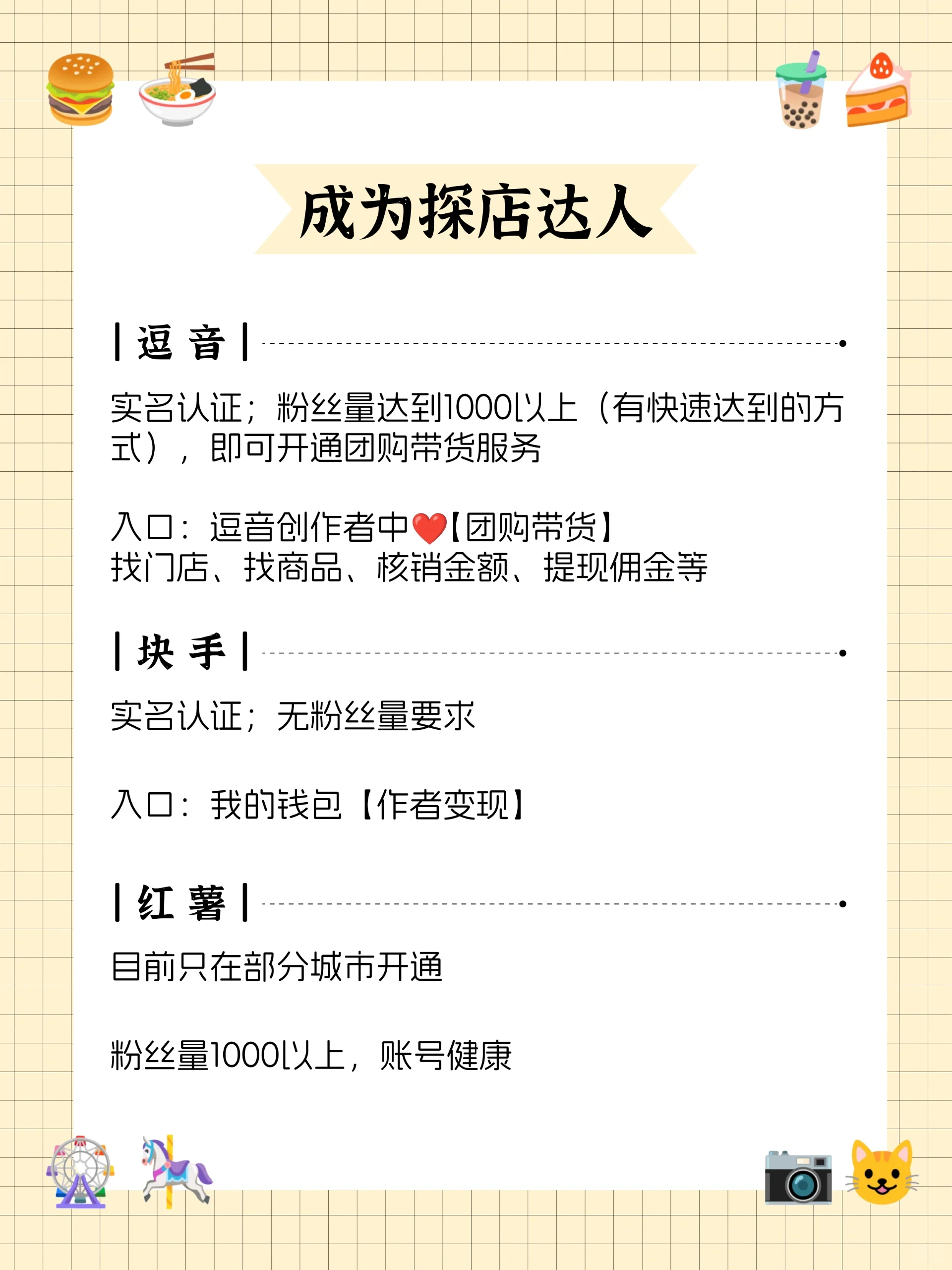说到餐厅探险专家,很多人会想到那些到处吃吃喝喝的美食专家 —— 事实上,除了食品(餐厅),所有有实体店的线下商家都可以“探索” —— ? 探索商店类别(图2) 一️⃣ 餐饮 二️⃣ 葡萄酒旅行 三️⃣ 休闲娱乐 四️⃣ 生活服务 ️ 统称为当地生活服务 ️ 你可以选择单一的赛道,如专门从事餐饮(美食专家)、白酒和旅游(旅游专家);你也可以选择一条全面的赛道,做任何事情 —— ? 什么是探索商店 在实体店体验产品或服务并分享经验 没有商业模式的探店:互联网平台种草或拔草,纯内容共享 以商业模式探店:互联网平台种草引流门店,实现内容变现 —— ? 探索门店商业模式 一️⃣ 商家或代理运营商可以在平台上发起团购,并设置CPS佣金 二️⃣ 在专家现场参观商店后,平台发布带有POI(商店位置)的内容(视频或文本) 三️⃣ 用户可以查看影响者的内容,点击提供的POI,跳转到团购页面下单,验证他们在商店的消费,并从影响者那里获得CPS佣金收入 四️⃣ 商家或代理运营商投资销售业绩好的有影响力的人的视频 —— ? 探店收入构成 一️⃣ 车马费 根据影响者级别、粉丝群等,有50到1000个选项+ 二️⃣ CPS佣金收入 有很多实体餐饮店,销售额高,佣金低 休闲娱乐,生活服务高佣金 三️⃣ 商业订单 四️⃣ 探索商店直播 五️⃣ 收头(割韭菜) —— ? 订单渠道 一️⃣ 平台商人广场 二️⃣ 专家组 三️⃣ 本地生活MCN 四️⃣ 第三方代理运营商 ️ 订单流程:注册->商家反向选择->参观拍摄->剪辑成电影->商家审核成电影->审批上映->运输运输费用结算 —— ? 探索存储方法 一️⃣ 合作探店:免费吃喝玩乐,体验(交流),收取商家运输费,发布需要商家审批的视频。如果它不好,就不能说它不好 二️⃣ 自费逛店:自己花钱钱坦典,优点是发送视频不需要商家审核,可以真实 三️⃣ 云探索店:商家或第三方运营商拍好素材照片,云编辑,无需在店内实体探索,简单但低成本 —— ? 如何成为店铺探索专家(图3) 主流平台:豆声音,块手,红的马铃薯 —— ? 优点和缺点 一️⃣ 优点:门槛低,还可以图文带货,任何人都可以做,可以做副业;自由体验(白色浮子[doge]);它与粉丝数量无关,因此很容易下单 二️⃣ 缺点:参与人数过多,头部相对固定,竞争激烈;但仍有机会认真对待️ 机会,加入当地的生活方式MCN会更好 —— ? 其他相关职位 一️⃣ 业务拓展(BD):与商家洽谈合作,在平台上发起团购 二️⃣ 专家操作:线上线下团购,招募探店专家带领销售等 ——