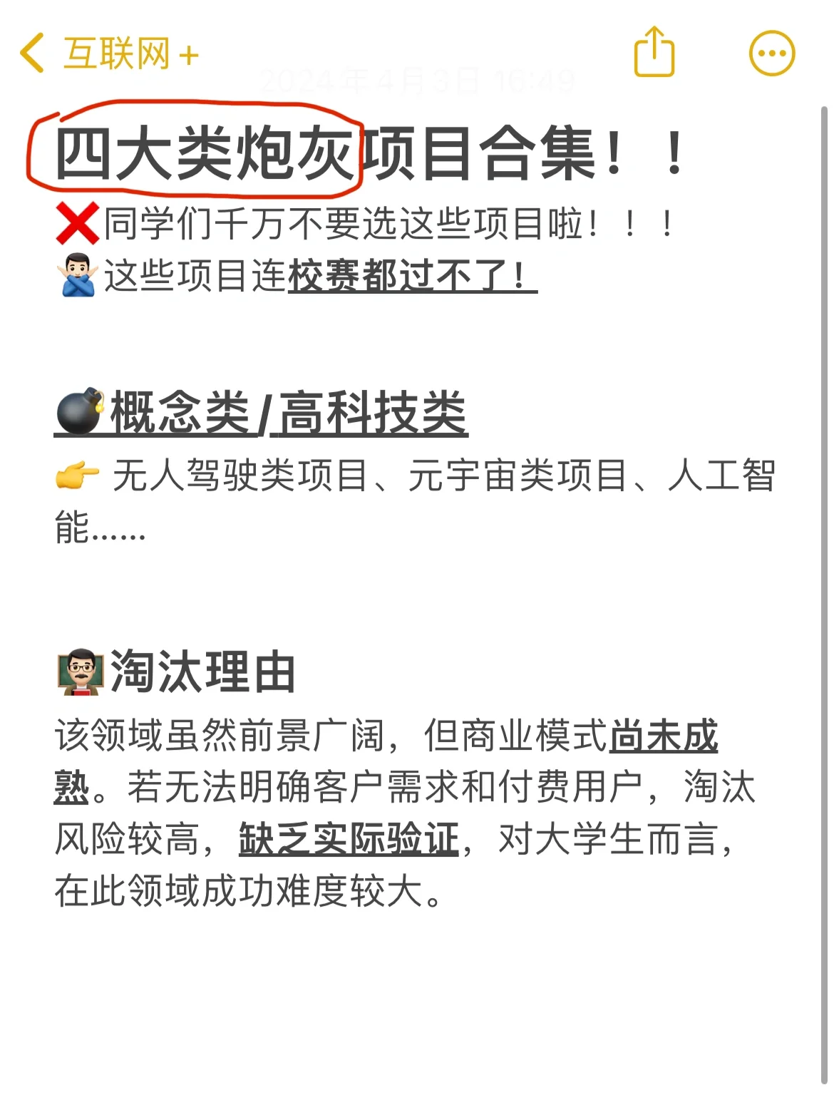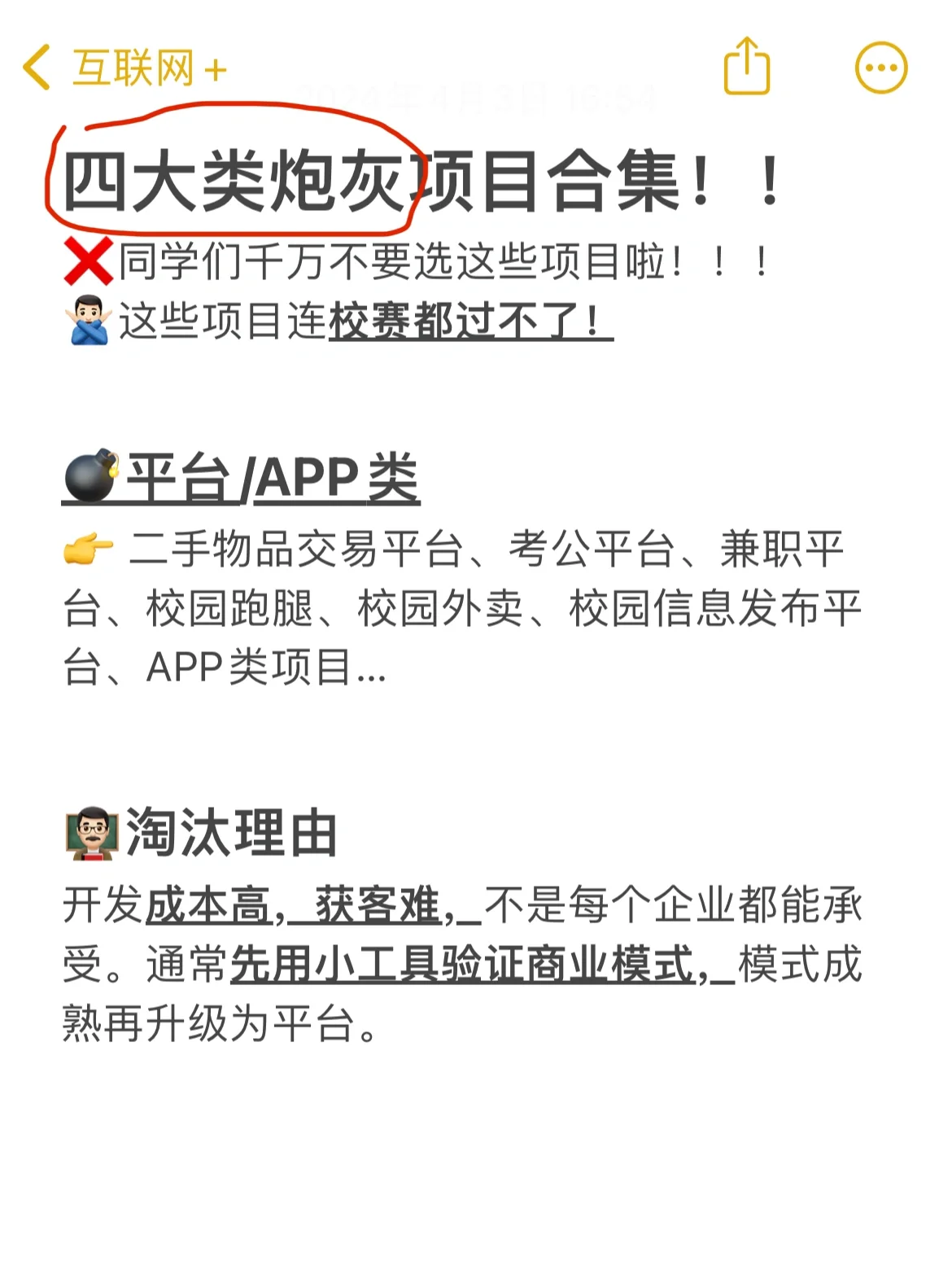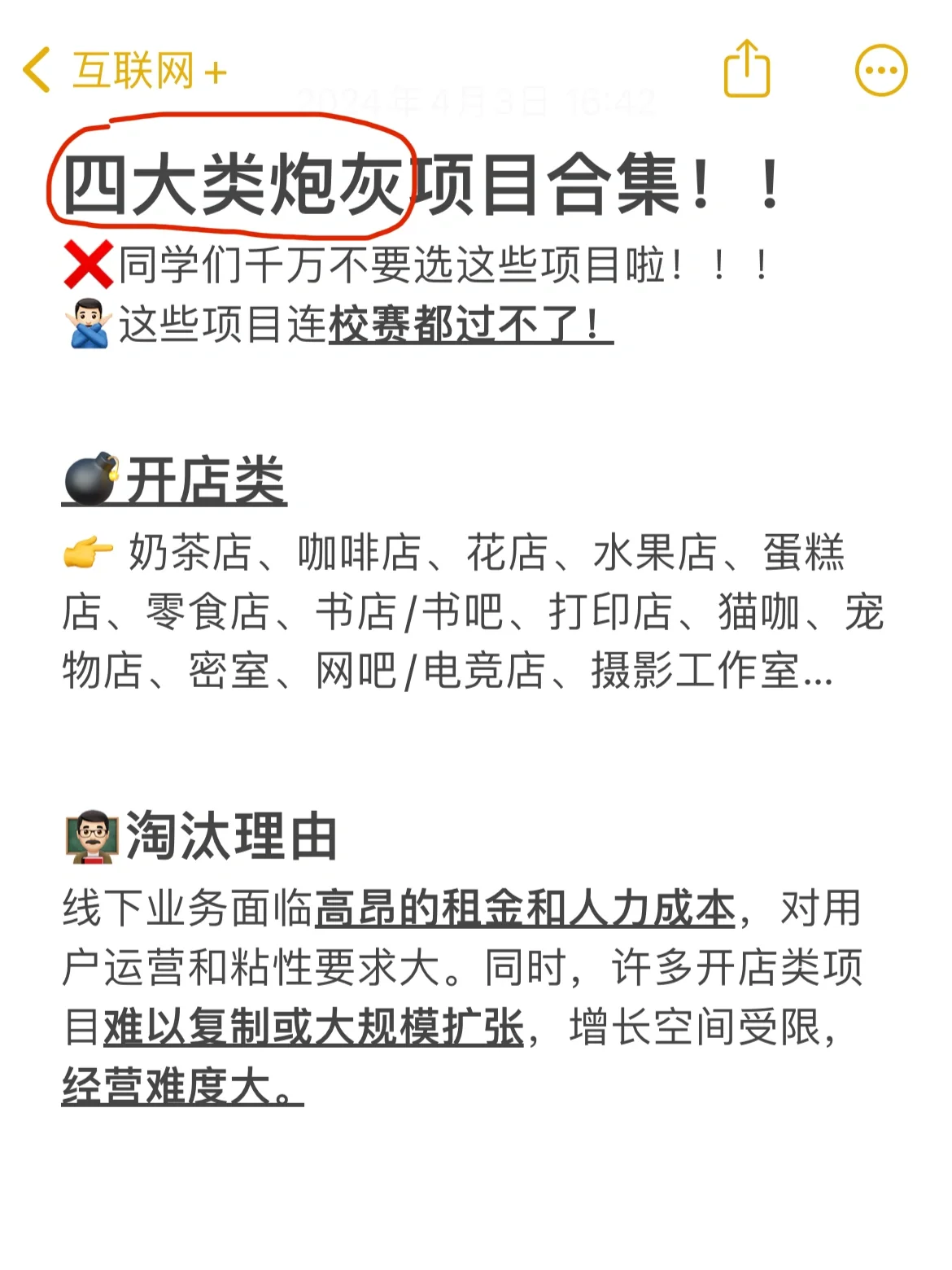 ? 你被招募参加四大类炮灰项目了吗 ? 开店类别 ? 你知道这些看似迷人的实体店背后隐藏的风险吗高昂的租金和人工成本令人窒息,更不用说用户粘性和运营了。想开一家分店吗那就更难了!♀ ? 概念/高科技 ? 自动驾驶Metaverse这些看似高端的项目真的适合我们吗尽管前景看起来充满希望,但现实是残酷的。商业模式不成熟,客户需求不明确,付费用户很少。对于我们这些还在校园里的人来说,成功的几率实在太低了。♂ ? 平台/APP类 ? 二手交易平台公共考试平台这些应用程序听起来很有用,但你想过它们背后的艰辛吗高昂的开发成本和难以获得的客户使它不是每个团队都能负担得起的。很多时候,在模式成熟之前,它就已经挂起了。♀ ? 共享类 ? 共享单车共享书房共享经济已经流行了这么多年,但有多少人幸存了下来同质化是严重的,简单地复制他人的模式。想在这个领域取得成功吗因此,您需要仔细思考如何提供差异化服务!♂ ? 同学们!在选择项目时,不要盲目跟风,更不要被表面光泽度所误导。要想成功,你必须找到自己的特点和优势,努力做好每一个细节!来吧 ? 此外,这位大四学生还组织了准备过程中使用的材料 一揽子计划,包括近四年来近60个省级和国家级获奖案例(提案+PowerPoint),以及视频课程和其他材料。建议第一次参加的人仔细学习,我相信这会对你有所帮助。 ?