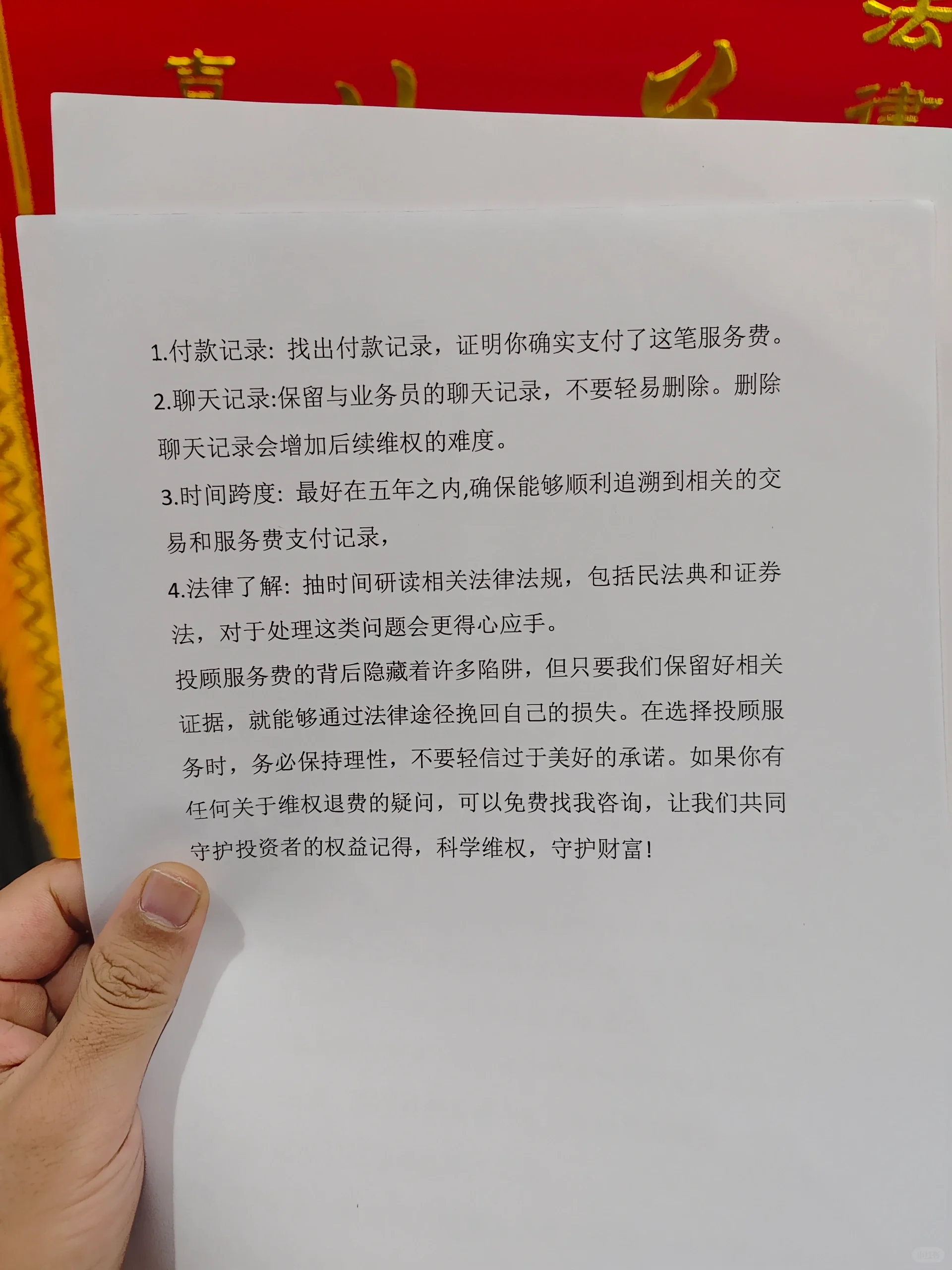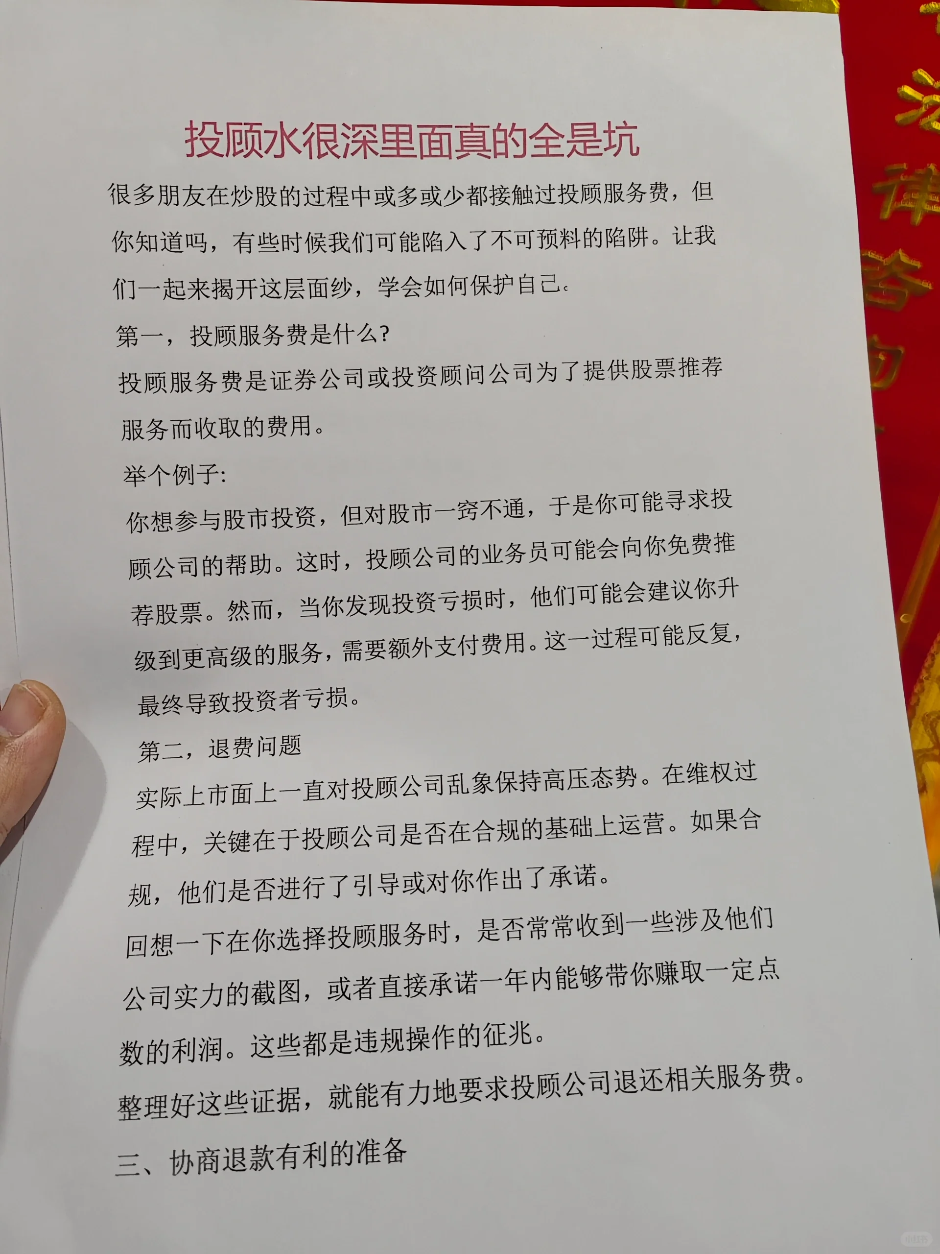 股票咨询骗局通常涉及非法投资咨询公司或个人,通过虚假广告、夸大回报和其他方式诱导投资者支付高昂的服务费或会员费。以下是一些识别和预防此类骗局的方法: 1.【右R】警惕虚假广告【握拳R】:合法的投顾服务不会保证固定的投资回报,也不会使用“荐股专家”或“内幕信息”等字眼来吸引投资者。 2.【失望R】资格验证【汗水R】:在接受任何投资顾问服务之前,首先要验证对方是否拥有合法的投资顾问执照。您可以通过相关金融监管机构的官方网站查看他们的资格。 3、【拉脸H】避免高收费【石化R】:正规的投顾服务通常不会收取高费用。如果遇到需要高服务费或会员费的情况,应保持警惕。 4.【跟进H】谨慎参与群聊【如R】:不要相信通过电话或网络吸引你的所谓“荐股群”,因为这些群可能包含大量“水军”,并营造虚假的投资氛围。 5.理性投资:投资者应该保持理性,不要被高回报的承诺所欺骗。他们应该根据自己的研究和判断做出投资决策。 6.了解常见技巧:熟悉投资顾问诈骗的常见案例,如收取不同级别的会员费、销售人员佣金等,有助于及时发现和避免类似情况。 7.保存证据:如果不幸遭遇投顾诈骗,应及时保存交易记录、沟通记录等相关证据,并向警方报案。 8.寻求专业帮助:在投资之前,您可以咨询专业的财务顾问或律师,以获得合法合规的投资建议。 总之,投资市场存在诸多风险,投资者应提高警惕,避免盲目跟风。任何投资建议都应经过独立考虑和仔细评估。同时,一旦发现投资顾问欺诈行为,应立即向警方或相关监管机构报告,以保护其合法权益。