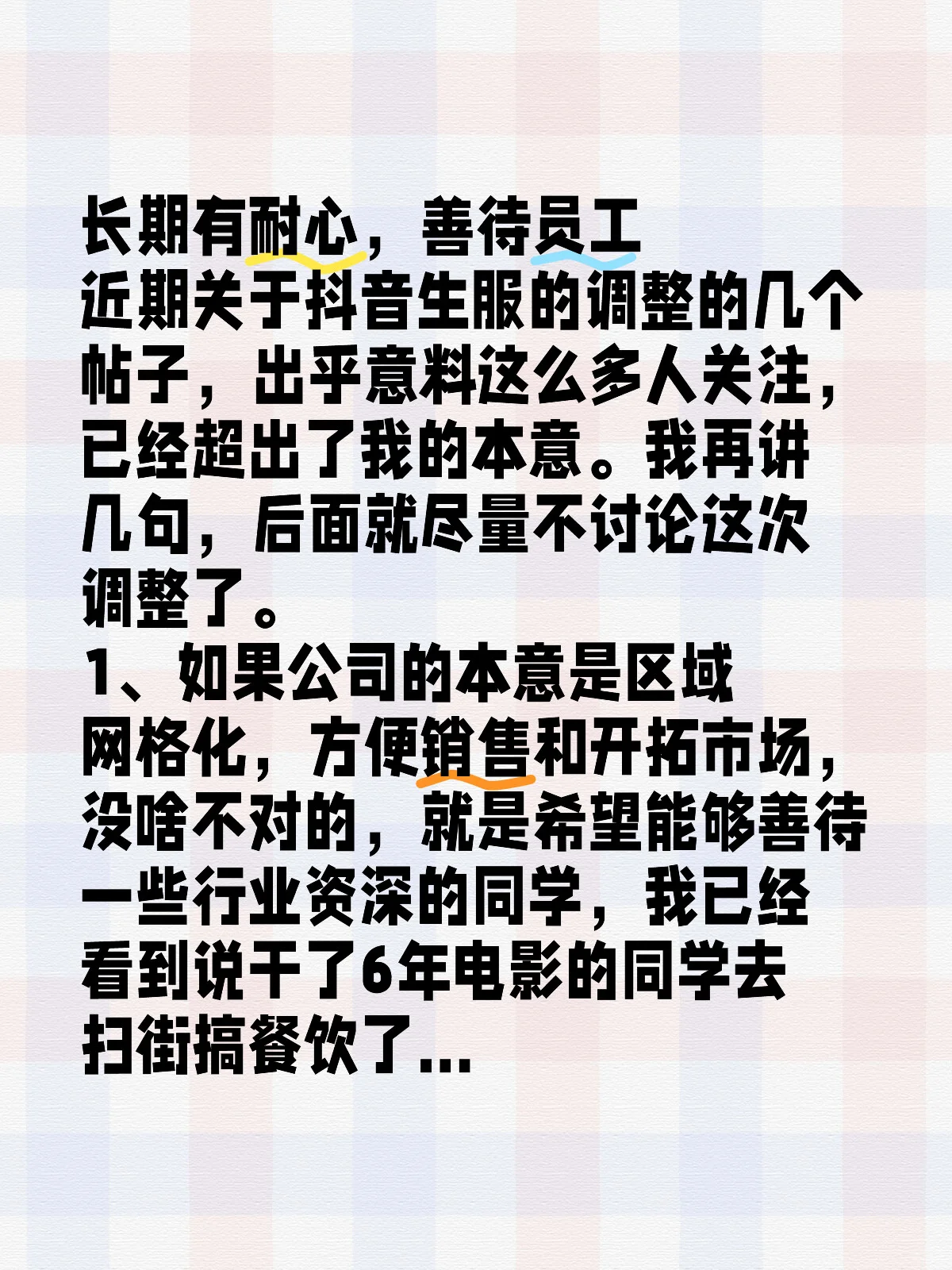 对员工的长期耐心和友善 最近,抖音健康服调整的几个帖子吸引了这么多人,这超出了我的本意。我再多说几句话,以后尽量不讨论这个调整。 1.如果公司的初衷是区域网格,便于销售和市场开发,那就没有错。这是希望能善待业内的一些资深同学。我看到电影从业6年的学生去扫街搞餐饮,酒店从业8年的学生就去扫街做生意。这些学生并非没有能力,但他们用大炮射蚊子的地方不对。你还能认同那些喊着“20万铁饼”的中台运营和销售支持同学,让你去做一个你不擅长的职业,即使你不扫大街 2.佣金制度政策本身并没有错,但需要考虑一开始的板块分配是否公平。一些学生最初分配的家庭规模比其他学生多几百万人。在这种情况下,这不是一个双赢的局面吗即使这只是佣金的千分之一,也足够他吃了。 3、外推说他们没有放弃酒旅,但在这种佣金制度下,没有+1+2愿意从事酒旅。他们一定是去从事短期、快节奏的餐饮整合了。这些酒旅学生原本是以极大的热情从比赛中招募来的,他们也花了很多钱。如果他们现在不这样做,他们将放弃他们卑微的地位。这真的不合适,他们没有考虑到同学们的努力和友谊。九旅本身已经被证明是一个稳定的赚钱现金流,携程即使只经营这家公司,也过着稳定的生活。美团玖旅在一年的时间里也贡献了不少的利润。如果有一天他们想重做,有多少人敢来,因为这伤害了销售学生的心 4.没有人百日无一日好,也没有花百日无红。阿里曾经是中国互联网不可逾越的大山,但现在却被字节、京东和拼多多滥用。昨天蔡崇信发了一篇万字长文,说以用户为中心,其次是员工。他不是也在反思吗如果人工智能技术取得突破,字节跳动未来能承受得住吗我现在看不起的葡萄酒和旅游业是未来的救命稻草吗至少它的利润规模是稳定的,还有提升的空间 5.无论是工业系统还是区域电网系统,都可以增加供应。如何做好哪一条业务线,必须是上层决策的问题。这绝对不是前线员工不作为的问题。但请抖音蒲晏紫看到这些一线员工的难处。我听说盛福的中台有1500人,但是销售只有3500人。如果我们想扩大市场,我们必须增加一线销售的参与感和幸福感,而不是像现在这样抱怨。不缺饥饿的战士,这就是底线@蒲晏紫@张一鸣@@