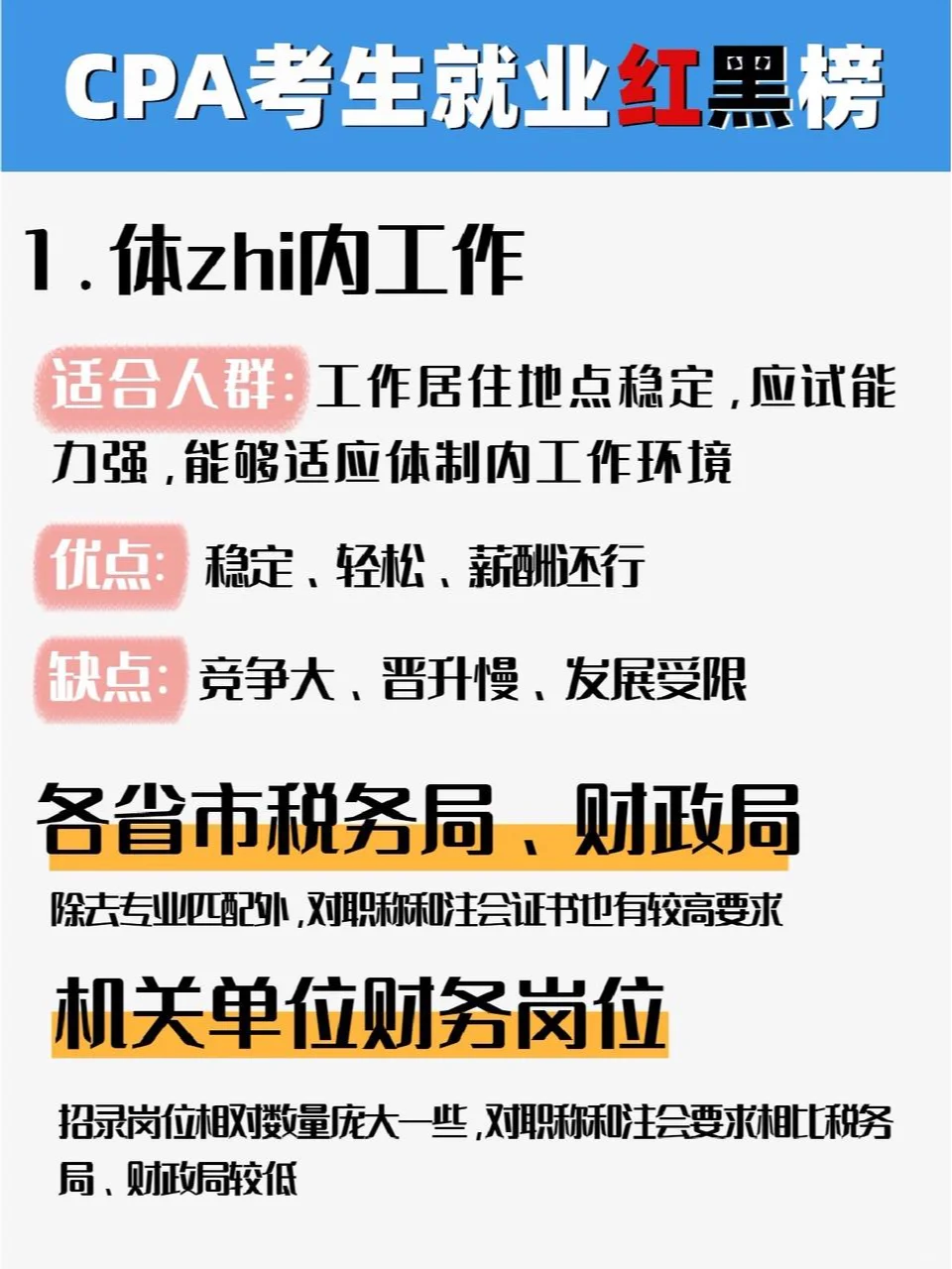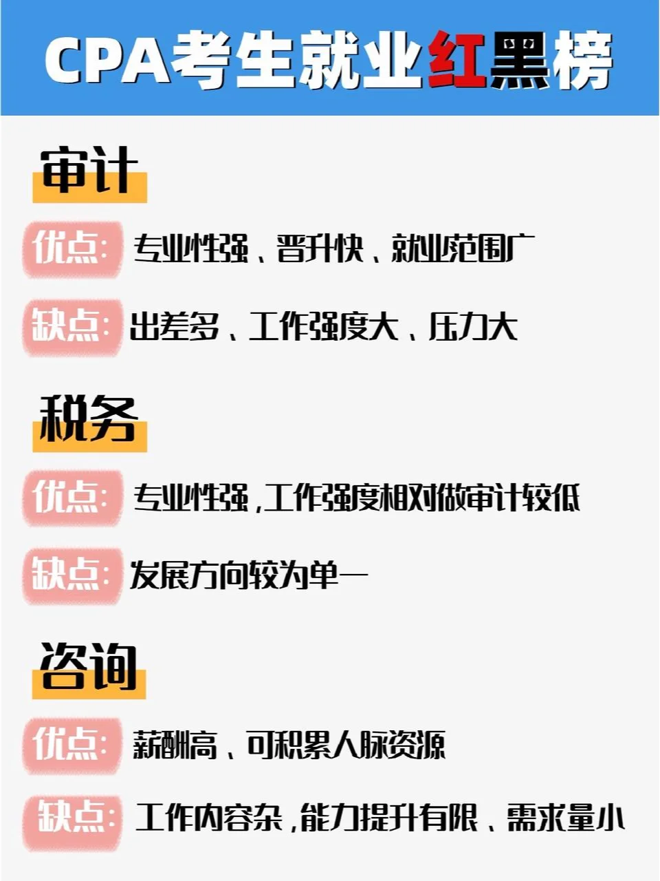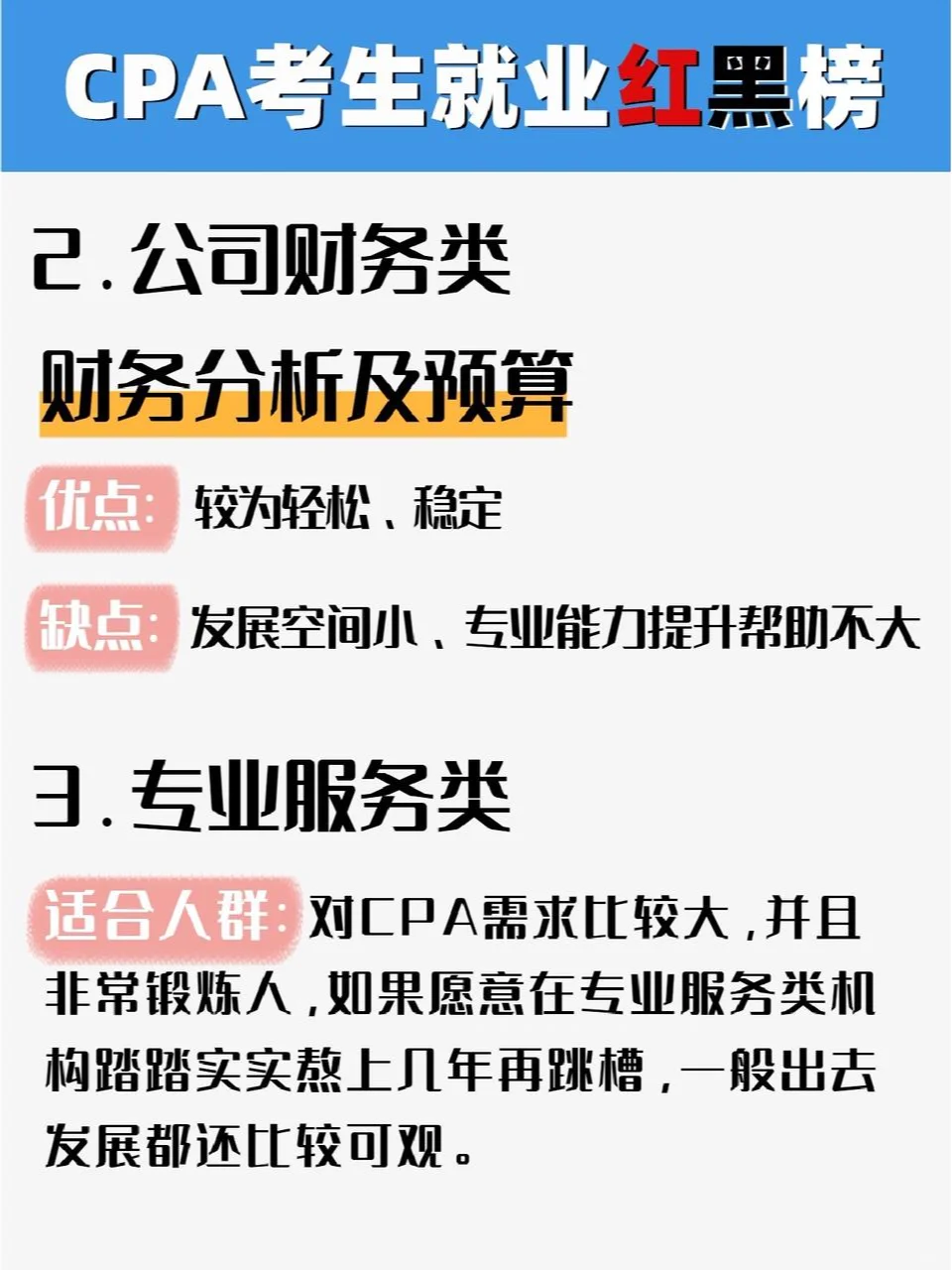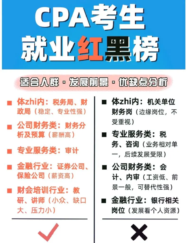 你参加注册会计师考试了吗你周围有人参加注册会计师考试吗你知道吗,即使参加了注册会计师考试,仍然可以找到年薪100万元的工作 ?? CPA不能造神,但它可以为你提供更多的工作机会。今天,我就和大家聊一聊注册会计师的考生在拿到证书或完成一门科目后,离拿到百万元工资还有多远 ?? 建议那些正在准备24年注册会计师考试的人去公共场所,默默地写一本书,邮政保险在家里,学习1小时等于4小时,我能为你提供一些实用的纯干材料吗子寮,我已经介绍了12种治疗强迫症的策略,我认为这些策略质量最好 ? CPA600 Motif ? CPA三色笔记 ? 注册会计师往期考试集锦 ? 注册会计师学习计划 ? 注册会计师会计分录完整收集 ? 注册会计师理财200+公式大全 ? 注册会计师六科考试的前几页 …直接在公众面前,嗖嗖❕ 带注释的备考书❕ 认领它! ?? 我将根据注册会计师候选人的优势和劣势、发展前景、工资和加班强度,为他们创建一份红色和黑色的工作机会清单。欢迎讨论: 什么 红色名单 1.公司财务:财务分析与预算(相对来说,工资相对较高,但需要去大公司做实际工作) 2.专业服务类别:审计(随着时间的推移积累,但培训人员,接触更多的业务,以后跳槽的机会更多) 3、系统内:税务局、财政局相关岗位(轻松稳定,专业性较强,可进入) 4.金融业:与证券和保险公司相关的职位(只要能考就有高薪和担保!) 5、财务会计培训市场:教研、教学师资(高薪、挑战!绝笑等你!) 什么 黑名单 1.公司财务:会计、内部审计(工资低,发展前景有限,可替代性强) 2.专业服务:税务和咨询(业务敞口相对有限,未来发展有限) 3.系统内:政府机构的财务职位(外围职位,无价值) 4.金融业:银行相关职位(基于个人资源的发展) - 当然,在任何职位上都有发展良好和发展不良的人 因此,重要的是要考虑你是否适合这个职位,你是否具备与这个职位相匹配的能力,以及你的价值观和公司文化是否一致。只有考虑到这些因素,你才能快速发展。 每个人也可以自由表达自己的意见,并提供他们对注册会计师红名单和黑名单的看法 #注册会计师#批注准备#小白考批注#批注#注册会计师 评论:发现了一个秘密基地,里面有大量的电子种子、笔记、工具和CPA66,可以默默地把这个芽油写给,在公共领域,请参阅“带注释的考试准备书”