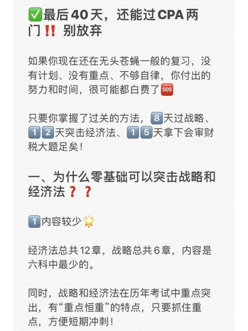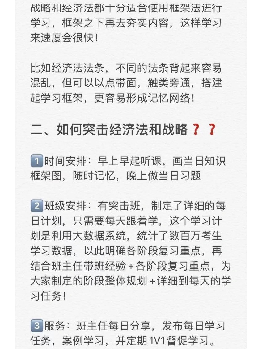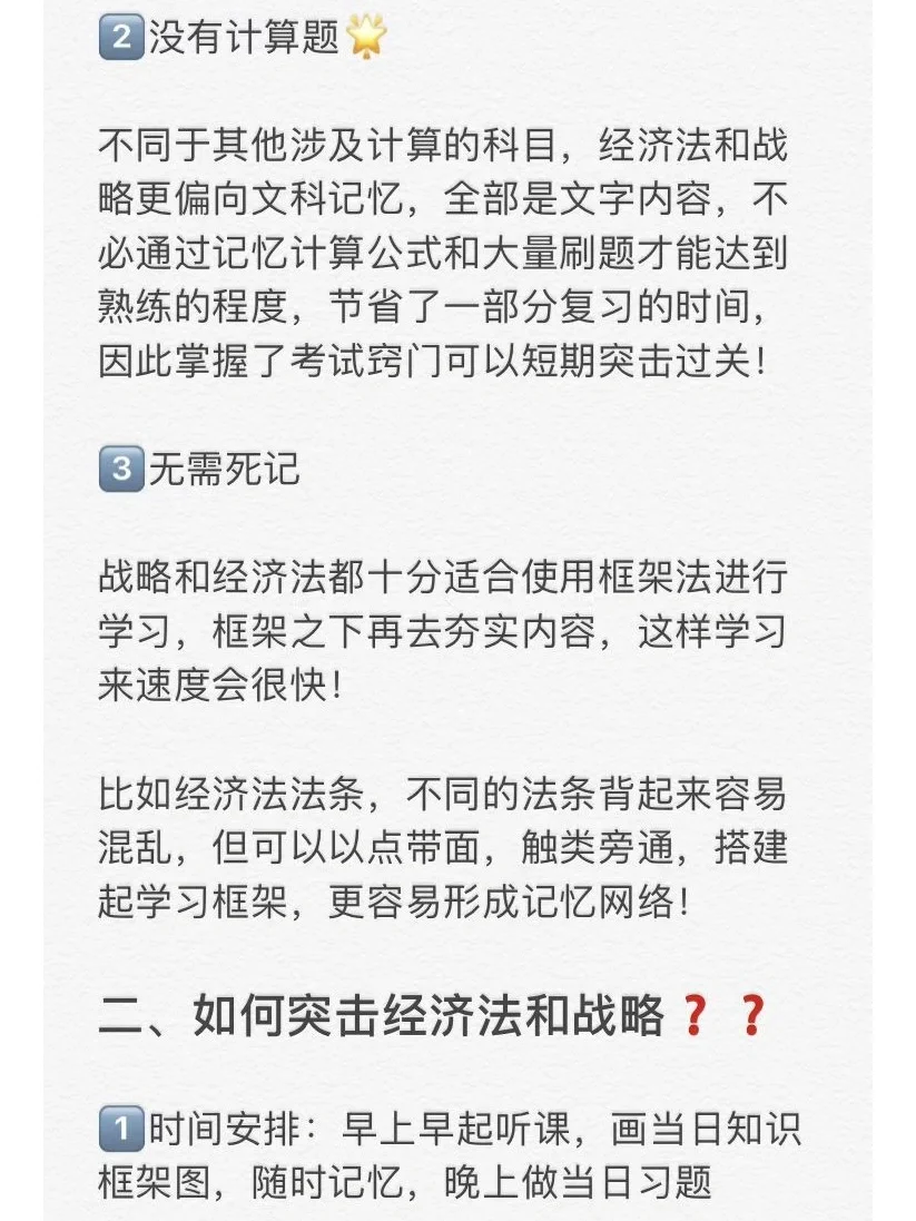 如果你仍然像无头苍蝇一样复习,没有计划,没有专注,没有自律,你的努力和时间很可能是徒劳的 只要你掌握了通关的方法,8️⃣ 天国战略,1️⃣ 二️⃣ Sky Assault经济法,1️⃣ 五️⃣ 这足以让田在财税考试中获胜! 1、 为什么零基础攻击战略与经济法 一️⃣ 内容更少 经济法共12章,战略共6章,是六门学科中内容最少的一门。 同时,战略法和经济法在以往的考试中都得到了强调,具有“不断强调重点”的特点。只要我们抓住了关键点,就很方便进行短期冲刺! 二️⃣ 没有计算问题 与其他涉及计算的科目不同,《经济法与战略》倾向于更多地关注人文记忆,所有这些都是书面内容。不需要记住计算公式和练习大量的问题来达到熟练程度,节省了一些复习时间。因此,掌握考试技巧可以帮助你在短时间内通过考试! 三️⃣ 无需记忆 战略法和经济法都非常适合使用框架法进行学习,然后将内容巩固在框架下会使学习更快! 例如,经济法文章在记忆不同的文章时可能会令人困惑,但它们可以用来通过类比建立学习框架,从而更容易形成记忆网络! 2、 如何冲击经济规律与战略 一️⃣ 时间安排:早上早起听课,绘制当天的知识框架图,随时记忆,晚上做当天的练习 二️⃣ 课堂安排:有一节惊喜课,制定了详细的日常计划,只需要每天学习。该学习计划使用大数据系统收集数百万考生的学习数据,以明确每个阶段的复习重点。结合班主任带班的经验和每个阶段的复习重点,为大家制定了全面的阶段计划和详细的日常学习任务! 三️⃣ 服务:班主任通过1V1进行日常分享,发布日常学习任务、案例研究,并定期监督学习。