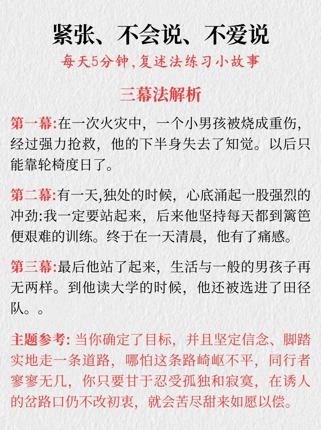 [彩虹R]最近,我的朋友们一直在看我发布的材料,不明白什么是转述 所谓“复述”,就是在阅读材料并理解之后,我们可以讲述故事的大致情节,并添加更多的细节来自己描述,这是合理和合理的。 - 【彩虹R】当我们将一块材料从“口吃”状态转化为“口吃”时,通过持续和深思熟虑的练习,我们的口腔变得越来越有效,达到了有效的训练目标。 - [彩虹R]这个练习可以随时随地进行。 例如,它可以是我提供给每个人的短篇故事复述材料,一种表达思想和训练思维技能的材料,难度越来越大。 - [彩虹R]复述确实有很多好处。它不仅可以积累知识,还可以训练口语和大脑的协调能力,使讲话更加自然流畅。 - [彩虹R]如果你坚持下去,你会看到不同版本的自己,这就是我练习的方式 ~ [彩虹R]你的口才也有问题吗 我会继续更新我的口才培训材料,每个人都想和我一样练习表达技巧。让我们一起加入我们的大家庭。你可以和老师或朋友一起工作。来吧