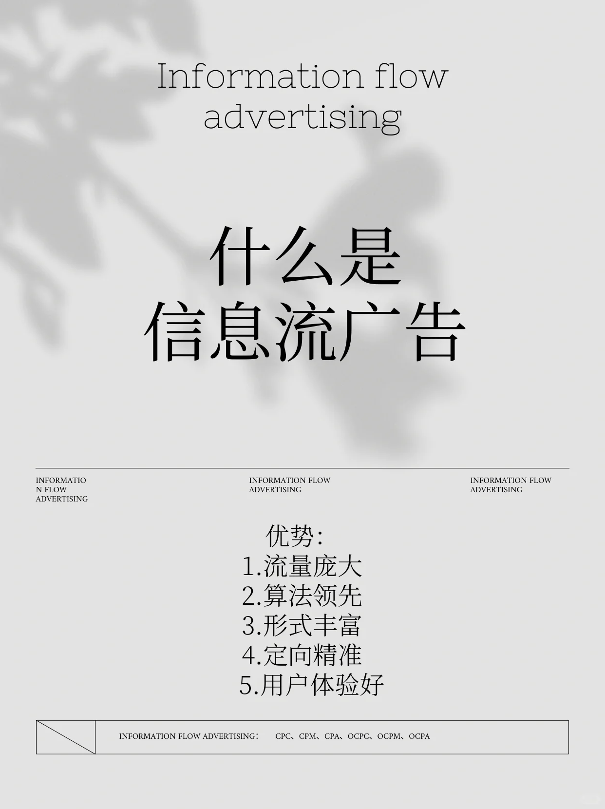 信息流广告是出现在社交媒体用户朋友动态中的广告。信息流广告的特点是个性化投放,可以根据自己的需求通过标签进行投放。 信息流广告依托海量的用户数据和信息流生态系统,能够准确捕捉用户意图,有效减少用户干扰,将广告呈现给目标客户,轻松激发受众主动接受和分享。 顾名思义,信息流广告是指出现在社交媒体用户朋友动态中的广告。它于2006年首次出现在社交媒体巨头脸书上,随后在推特、Pinterest、Instagram和领英等社交媒体平台以及QQ空间、微博和人人网等国内平台上发布了信息流广告。它以一种非常自然的方式集成到用户接收到的信息中,具有很高的用户访问率。 信息流广告的优势:1。大流量2。领先的算法3。丰富的形式4。准确瞄准5。良好的用户体验。通过将大数据和人工智能相结合进行精准广告,无论是品牌曝光度还是有效性都能满足需求。 根据平台的属性,它可以分为社交类、信息类和视频类 定向方式:一般包括自然属性、地理属性、人群属性、自定义属性等 计费方式:CPC、CPM、CPA、OCPC、OCPM、OCPA 效果评价:创意+定位+竞价 信息流广告已经成为媒体平台流量变现的主要模式。从传统巨头到新兴势力,纷纷加入信息流广告大战,如腾讯、阿里、百度、网易、新浪、头条、小米、360、知乎、美柚、哔哩哔哩、快手、抖音、小红书等。 如果你想成为一个精准的广告用户,你可以和我谈谈。把你的广告信息放在全媒体平台上,把你的信息放在主要的自媒体平台上:抖音、快手、微信好友、今日头条、百度、腾讯等
