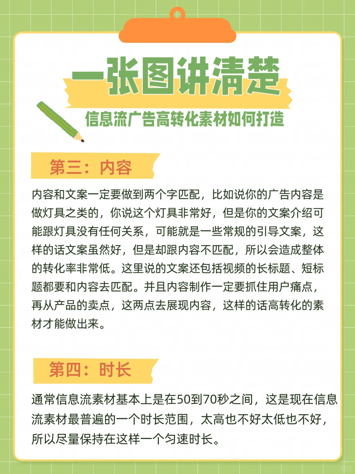 用图片清楚地说明如何为信息流广告创建高转化率的素材! 一⃣ 材料封面: 封面代表视频对用户是否有吸引力,是否点击,所以封面直接影响广告的点击率。 二⃣ 文案: 目前的信息流广告主要以软拷贝为主。如果我们继续使用原始的硬广告,很可能用户对您的产品没有足够的需求和受众。我们必须使用软拷贝来与用户合作,以他的需求为主要驱动力是在当前信息流广告中占有一席之地的必要条件。 三⃣ 所容纳之物 内容和副本必须匹配两个单词,例如,如果你的广告内容是关于照明设备的,你说照明设备很好,但你的文案介绍可能与照明设备没有任何关系,它可能只是一些传统的指导性文案。这样一来,虽然文案不错,但与内容不匹配,导致整体转化率很低。这里提到的副本还包括将视频的长短标题与内容进行匹配。内容制作必须关注用户的痛点,然后从产品的卖点展示内容,这样才能制作出高转化率的素材。 四⃣ 期间 通常,信息流材料需要50到70秒⏱ 在它们之间,这是目前信息流材料最常见的持续时间范围,既不太高也不太低,所以尽量保持这样一个恒定的持续时间。