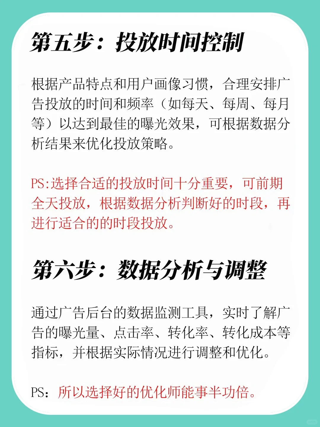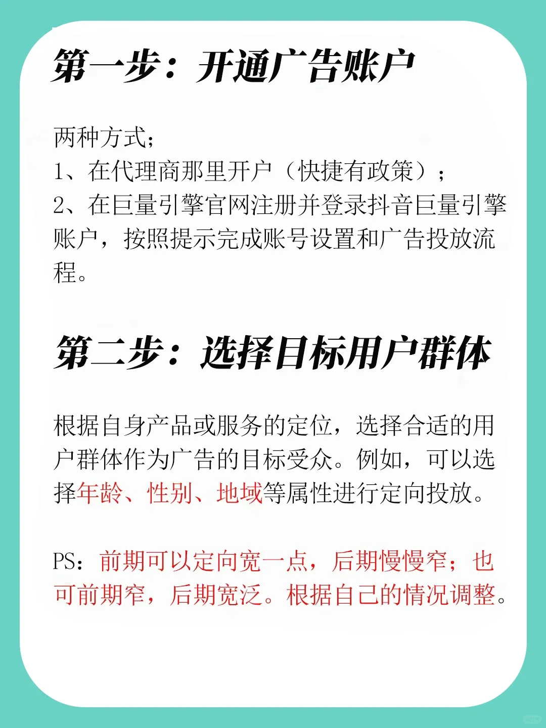 第一步:开通广告账号:(2种方式) ① 在官网注册并登录抖音巨量引擎账号,按照提示完成账号设置和广告投放流程。②在代理人处开立账户(快捷、方便且有好处) 步骤2:选择目标用户组 根据自身产品或服务的定位和发展方向,选择合适的用户群体作为广告的目标受众。例如,可以选择年龄、性别和地区等属性进行定向广告。 PS:在早期,它可以定向得更宽,后期可以逐渐变窄;它也可以在早期阶段是窄的,在后期阶段是宽的。根据自己的情况进行调整。 第三步:制作广告材料 创建一个广告视频和登录页,突出产品的独特卖点和优势,并激发用户对您的品牌的兴趣。同时,注意遵守抖音的广告政策,避免违规。 附言:保证和偏激的言辞容易被侵犯,请避免使用。 步骤4:定价和预算管理 设定合理的广告价格和预算,以确保合理的投入产出比和成本覆盖率。它可以根据市场状况和广告效果进行调整 附言:最初的出价相对较高,但在降低出价之前,会根据运行量逐步优化。你也可以进行分级出价。 步骤5:控制放置时间和频率 根据产品特点和用户习惯,合理安排投放广告的时间和频率(如每天、每周、每月等),以达到最佳的曝光效果。您可以参考数据分析结果来优化广告策略。 PS:选择合适的广告时间至关重要,因为在早期阶段可以全天进行。根据数据分析,确定适当的时间段,然后进行适当的广告宣传。 步骤6:数据分析和调整 通过使用广告投放的数据监控工具,可以实时了解广告曝光率、点击率、转化率、转化成本等指标,并根据实际情况进行调整和优化。