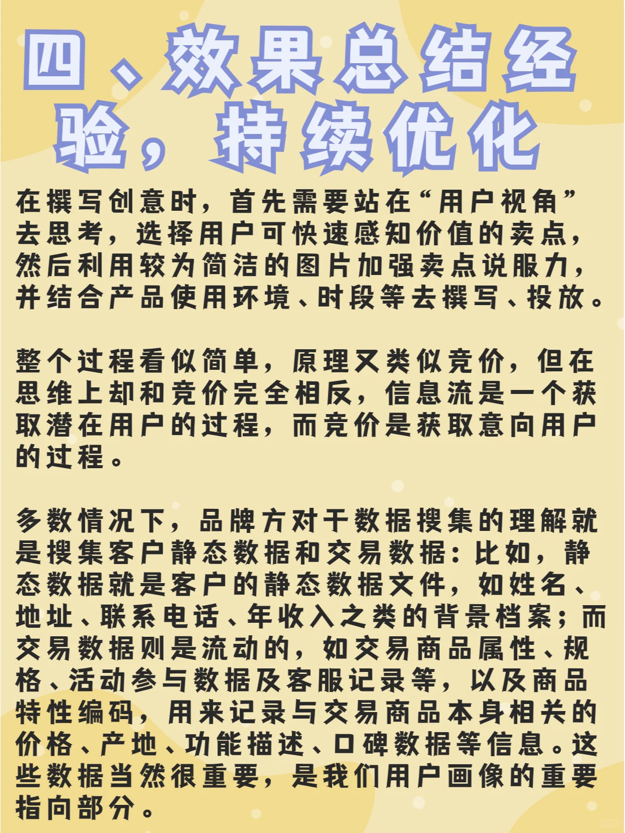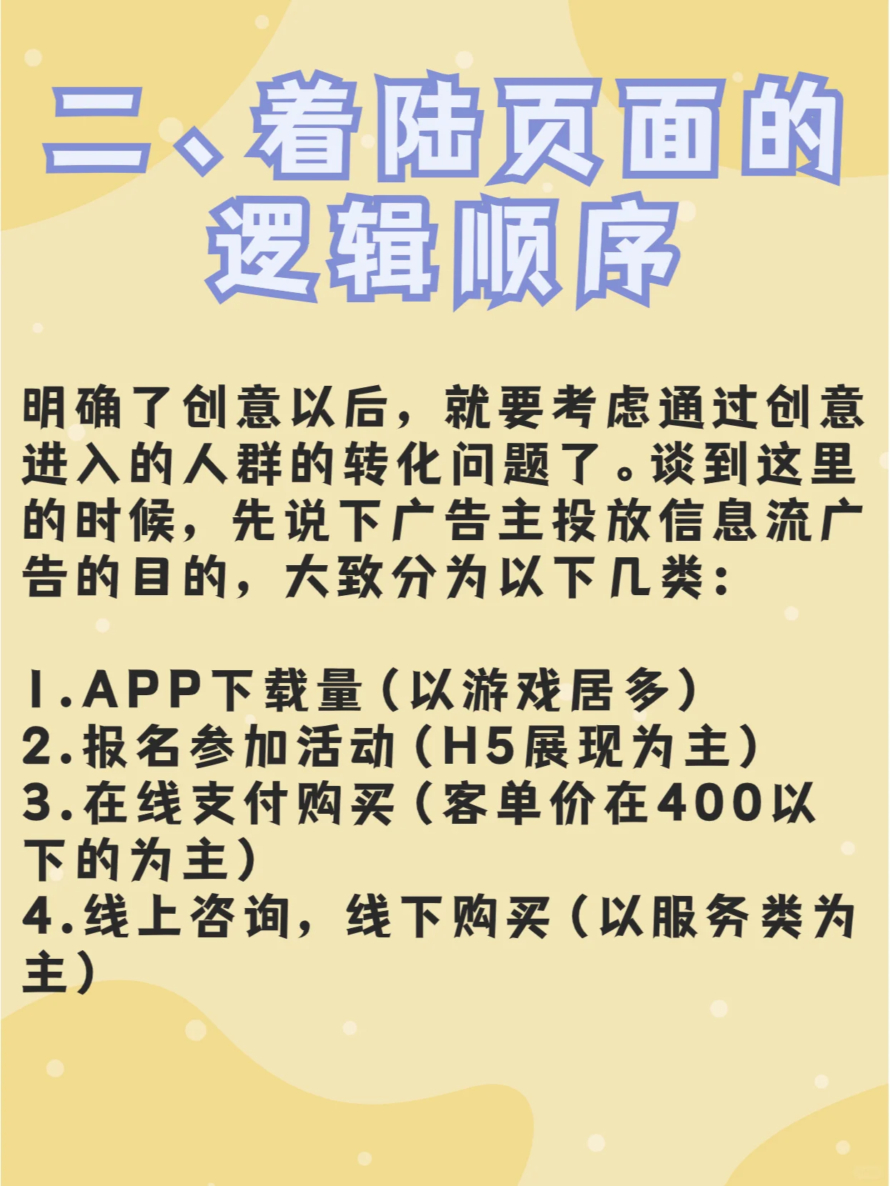 随着互联网的发展,信息时代已经到来,信息流广告逐渐获得了许多广告商的青睐。经过各种信息流平台的大数据计算,我们将想法推送给用户。他们点击创意标题到达登陆页,最后通过在线客服、电话或表格留下客户线索,这是我们在信息流广告中经历的过程。 1、 目标群体需求分析: 阐明信息流广告的特征及其如何实现转化是很重要的。例如,在大型超市购物时,很少会简单地购买你在超市订购的商品,然后付款。你总是会被货架上的其他商品所吸引,并产生购买的欲望。我通常喜欢把超出额外购买的东西称为情感消费。 事实上,广告在信息流中的转换也是为了让消费者在阅读新闻视频和其他信息时关注你的产品,从而进行情感消费。因此,在进行目标群体分析时,需要回答以下问题: 我的产品(服务)为用户解决了哪些痛点 为什么用户会关注我的产品(服务) 我的产品(服务)在什么情况下最适合应用 用户对我的产品(服务)的首选解决方案是什么 用户的人口统计档案是什么 6.用户在发声时容易接受什么样的角色 2、 登录页的逻辑顺序: 在明确了创造力之后,有必要考虑通过创造力进入的观众的转化。说到这里,我们先来谈谈广告主投放信息流广告的目的,大致可以分为以下几类: 1.APP下载(多为游戏) 2.报名参加活动(以H5演示为主) 3.网上支付购买(主要针对单价在400以下的订单) 4.线上咨询、线下购买(以服务为主) 除了应用程序下载的数量外,其他三个都需要在登录页上展示足够的逻辑。毕竟,用户的访问时间越长,跳出率就越低,实现广告商目标的可能性就越大。 3、 促销数据跟踪 白银流出后,还没有到享受利益的阶段。操作员无法入睡的真实时间才刚刚开始。选择我认为合适的统计工具,我通常使用统计数据来跟踪转换。按照事件转换的标准记录每个付费链接。通过再次回顾热图,我们可以了解一开始设置的每个转换按钮是否能够达到相应的目的。 4、 总结有效性经验并不断优化 在撰写创意时,首先要从“用户角度”思考,选择用户能够快速感知价值的卖点,然后使用简洁的图像来加强卖点的说服力,并结合产品使用环境、时间段等进行写作和广告宣传。 整个过程可能看起来很简单,原理与投标相似,但在思维上,它与投标完全相反。信息流是获取潜在用户的过程,而竞价是获取意向用户的过程。