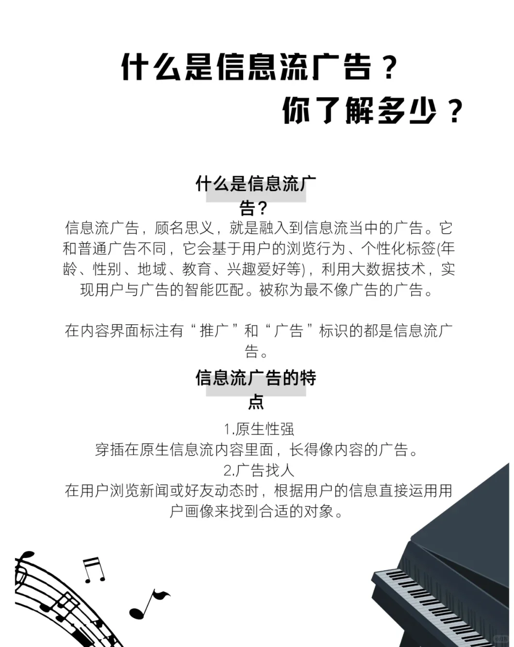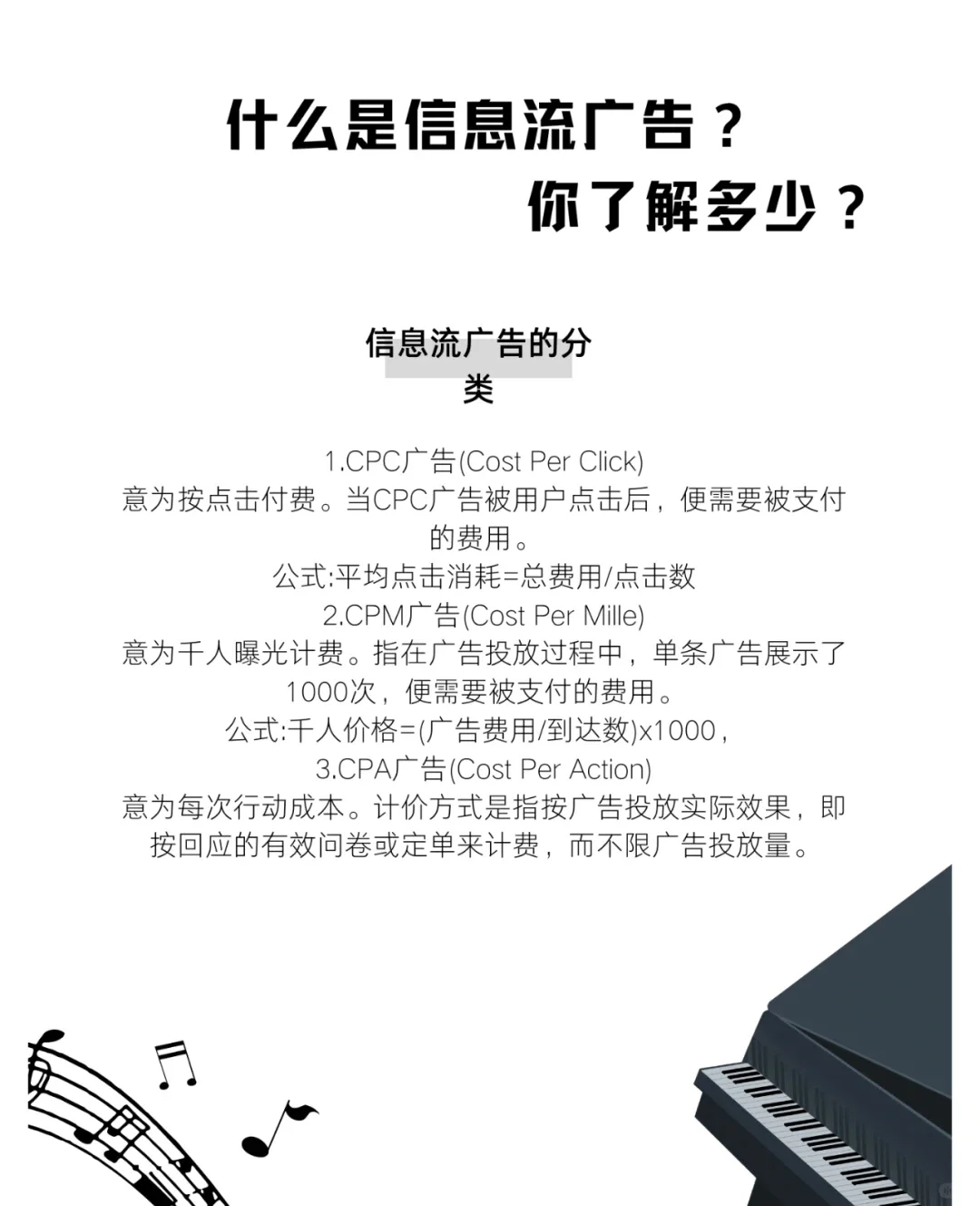 什么是信息流广告干货共享 你好亲爱的孩子们,我们在本期分享的是:什么是信息流广告那些你还不懂的宝贝,赶紧收藏起来吧!什么是信息流广告 信息流广告,顾名思义,就是一种融入信息流的广告。它与常规广告的不同之处在于,它利用大数据技术,根据用户浏览行为、个性化标签(年龄、性别、地区、教育程度、兴趣等),实现用户与广告的智能匹配。被称为最不像广告的广告。信息流广告的特点: 1.独创性强 散布在本机信息流中的广告内容看起来像内容。 2.寻人广告 当用户浏览新闻或社交更新时,他们可以直接使用用户档案根据自己的信息找到合适的对象。 信息流广告的分类 1.CPC广告(每次点击成本) 这意味着按点击付费。用户点击CPC广告时需要支付的费用。 公式:平均点击量=总成本/点击量 2.CPM广告(每百万成本) 这意味着向成千上万的人收费。单个广告在广告过程中显示1000次所需支付的费用。公式:千人价格=(广告费/到达人数)x1000, 3.注册会计师广告(每次行动的成本) 这意味着每项行动的成本。定价方法是指广告投放的实际效果。