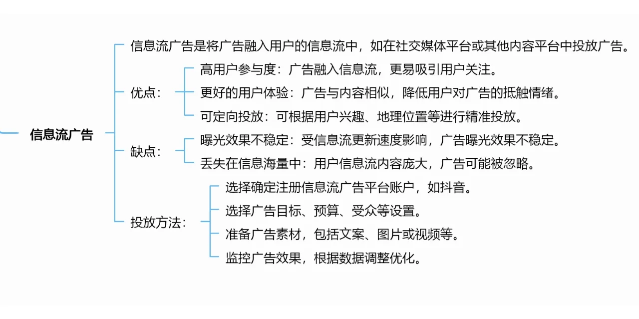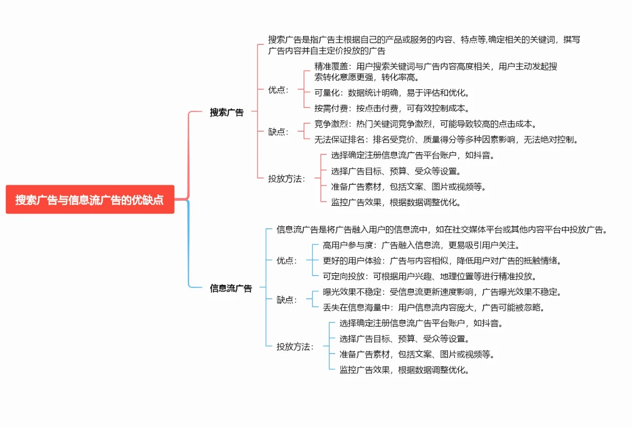 1、 搜索广告 搜索广告是指广告主根据其产品或服务的内容、特点等确定相关关键词,撰写广告内容,自主定价投放的广告 优势: 准确覆盖:用户搜索关键词与广告内容高度相关,用户发起搜索转化的意愿更强,转化率高。 可量化:数据统计清晰,易于评估和优化。 按需付费:点击付费可以有效控制成本。 缺点: 竞争激烈:热门关键词竞争激烈,这可能会导致更高的点击成本。 无法保证排名:排名受投标、质量分数等多种因素的影响,不能绝对控制。 2、 信息流广告 信息流广告是将广告整合到用户的信息流中,例如在社交媒体平台或其他内容平台上投放广告。 优势: 高用户参与度:广告融入信息流,更容易吸引用户注意力。 更好的用户体验:广告与内容相似,减少了用户对广告的抵制。 定向投放:可以根据用户兴趣、地理位置等进行精准投放。 缺点: 曝光效果不稳定:由于信息流更新的速度,广告曝光效果不稳定性。 迷失在海量信息中:用户信息流包含大量内容,广告可能被忽视。