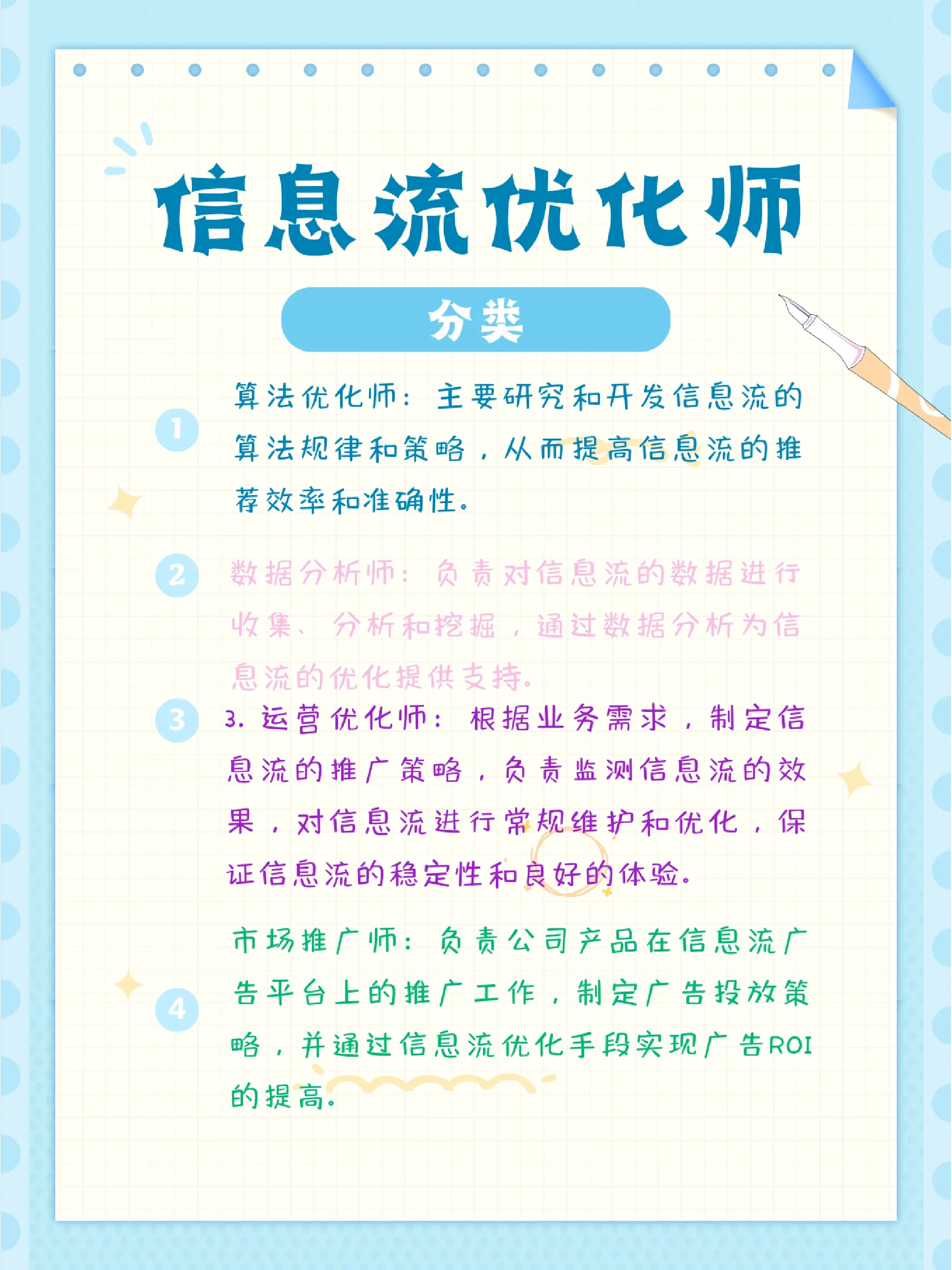 3.运营优化工程师:根据业务需求,制定信息流的推广策略,负责监控信息流的有效性,对信息流进行日常维护和优化,确保信息流的稳定性和良好体验。