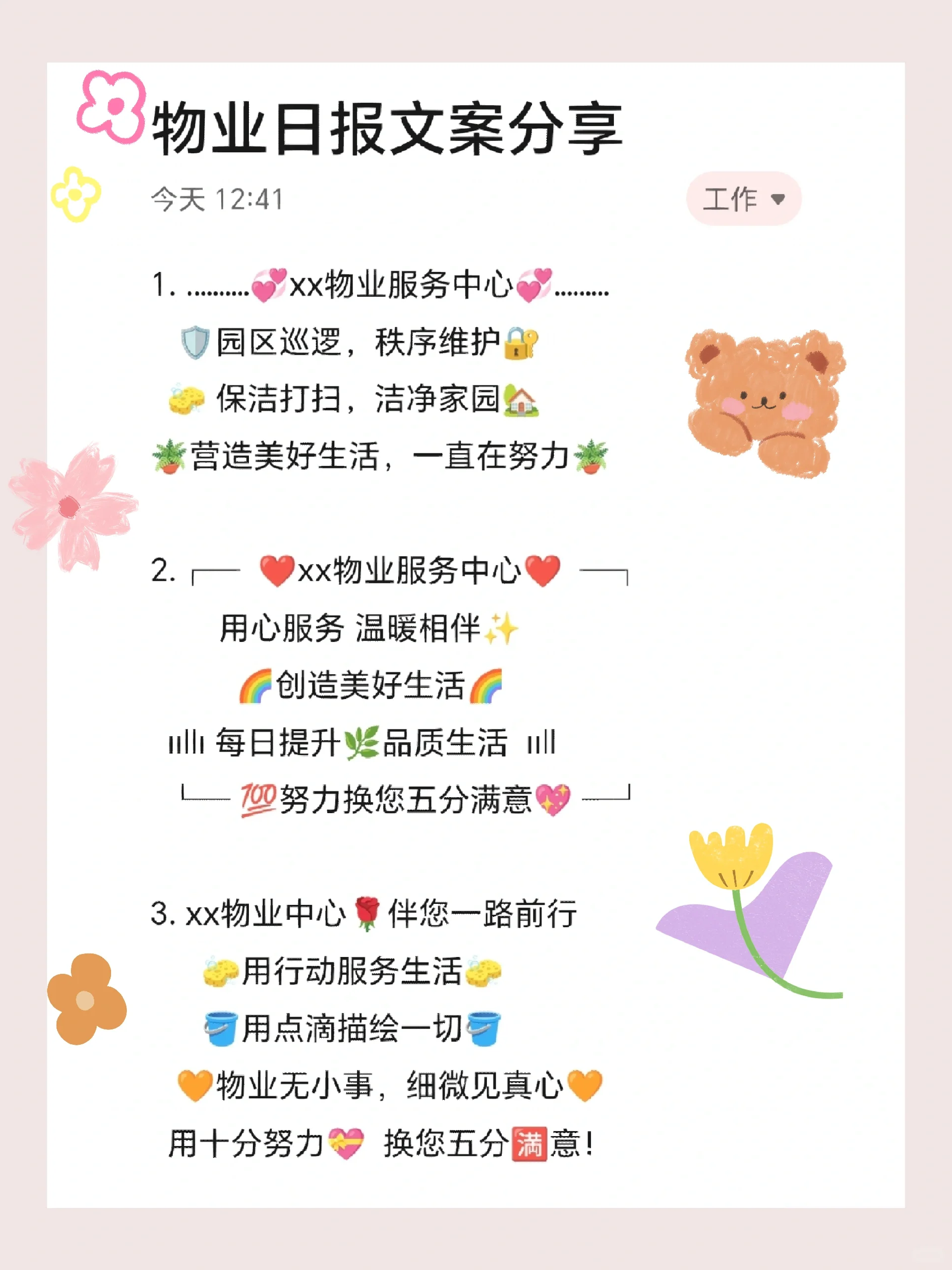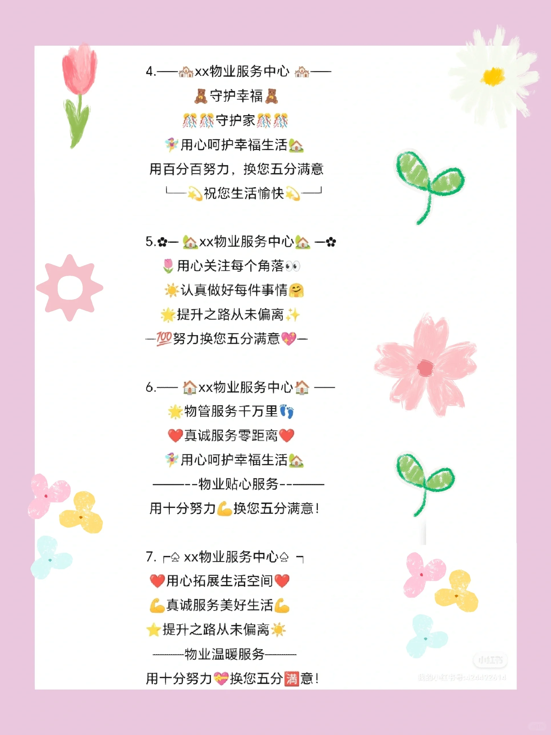 星期一 ? XX物业服务中心 ? 公园巡逻和秩序维护 ? 打扫卫生,打扫家里 ? 创造美好生活,不断奋斗 星期二 ǐ - ️ XX物业服务中心️ - 专注的服务,温馨的陪伴✨ ? 创造更好的生活 ııLlı日常改进生活质量ııLl L努力工作让你满意五分-┘ 星期三 XX物业中心陪你一路前行 ? 用行动服务生命 ? 用小水滴描述一切 ? 物业管理无小事,小细节显诚意 付出了巨大的努力你得了五分易! 星期四 ——? XX物业服务中心:---- ? 守护幸福 ?? 守护者之家 ? ♀️ 用心呵护幸福生活 只要付出100%的努力,你就会满意5% L祝你生活幸福-┘ 星期五 ✿ -? XX物业服务中心✿ ? 小心地密切关注每一个角落 ☀️ 认真对待每一项任务并做好它 ? 改进的道路从未偏离✨ -? 努力为您赢得五分的满意度 星期六 ——? XX物业服务中心---- ? 物业管理服务覆盖千里 ️ 零距离真诚服务️ ? ♀️ 用心呵护幸福生活 ------物业关爱服务——------ 付出了巨大的努力你满意五分! 星期日 XX店物业服务中心 ️ 用心拓展生活空间️ ? 真诚服务,共创美好生活 改进的道路从未偏离☀️ -----物业温馨服务----- 付出了巨大的努力你得了五分易!