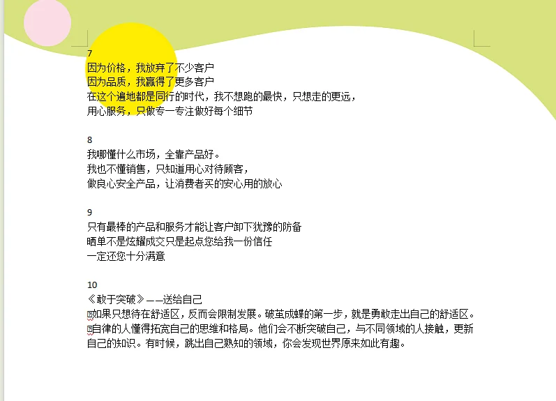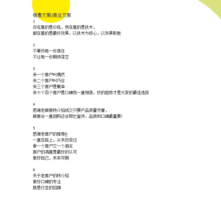 你关心的是价格,我关心的是技术, 我们都关心的是最终效果,以技术为核心,以效果为制胜因素 二 不辜负每一个信任 不让每一个期望落空 三 一位名叫意外的客户 有两个客户叫巧琪 很可能有三个客户 我一直相信,拥有十个或一百个客户是每个人的最佳选择,好的趋势是最好的选择 四 感谢我们的忠实客户的推荐和交易。只要产品质量可靠, 客户会不断回购并帮助推广,质量和信誉才是最重要的! 五 感谢我们的忠实客户的推荐 永远在路上,从未改变 做客户,交朋友 客户满意是最好的认可 做你自己,未来充满希望 六 关于老客户的介绍 注重提高口碑 这是走路的标志 七 因为价格的原因,我放弃了很多客户 因为质量,我赢得了更多的客户 在这个同龄人无处不在的时代,我不想跑得最快,我只想走得更远, 专注服务,专注每一个细节 八 我不了解任何市场,这完全取决于产品的质量。 我也不懂销售,我只知道如何用心对待客户, 做良心安全的产品,让消费者安心购买、安心使用 九 只有最好的产品和服务才能帮助客户摆脱犹豫不决的防御 发布订单并不是为了炫耀交易,这只是一个起点。给我一种信任感 我相信你对此非常满意 十 敢于突破-给予自己 如果你只想呆在舒适区,这实际上会限制你的发展。成为蝴蝶的第一步是勇敢地走出自己的舒适区。 自律的人知道如何拓宽自己的思维和结构。他们会不断突破自我,与不同领域的人互动,更新自己的知识。有时候,走出你熟悉的领域,你会发现这个世界如此有趣。 什么我是陈可可,周一至周六更新分享 祝大家交易愉快