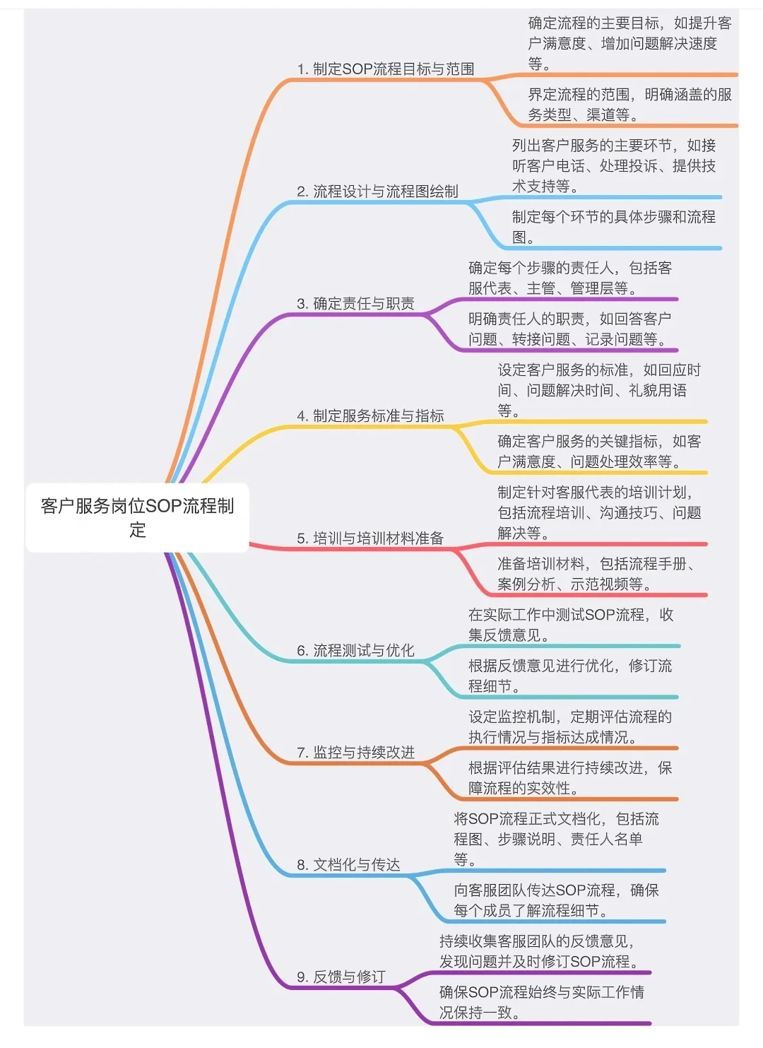 5个步骤,轻松建立高效的客户服务SOP流程! 今天我想和大家谈谈如何在客服岗位上建立高效的SOP流程!随着公司业务的发展,建立SOP流程变得尤为重要,以确保每个客户都能享受到一致和高质量的服务。别担心,跟着我一步一个脚印,让您的客服团队成为服务明星! 1.设定目标和范围 首先,明确制定SOP的目标很重要吗是为了提高客户满意度还是加快解决问题的速度接下来,定义SOP涵盖的范围并确定服务类型、渠道等。这一步骤是制定SOP的基石,必须仔细考虑! 2.设计过程及流程图 不同的服务流程需要不同的步骤,如接听电话、处理投诉、提供技术支持等。将这些步骤细化为清晰的步骤,并用流程图直观地呈现出来,将使流程更易于理解和执行。 3.明确分工和职责 每个步骤都需要一个负责人,可能是客户服务代表、主管或管理层。明确责任人的责任、如何回答客户问题、如何转移问题等,有助于确保每一步都得到妥善处理。 4.制定服务标准和指标 为了确保一致性,制定明确的服务标准至关重要。反应时间、解决问题的时间、礼貌用语等都可以作为标准。同时,制定客户满意度和解决问题效率等关键指标有助于评估流程的有效性。 5.培训和持续改进 制定SOP后,制定培训计划,准备培训材料,确保每位客服代表理解并掌握SOP。在实际工作中,持续监控流程的执行情况,收集反馈,根据反馈进行优化和改进,并确保流程始终保持高效。 无论是小团队还是大企业,全面的客户服务SOP流程都能给客户带来更好的体验,也能提高团队效率。现在就开始开发您的SOP,让您的客服团队成为用户心中的VIP! 我希望这些小技巧对你有帮助!如果你有任何问题或经验要分享,别忘了在评论区与我互动!携手合作,提供更好的客户服务!