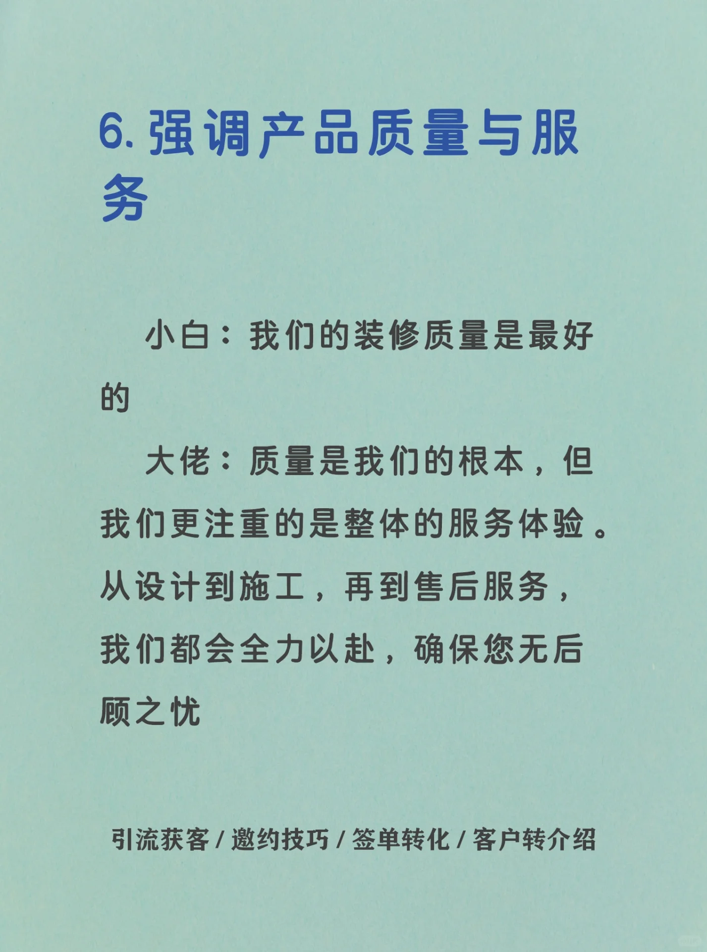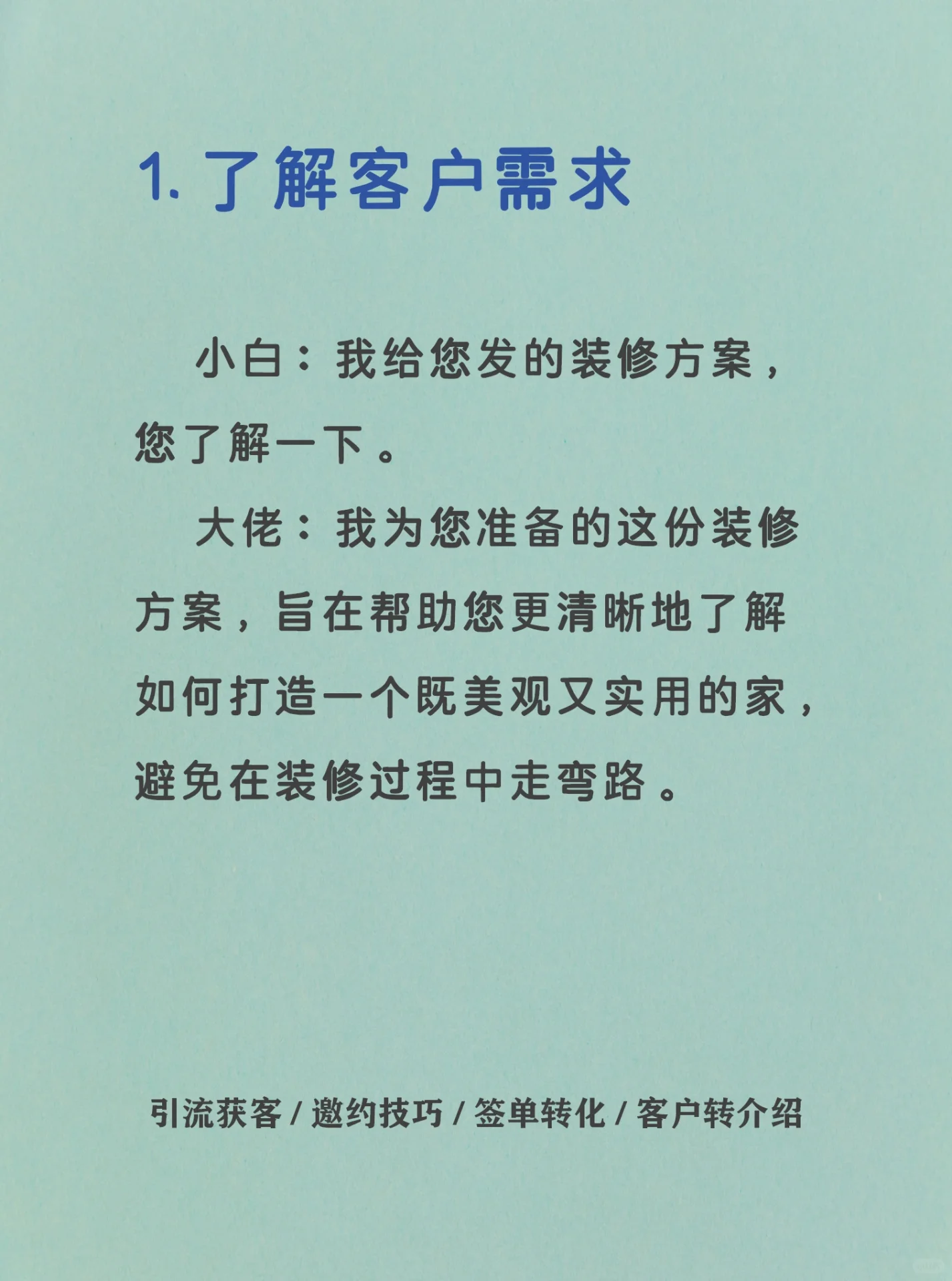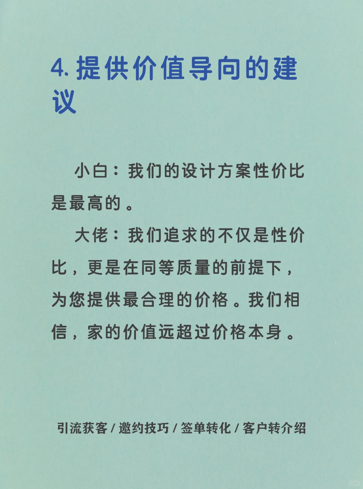 家装谈判秘诀:无私回复脚本,打造温馨家居新体验 1.深入了解客户需求 -小白:我给你发了一个装修方案,请你看一下。 -老板:我为您准备的装修方案旨在帮助您更清楚地了解如何打造一个既美观又实用的家,避免在装修过程中走弯路。 2.建立信任关系 -小白:我非常期待你的回复。 -老板:我也期待与您进一步沟通,了解您对家的想法和需求,以便我们共同创造一个理想的居住环境。 3.强调个性化服务 -小白:我觉得我们的设计方案非常适合你。 -老板:我知道每个客户的需求都是独一无二的,我们的设计解决方案旨在满足您的个性化需求,确保您的家不仅满足您的期望,还带来惊喜。 4.提供价值导向的建议 -小白:我们的设计方案性价比最高。 -老板:我们追求的不仅仅是性价比,而是在同等质量的前提下,为您提供最合理的价格。我们认为房子的价值远远超过价格本身。 5.指导客户决策 -怀特:你看重哪种设计方案 -老板:你对选择有点犹豫吗我可以帮助您分析每种解决方案的优缺点,以便您更清楚地了解自己的需求,并做出最适合自己的选择。 6.强调产品质量和服务 -小白:我们的装修质量是最好的。 -老板:质量是我们的基础,但我们更看重的是整体服务体验。从设计到施工,再到售后服务,我们将尽最大努力确保您无后顾之忧。 7.在定价问题上要诚实 -小白:我们的报价真的是最低的。 -老板:我们知道价格是您考虑的重要因素之一。请相信我们的目标是为您提供最大的价值,而不仅仅是追求低价。我们的报价基于高质量的材料和服务,以确保您的投资是值得的。