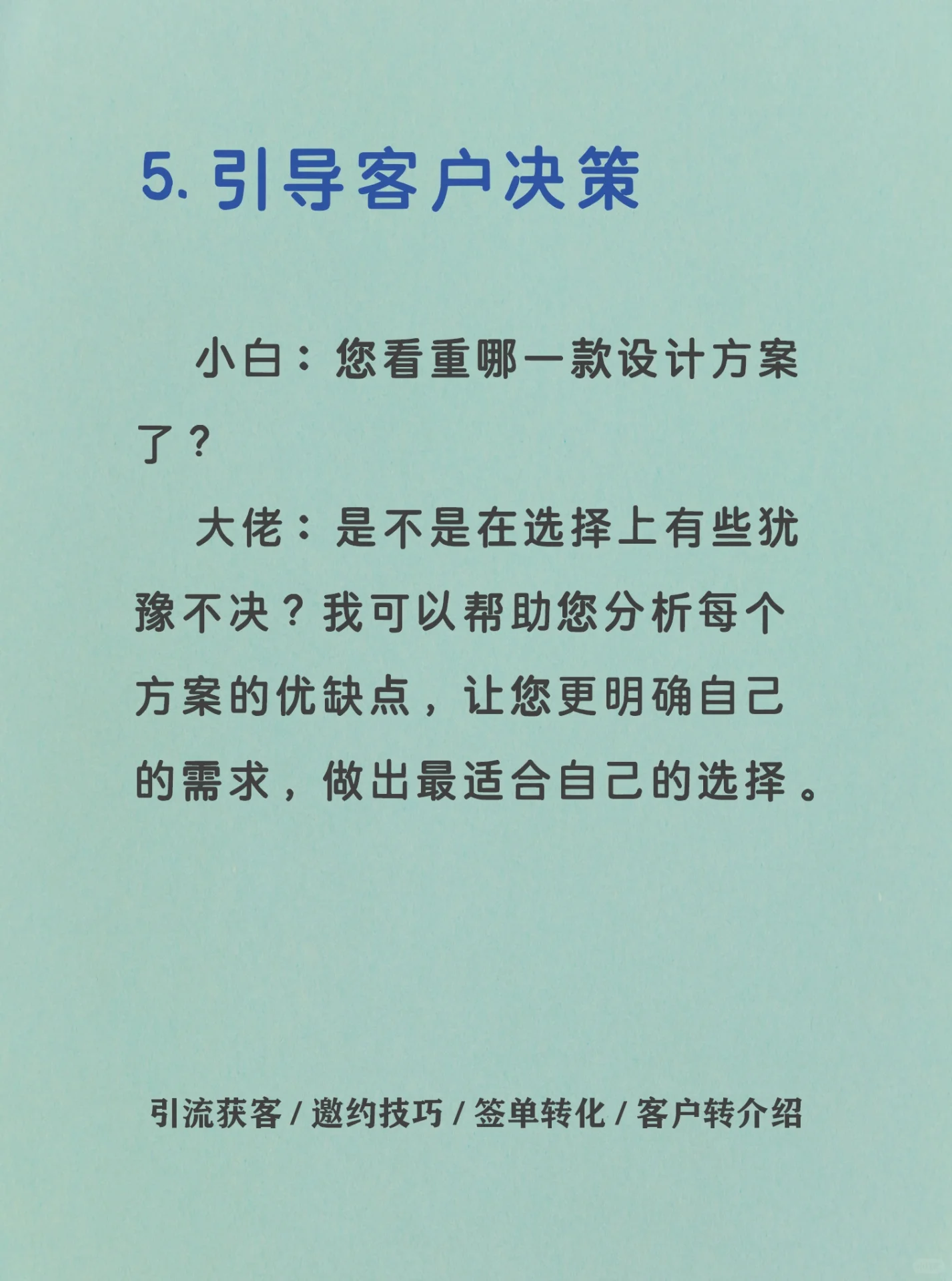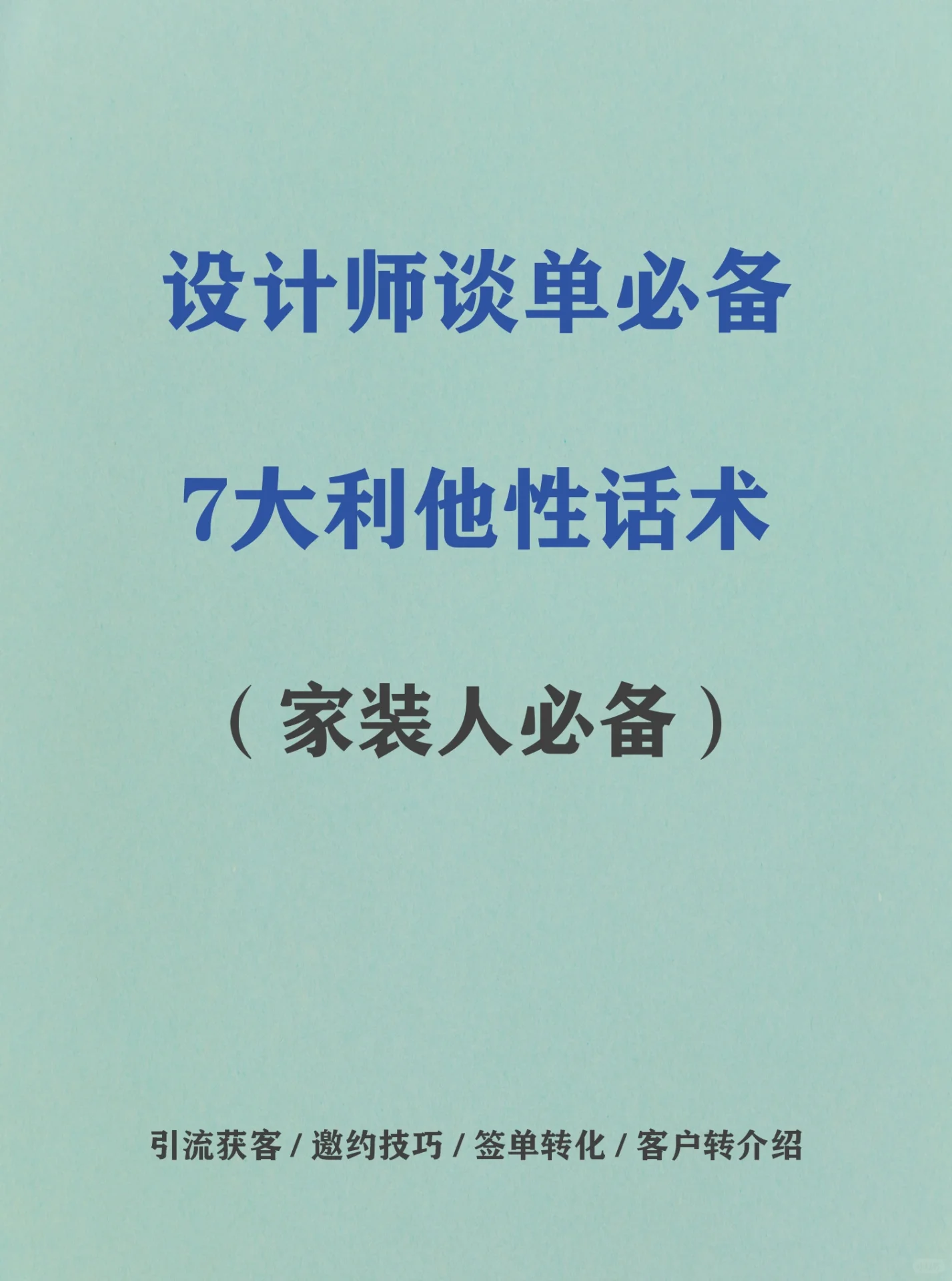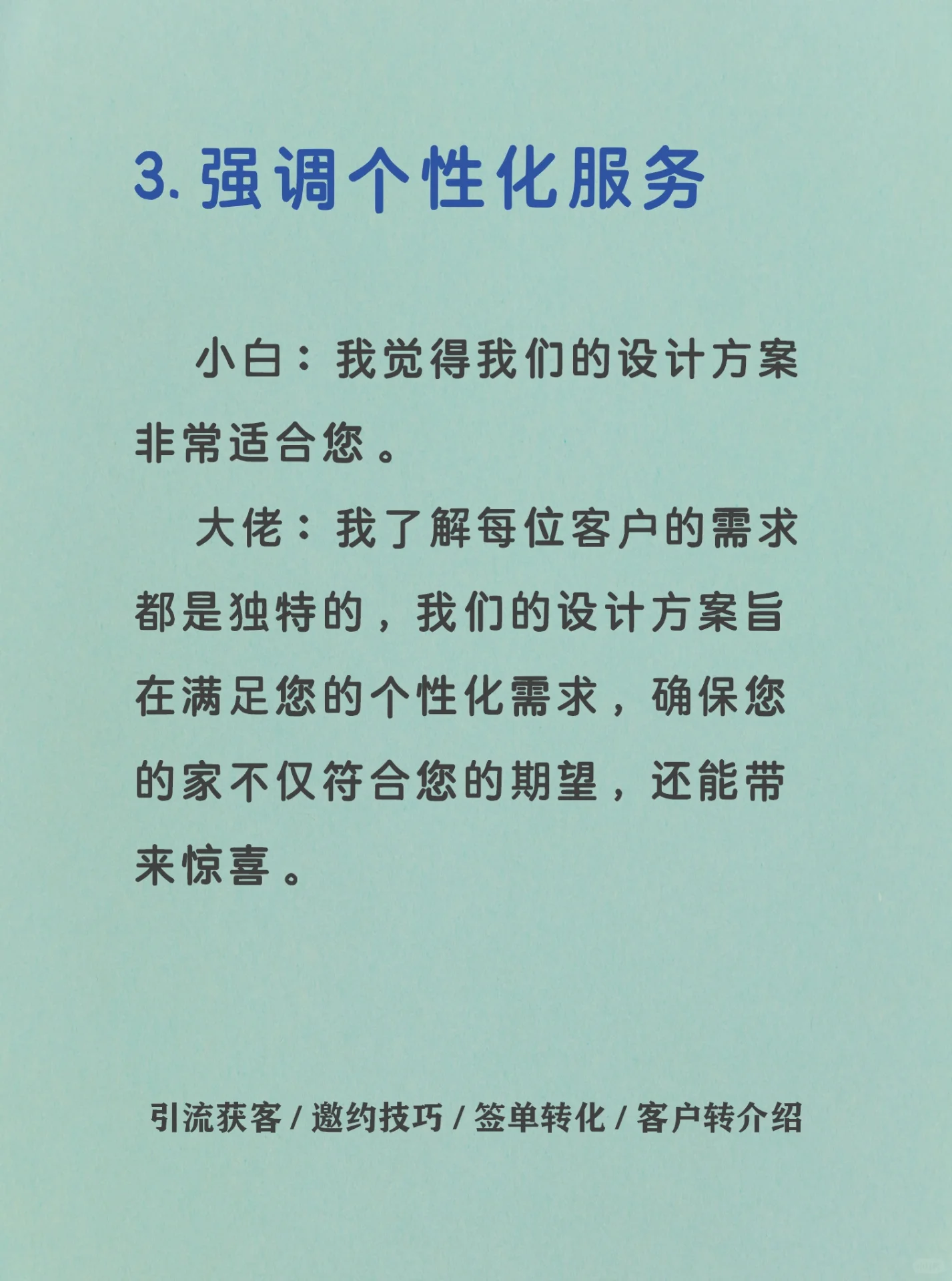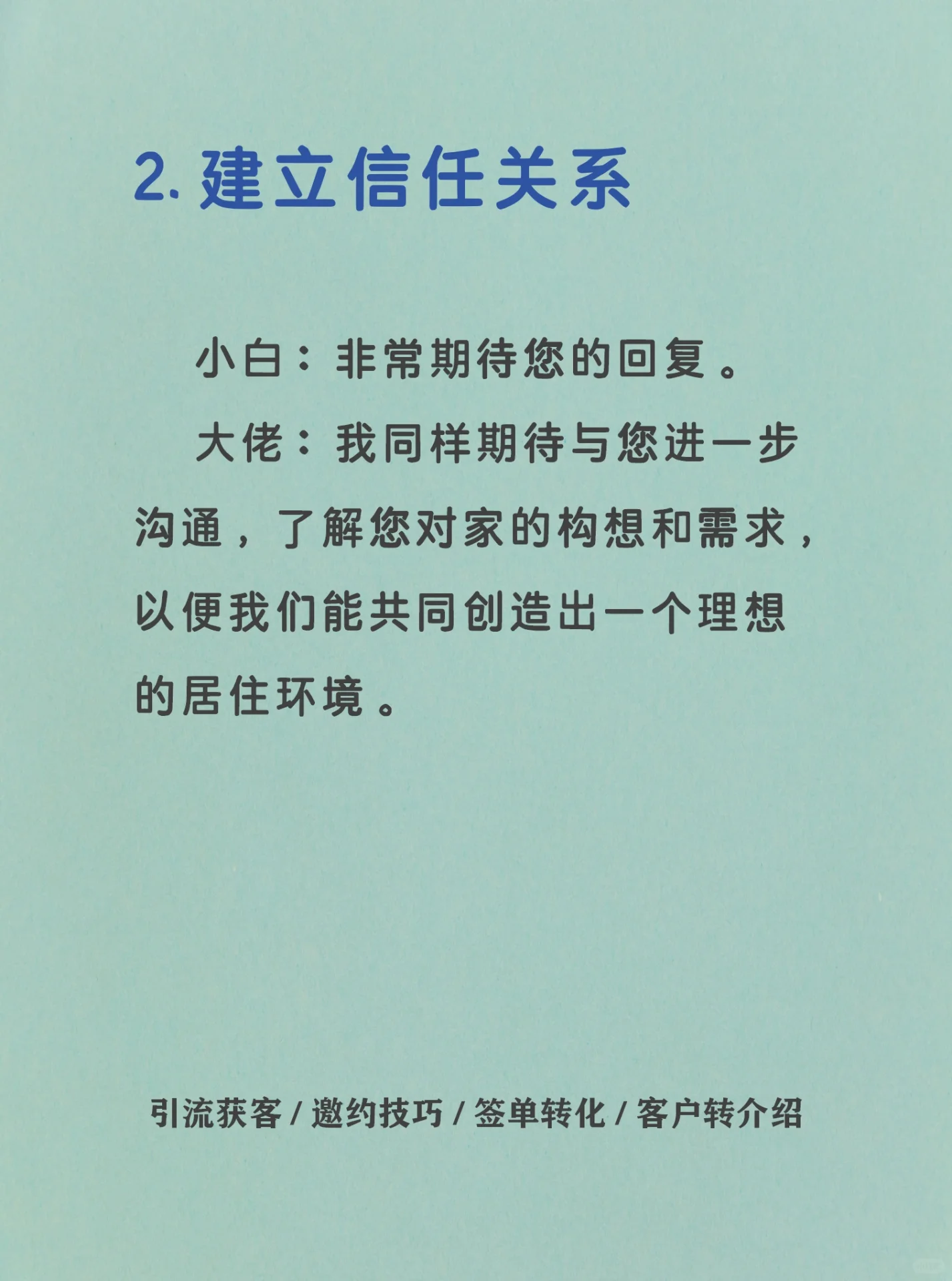 家装谈判秘诀:无私回复脚本,打造温馨家居新体验 1.深入了解客户需求 -小白:我给你发了一个装修方案,请你看一下。 -老板:我为您准备的装修方案旨在帮助您更清楚地了解如何打造一个既美观又实用的家,避免在装修过程中走弯路。 2.建立信任关系 -小白:我非常期待你的回复。 -老板:我也期待与您进一步沟通,了解您对家的想法和需求,以便我们共同创造一个理想的居住环境。 3.强调个性化服务 -小白:我觉得我们的设计方案非常适合你。 -老板:我知道每个客户的需求都是独一无二的,我们的设计解决方案旨在满足您的个性化需求,确保您的家不仅满足您的期望,还带来惊喜。 4.提供价值导向的建议 -小白:我们的设计方案性价比最高。 -老板:我们追求的不仅仅是性价比,而是在同等质量的前提下,为您提供最合理的价格。我们认为房子的价值远远超过价格本身。 5.指导客户决策 -怀特:你看重哪种设计方案 -老板:你对选择有点犹豫吗我可以帮助您分析每种解决方案的优缺点,以便您更清楚地了解自己的需求,并做出最适合自己的选择。 6.强调产品质量和服务 -小白:我们的装修质量是最好的。 -老板:质量是我们的基础,但我们更看重的是整体服务体验。从设计到施工,再到售后服务,我们将尽最大努力确保您无后顾之忧。 7.在定价问题上要诚实 -小白:我们的报价真的是最低的。 -老板:我们知道价格是您考虑的重要因素之一。请相信我们的目标是为您提供最大的价值,而不仅仅是追求低价。我们的报价基于高质量的材料和服务,以确保您的投资是值得的。