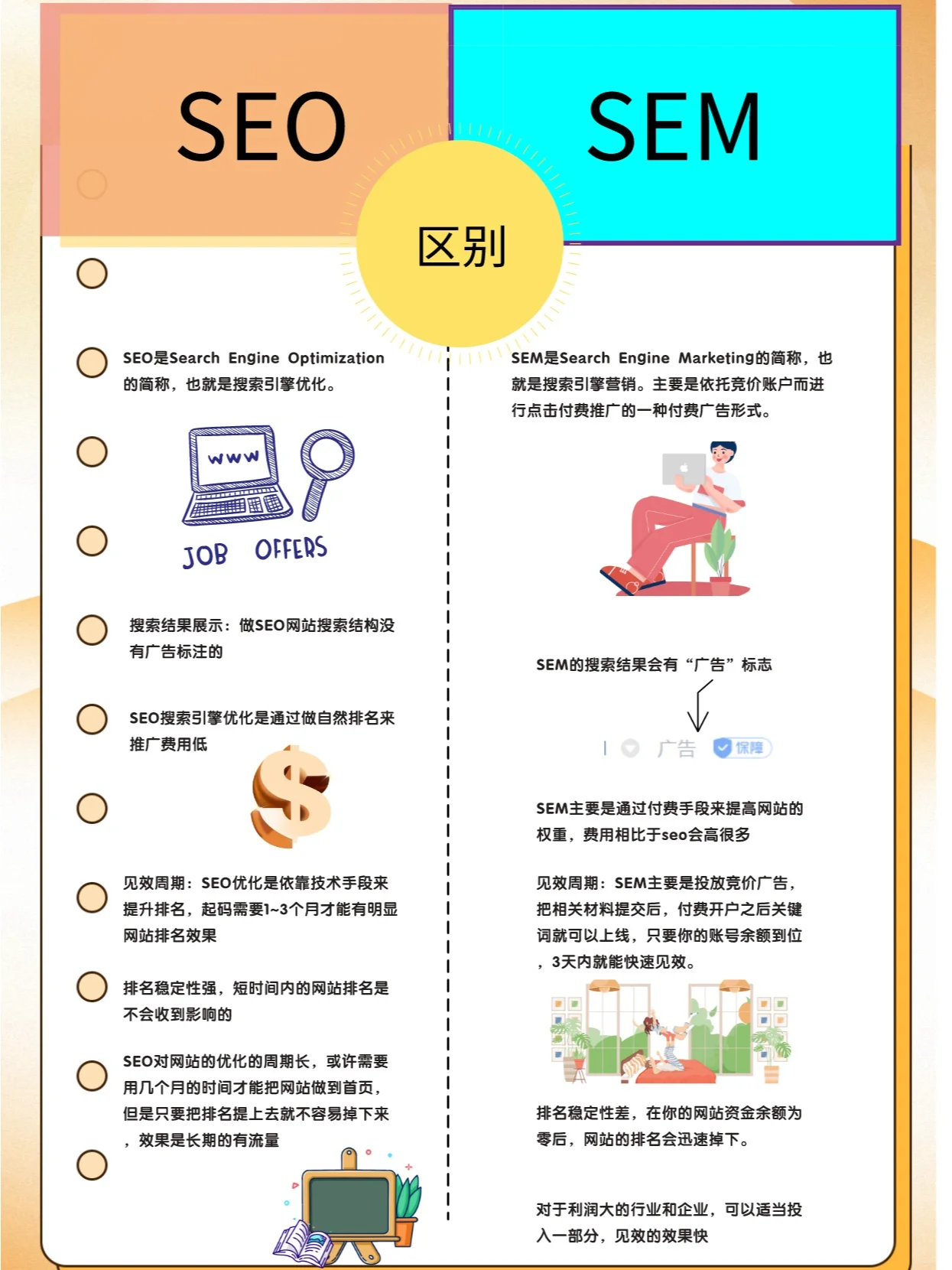 SEO是搜索引擎优化的缩写,意思是搜索引擎的优化。SEM代表搜索引擎营销,也称为搜索引擎营销。竞价账户是一种付费广告形式,通过用户点击来推广付费广告。 SEO和SEM之间的区别: 1.搜索结果显示:SEO网站具有搜索结构,没有广告注释。SEM搜索结果将带有“广告”标志 2.在推广成本方面,SEO搜索引擎优化使用自然排名来实现较低的推广成本,几乎为零。SEM主要通过付费方式增加网站流量和客户,与SEO相比成本要高得多 3.有效周期:SEO优化依靠技术手段提高排名,至少需要1-3个月才能产生显著的网站排名效果。SEM主要用于投放竞价广告。提交相关材料并开通付费账户后,即可启动关键词。只要你的账户余额到位,它就可以在3天内迅速生效。 4.稳定性:SEO网站的排名稳定性较强,短时间内不会影响网站排名。SEM竞价网站的排名稳定性较差,一旦你的网站资金余额为零,网站的排名就会迅速下降。 5.效果和结论:SEO对网站的优化周期很长,可能需要几个月才能到达主页。然而,只要排名提高,就不容易下降,而且效果是长期的流量。SEM招标适用于利润高的行业和企业,可以适当投资一部分,以达到快速的效果。他们都有自己的长处和短处。平衡SEO和SEM在企业网站建设过程中的利弊,达到预期效果。 如果你还有其他不了解的地方,请随时提问或在评论区给我发消息,我会为你提供详细的答案