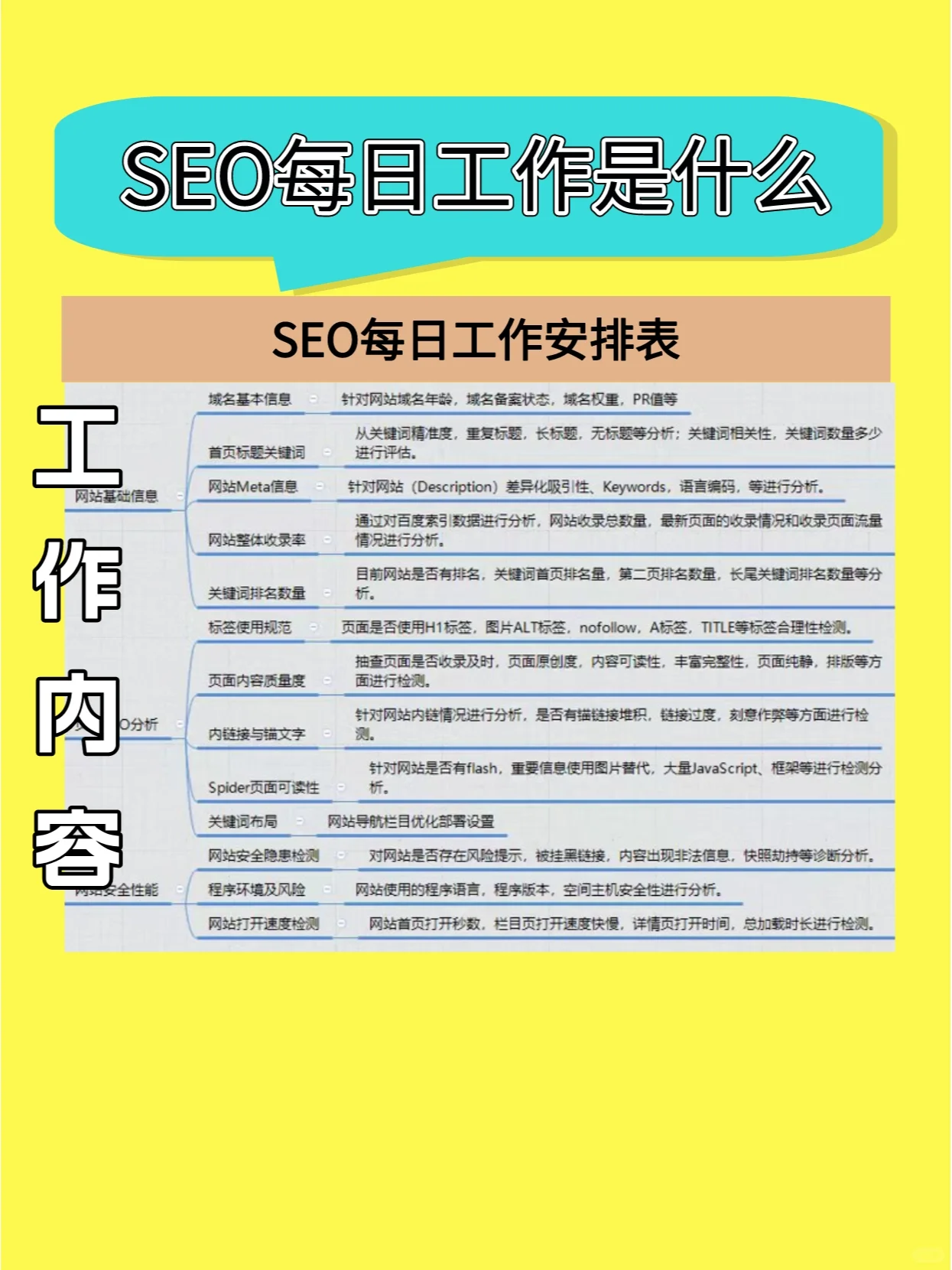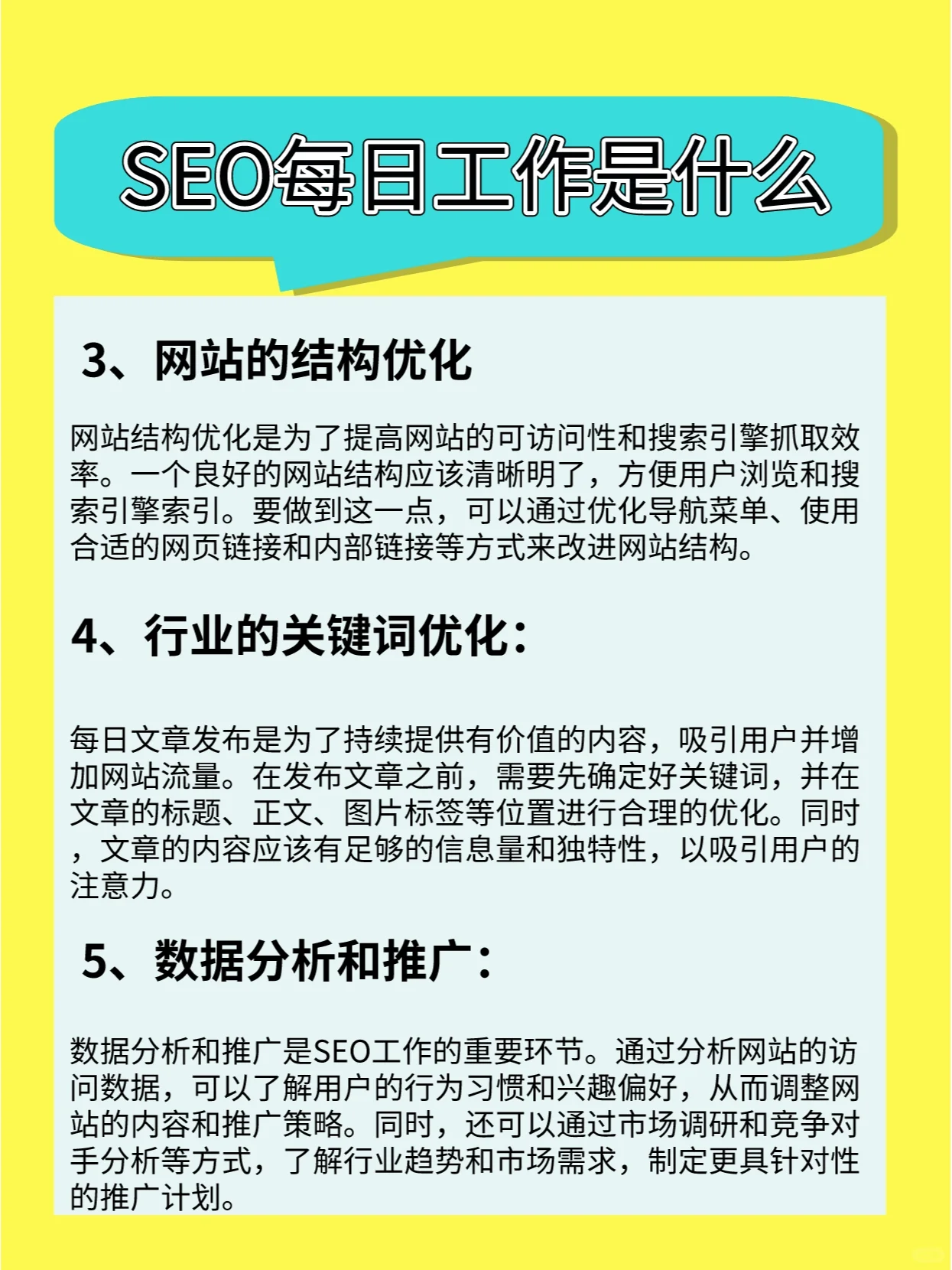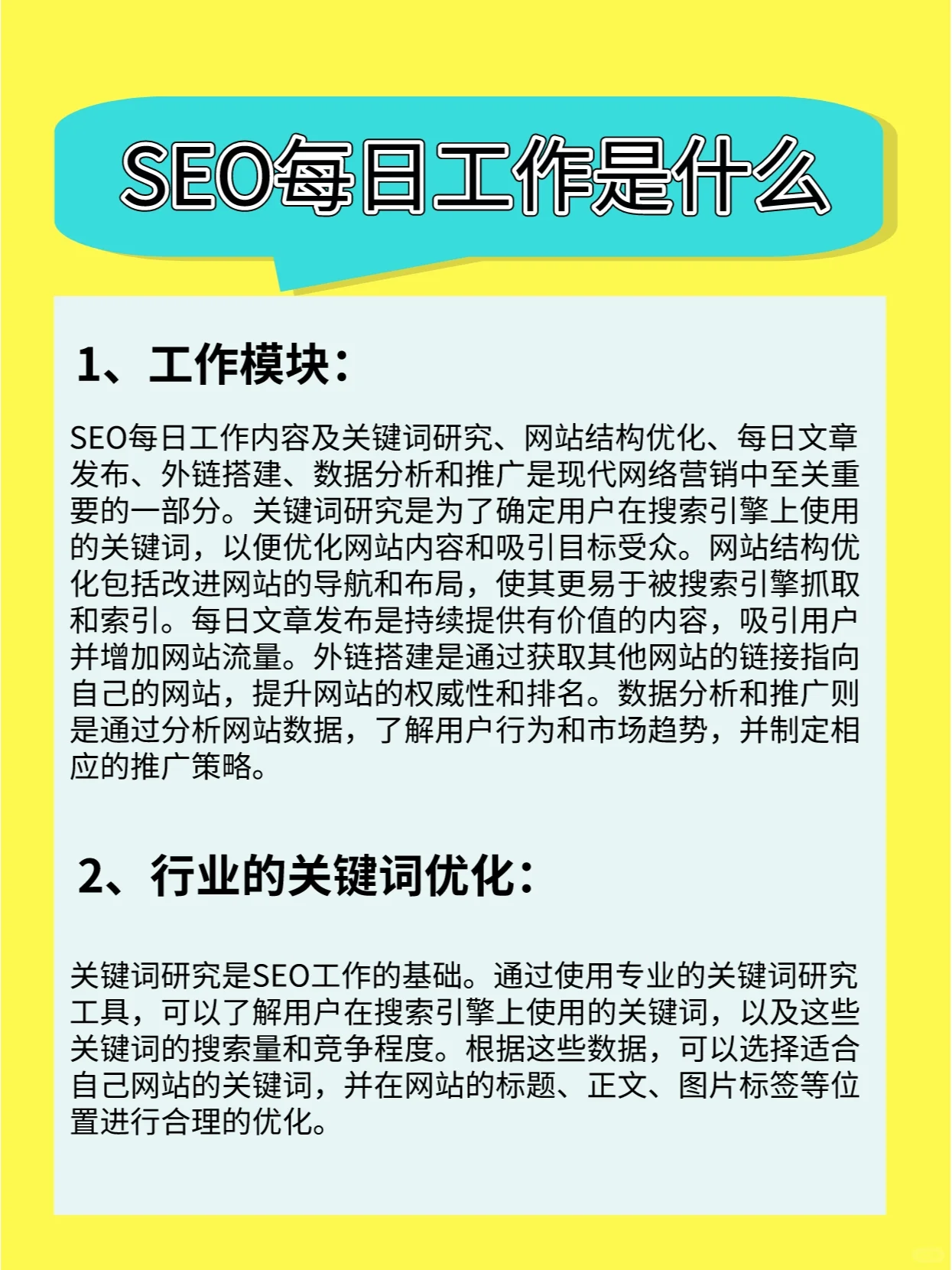 帮助新雇佣的SEO初学者快速开始他们的工作提高网站排名。 SEO的日常任务是什么 搜索关键词研究 在这个阶段,我们需要通过各种数据来搜索流行的搜索关键词。这可以帮助我们了解用户的需求和兴趣,为我们的网站提供更好的排名机会#关键词研究#搜索优化 网站分析和优化 通过使用各种分析工具,我们可以更深入地了解网站性能和用户行为。这有助于我们识别瓶颈并采取相应措施提高网站可见性和用户体验#网站分析#优化策略 内容创建和优化 在这个阶段,我们需要创建有趣和有价值的内容,同时优化关键词和标签,使搜索引擎能够更好地理解和索引我们的网页。这将有助于吸引更多的访问者,并提高网站的排名#内容创建#关键词优化 外部链接建设 通过与其他网站建立高质量的外部链接,我们可以增强它们的权威性和可信度。这不仅可以帮助我们在搜索引擎中获得更好的排名,还可以为我们带来更多的流量和曝光机会#外链建设#权威 定期监测和调整 SEO工作需要持续的监控和调整。我们需要定期检查排名、流量、转化率等关键指标,并根据数据进行相应的优化和改进