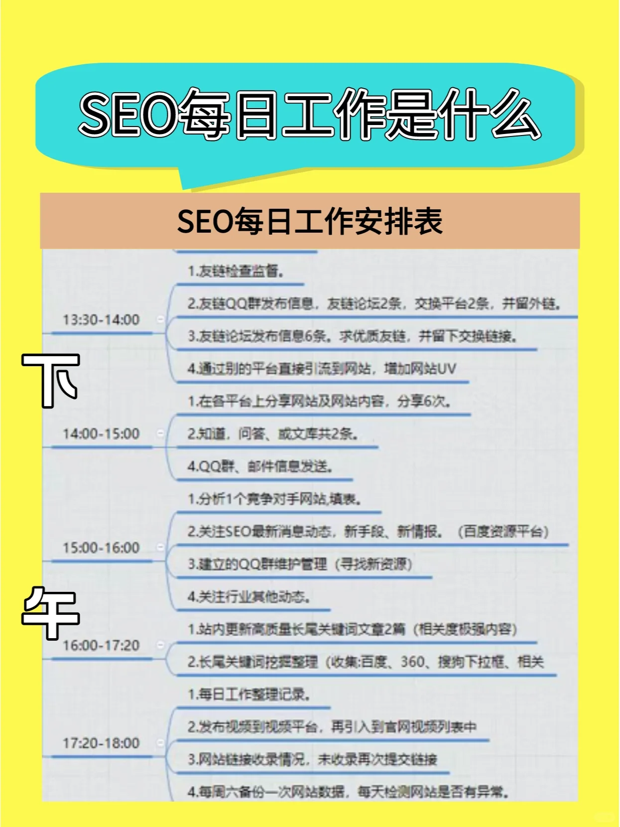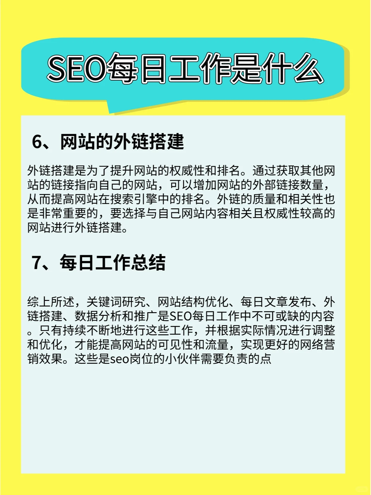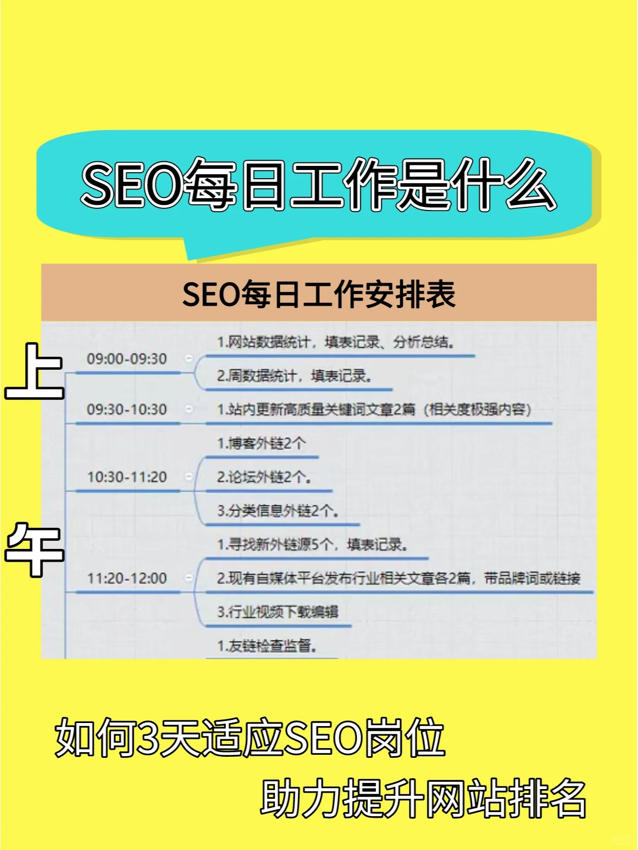 帮助新雇佣的SEO初学者快速开始他们的工作提高网站排名。 SEO的日常任务是什么 搜索关键词研究 在这个阶段,我们需要通过各种数据来搜索流行的搜索关键词。这可以帮助我们了解用户的需求和兴趣,为我们的网站提供更好的排名机会#关键词研究#搜索优化 网站分析和优化 通过使用各种分析工具,我们可以更深入地了解网站性能和用户行为。这有助于我们识别瓶颈并采取相应措施提高网站可见性和用户体验#网站分析#优化策略 内容创建和优化 在这个阶段,我们需要创建有趣和有价值的内容,同时优化关键词和标签,使搜索引擎能够更好地理解和索引我们的网页。这将有助于吸引更多的访问者,并提高网站的排名#内容创建#关键词优化 外部链接建设 通过与其他网站建立高质量的外部链接,我们可以增强它们的权威性和可信度。这不仅可以帮助我们在搜索引擎中获得更好的排名,还可以为我们带来更多的流量和曝光机会#外链建设#权威 定期监测和调整 SEO工作需要持续的监控和调整。我们需要定期检查排名、流量、转化率等关键指标,并根据数据进行相应的优化和改进