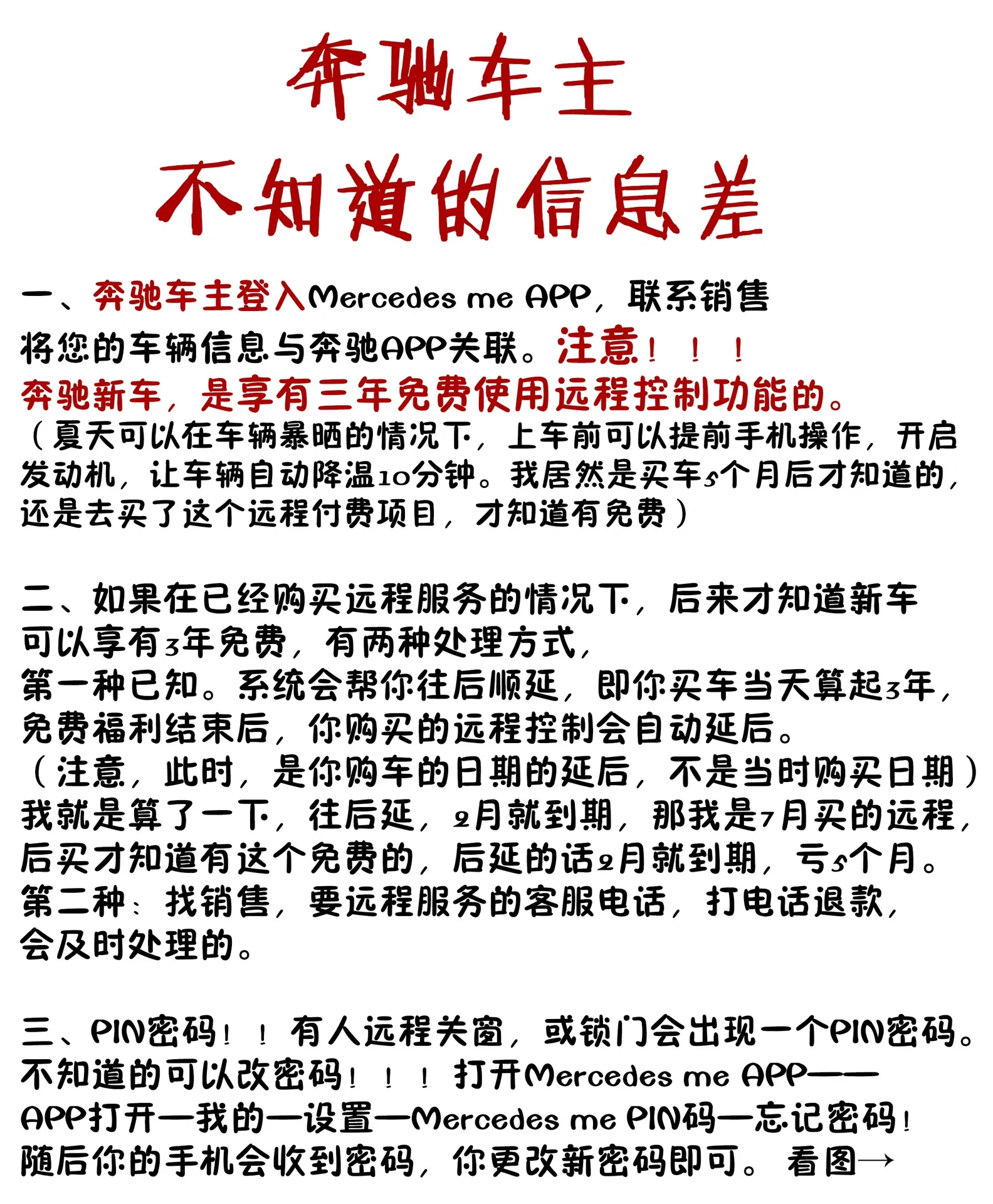 1、 梅赛德斯-奔驰车主登录梅赛德斯-奔驰me应用程序并联系销售 将您的车辆信息与梅赛德斯-奔驰应用程序相关联。注意 梅赛德斯-奔驰的新车有权免费使用遥控功能三年。 夏天,当车辆暴露在阳光直射下时,可以提前用手机操作,启动发动机,让车辆自动冷却10分钟后再上车。 实际上,我是在买车5个月后才发现这个远程支付程序的,直到那时我才意识到它是免费的。搞清楚了,不可能只有我一个人知道! 2、 如果后来才发现新车在购买远程服务后可以享受3年的免费服务,有两种处理方法, 第一种类型是已知的。该系统将帮助您从购车之日起将其延长3年。免费优惠结束后,您购买的遥控器将自动延期。 (请注意,在这一点上,这是您购车日期的延迟,而不是当时的购车日期) 我刚刚计算过,如果我推迟,它将在二月份到期。我在七月买了这个遥控器,后来发现有这个免费的。如果我推迟,它将在2月份到期,失去5个月。打个果断的电话要求退款。 第二种选择是联系客服热线进行远程服务,客服热线会及时拨打电话处理退款。无论如何,我今天下午及时处理了它,并将在免费期满后续订。 3、 PIN密码!!如果有人远程关闭窗户或锁上门,则会出现PIN密码。 那些不知道的人可以更改他们的密码!!! 打开梅赛德斯我的应用程序-我的-设置-梅赛德斯我的PIN-忘记密码! 随后,您的手机将收到一个密码,您可以更改新密码。