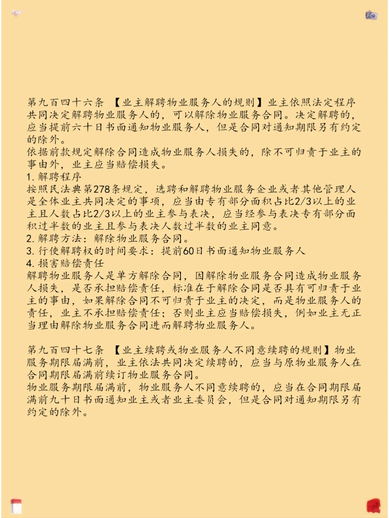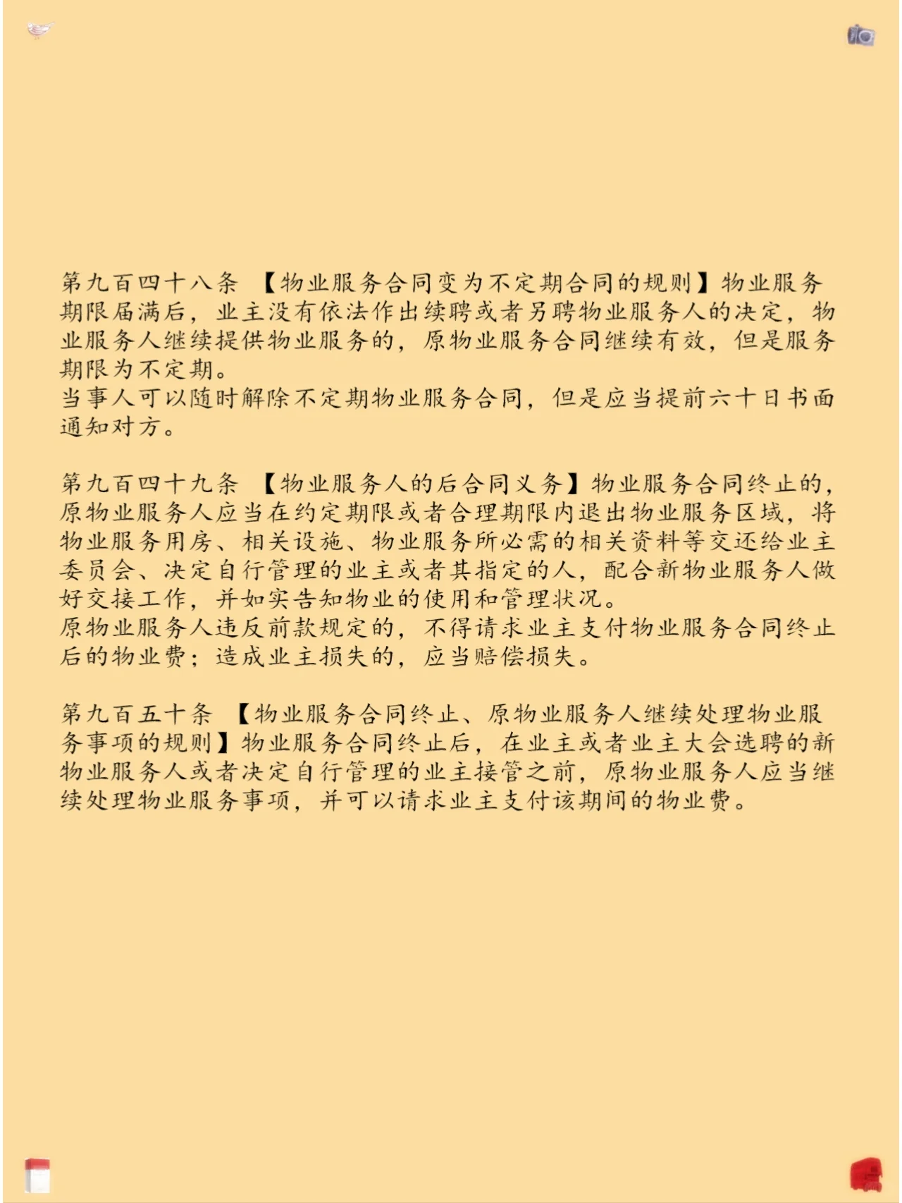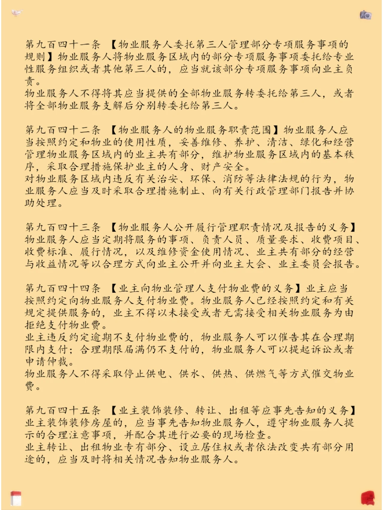 第二十四章物业服务合同 第937条【物业服务合同和物业服务提供者的概念】 第938条【物业服务合同的主要内容和形式】 第939条【不同单位签订的物业服务合同对业主的效力】 第940条【初步物业服务合同与通过业主甄选和任命订立的物业服务合同之间的联系规则】 第941条【物业服务提供者委托第三人管理部分特殊服务事项规则】 第942条【物业服务人员的物业服务职责范围】 第943条【物业服务提供者公开履行管理责任和报告的义务】 第944条【业主向物业管理人支付物业费的义务】 第945条【业主在装修、转让、出租等情况下提前通知的义务】 第946条【业主解聘物业服务人员的规则】 第947条[业主续聘或不同意物业服务人员的规则] 第948条【物业服务合同转为非正常合同的规则】 第949条【物业服务提供者的合同后义务】 第950条【原物业服务提供者终止物业服务合同和继续办理物业服务事项的规则】