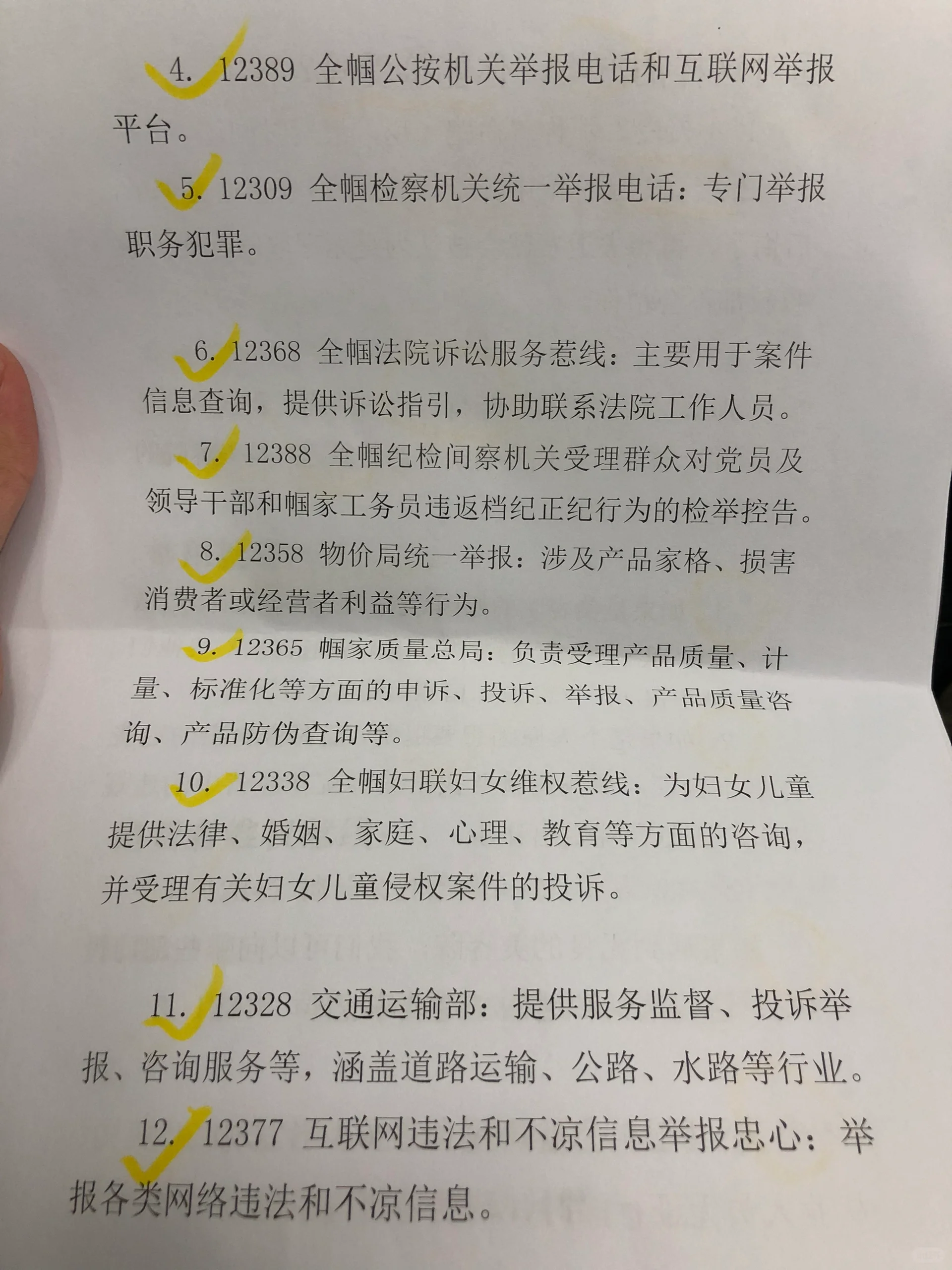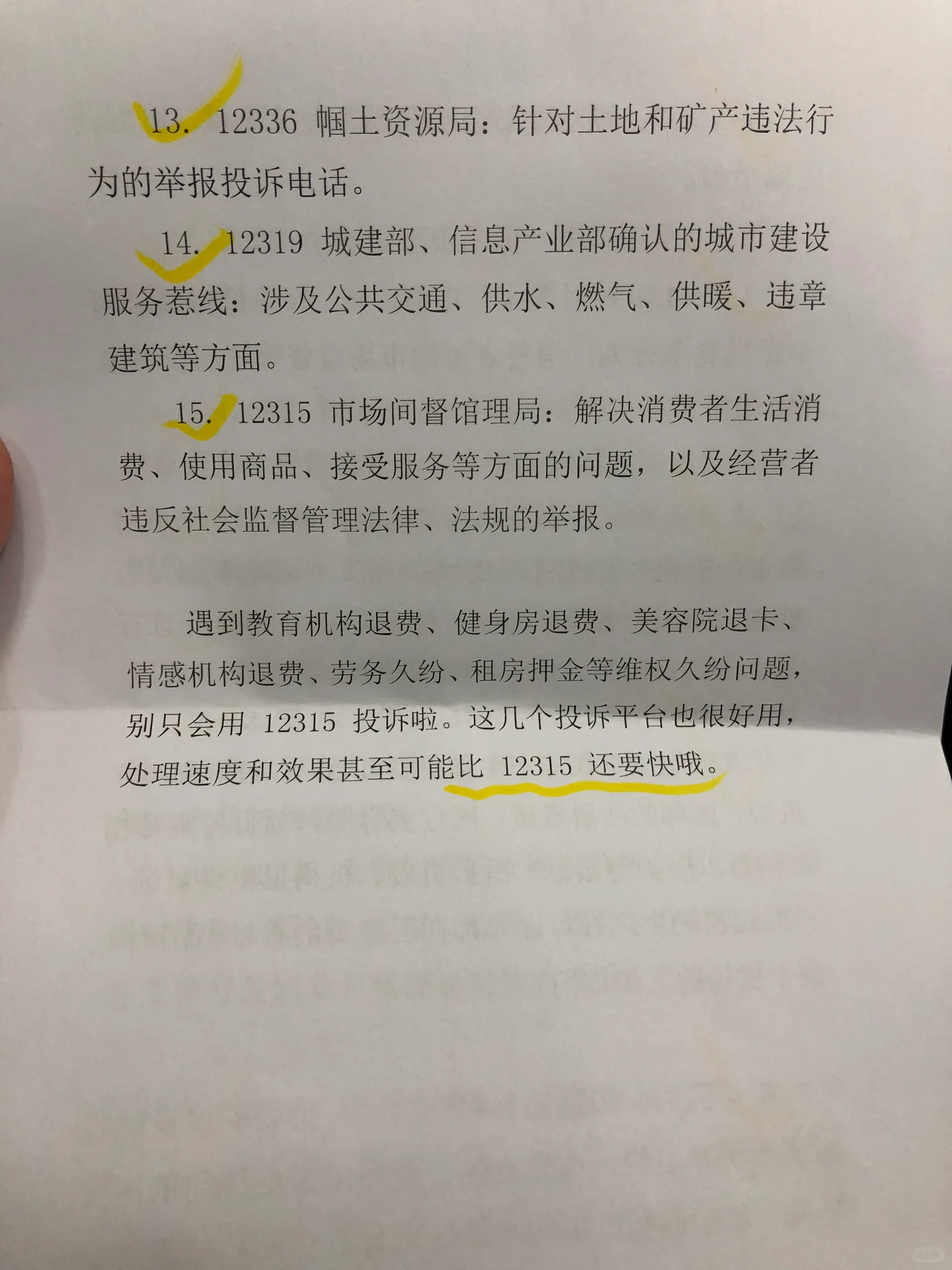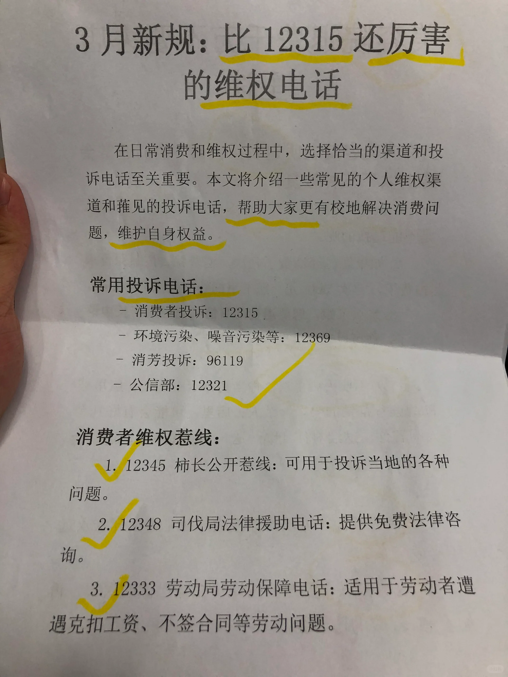 恶魔没有任何挑衅不是不可能吗。 对于我们这些无能为力的普通人来说,我们必须时刻记住在这14个关键时刻可以使用的电话号码 12348法律援助热线:遇到法律问题和经济困难时,赶紧拨打这个号码,好吗。它不仅可以免费提供各种法律知识,而且符合条件的人还可以免费申请律师提起诉讼。 12338妇女维权热线:女性朋友,如果你在家庭中与丈夫发生矛盾或遭受不公平待遇,为什么不拨打这个电话,有人会帮你保护你的权利吗。 12333妇女人力资源和社会保障服务热线:如果你遇到拖欠工资或无法购买社会保障等劳动问题,拨打这个号码会有很好的效果吗。 12345市民电话(与12315合并):无论你在生活中遇到什么困难,你总是可以拨打这个24小时不间断的电话。比如欠缴社保、扣除房租押金、拖欠工资等问题,反馈效果是否也很好。 膨胀点提醒:外地咨询记得在投诉电话中添加区号,直接拨打当地投诉电话即可。