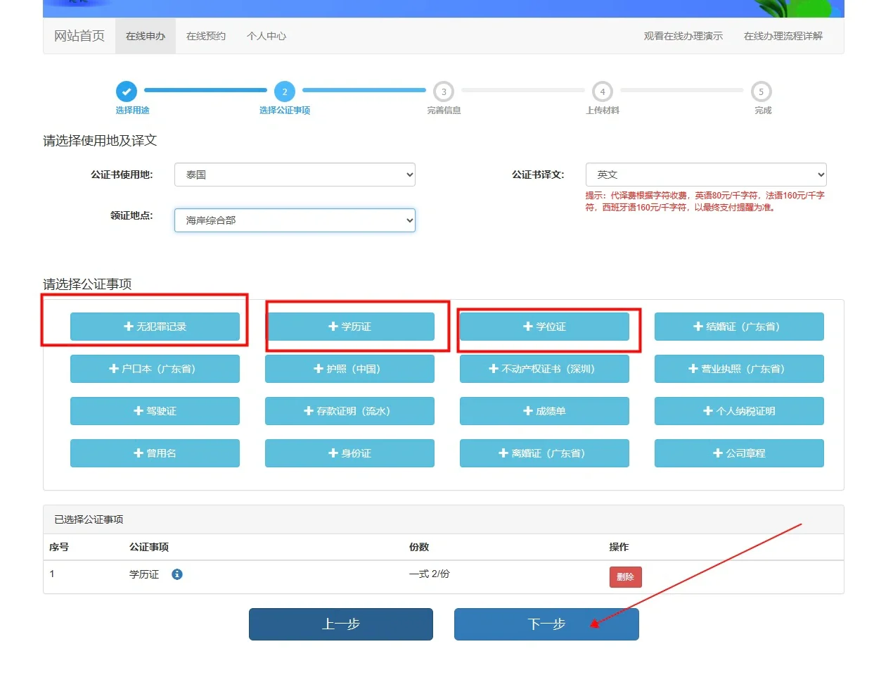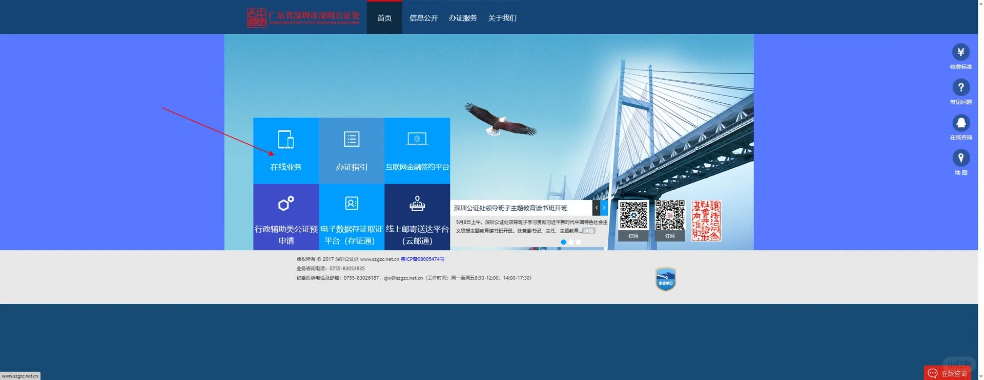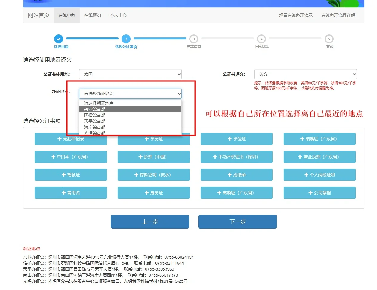 深圳网上公证流程,完成流程后只需到办公室领取即可在家顺利完成。(根据图表逐步操作,超级简单[bar R]) 共有16种类型的公证文件可以在线处理,包括犯罪证明、学历证明、学位证书、结婚证(广东)、户口本(广东),成绩单、护照(中国)等 第一步是进入在线处理网站并选择在线业务 步骤2:注册并登录 步骤3:点击在线服务后,选中“我已经阅读”并选择“启动申请” 步骤4:选择您需要处理的业务,并观看详细的在线处理过程 第五步:选择公证证书将在哪个国家使用,翻译的语言,证书颁发的地点(证书颁发的具体地点如图1所示),以及公证事项。单击“下一步” 第6步:选择申请人,然后单击“下一步”。如果不需要代理翻译,可以取消选中代理翻译选项 第7步:上传在线材料。我正在办理学位公证,需要上传我的身份证、户口本、毕业证、学位证书和中国学位和信息技术网的学历验证报告。如果我不是深圳居民,我需要上传我。如果我没有居住许可,我需要上传一份授权书。授权书可以从网站上下载,处理费为240日元。对于其他业务费用,您可以点击证书处理指南并选择费用标准。第八步:点击完成后,等待审核,关注短信,审核通过后,支付费用。如果审核未通过,系统将提示您添加哪些信息, 注意审批后及时付款 在线认证需要5个工作日。5个工作日后,将上传的原始文件带到您选择的办公室进行收集 公证处有代办双重认证的服务