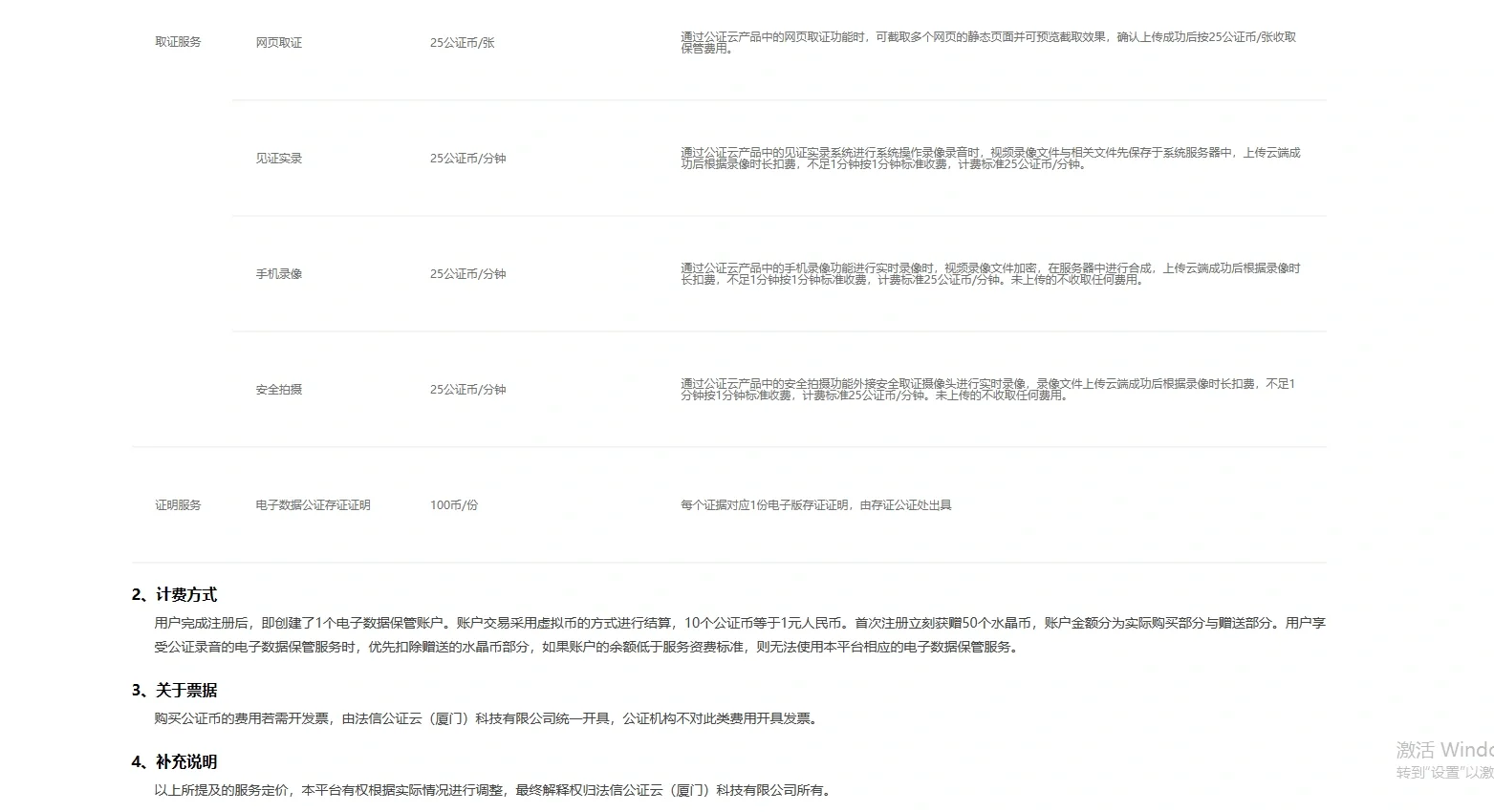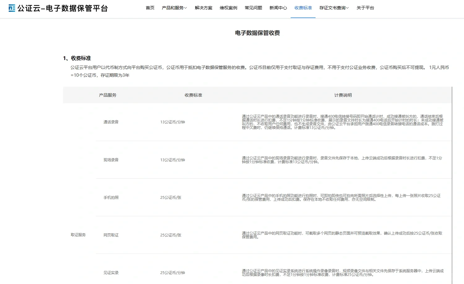 我预约了一个工作日下午去公证处做证据保全公证,主要是网页和视频的截图和录制 提前准备需要公证的网站列表 携带授权书和授权书 由公证人在专门的证据保存室到达现场 10个工作日后领取公证证书 现场公证由公证员或公证助理现场进行,委托人只需坐在旁边查看即可 价格是预先协商的,包括政府指导价,其中一些是可以协商和调节的市场价格(见图2和图3) 证据保全属于定时收费范畴 在线公证:公证云(见图4和图5) 可以在公证云上进行注册,在一个账户下可以设置多个子账户。截图或记录屏幕后,它们可以存储在云平台上,没有任何时间限制,类似于时间戳的功能。它是一个平台,各种公证处可以选择在平台上存储 公证云要求使用经过公证的硬币进行保存,但公证证书需要额外费用 向右总结:没有多少现场公证人不需要排队或自己操作,这使他们更有效。然而,它们也是耗时、费力和昂贵的;公证云可以随时登录进行自我保护,及时快速,有效性相对较弱