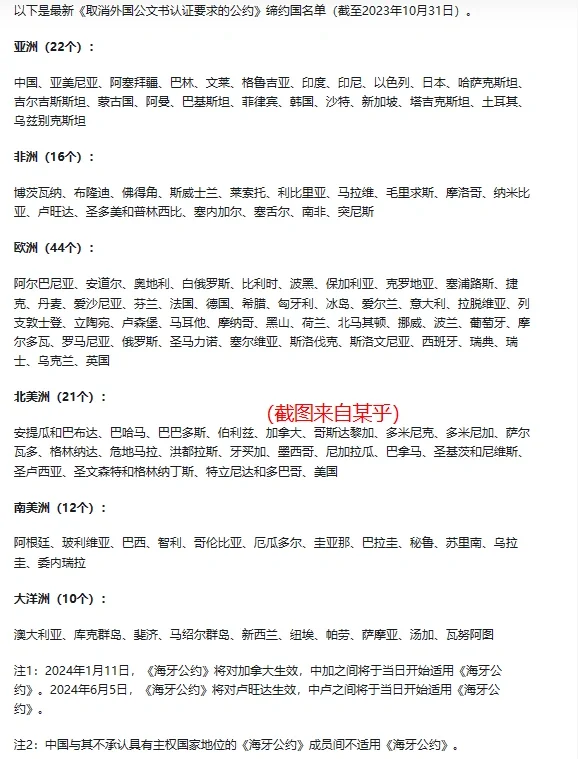 在中国于2023年11月7日加入《海牙公约》后,许多跨境文件的认证程序变得更加方便。 例如,我在意大利留学前所做的双重认证需要至少一个月的等待时间,因为它需要先送到中国外交部盖章,然后再送到意大利驻北京大使馆盖章。现在你只需要在当地外交办公室做海牙认证APOSTILE(额外认证),民事文件的认证只需要50r,一周内即可获得。它既省钱又省时。 然而 海牙公约目前仅适用于108个国家和地区,包括美国、澳大利亚、新西兰、南非、日本、韩国、香港、澳门、法国、西班牙、葡萄牙、英国、墨西哥、意大利、爱尔兰、土耳其、以色列、俄罗斯、瑞士、瑞典、挪威等。 此外,古巴、哥伦比亚、蒙古和安道尔等42个非海牙成员国也承认《海牙公约》认证文件。(详情请参阅屏幕截图) 因此,马来西亚和泰国等尚未加入公约并要求跨境文件认证的国家需要双重认证。 先决条件:任何领事认证都需要经过公证的证书和公证处的介绍信,因此在申请领事认证之前,必须先去公证处并获得公证证书。 [Star R]在线处理流程(无需亲自出席,邮寄可能需要一些时间): 1.搜索领事服务中心(官方,不用担心)/地方政府服务中心公主号(海一板,如深圳) 2.点击领事认证 3.在线填写信息和上传材料 审核通过后,可以邮寄经过公证的证书 5.处理完成后,我们会将其邮寄回您。 6、民事文书50元,邮费60元,大约110元 我的现场处理流程: 1.前往当地外事办公室/政府服务中心(不同地区需要具体咨询) 2.将公证证书原件和公证处出具的介绍信带到当地外事办公室/政务服务中心(现在很多地方的政务都在政务服务中心统一办理) 3.号码采集、处理和支付。 4.民事文书鉴定费50r 超级简单吗如果你在国外,你可以找人代你办理或在网上办理,完成公证并邮寄回国后,你可以让家人帮你办理领事认证。或者一些公证处也提供办理领事认证的服务。 当然,这篇文章只是想告诉大家,领事认证并不复杂,可以自己处理,不需要中介机构花钱。