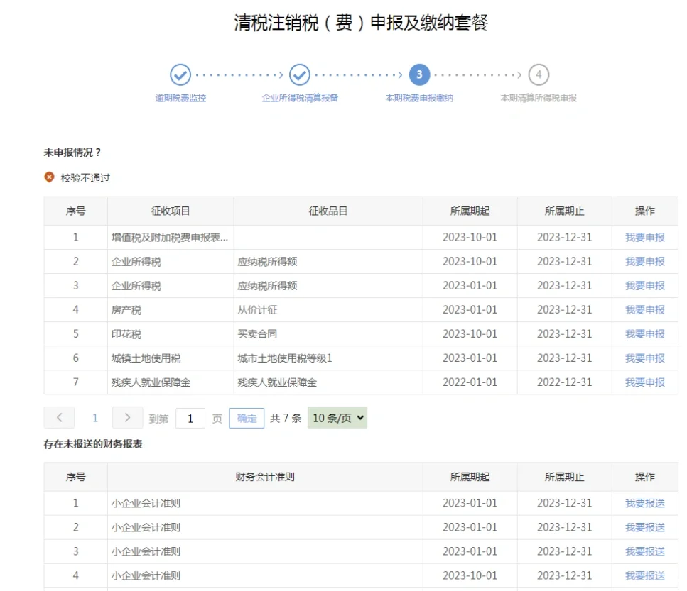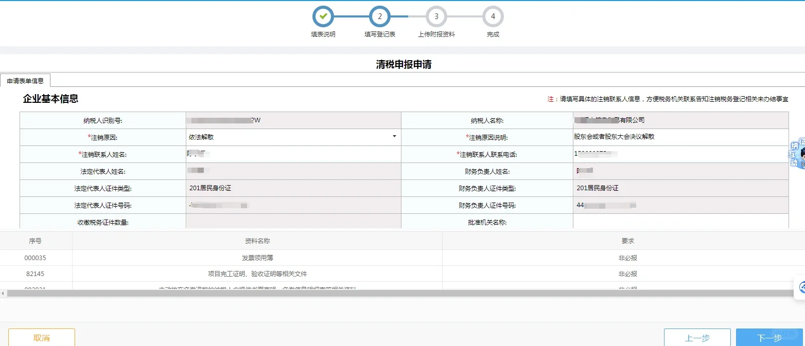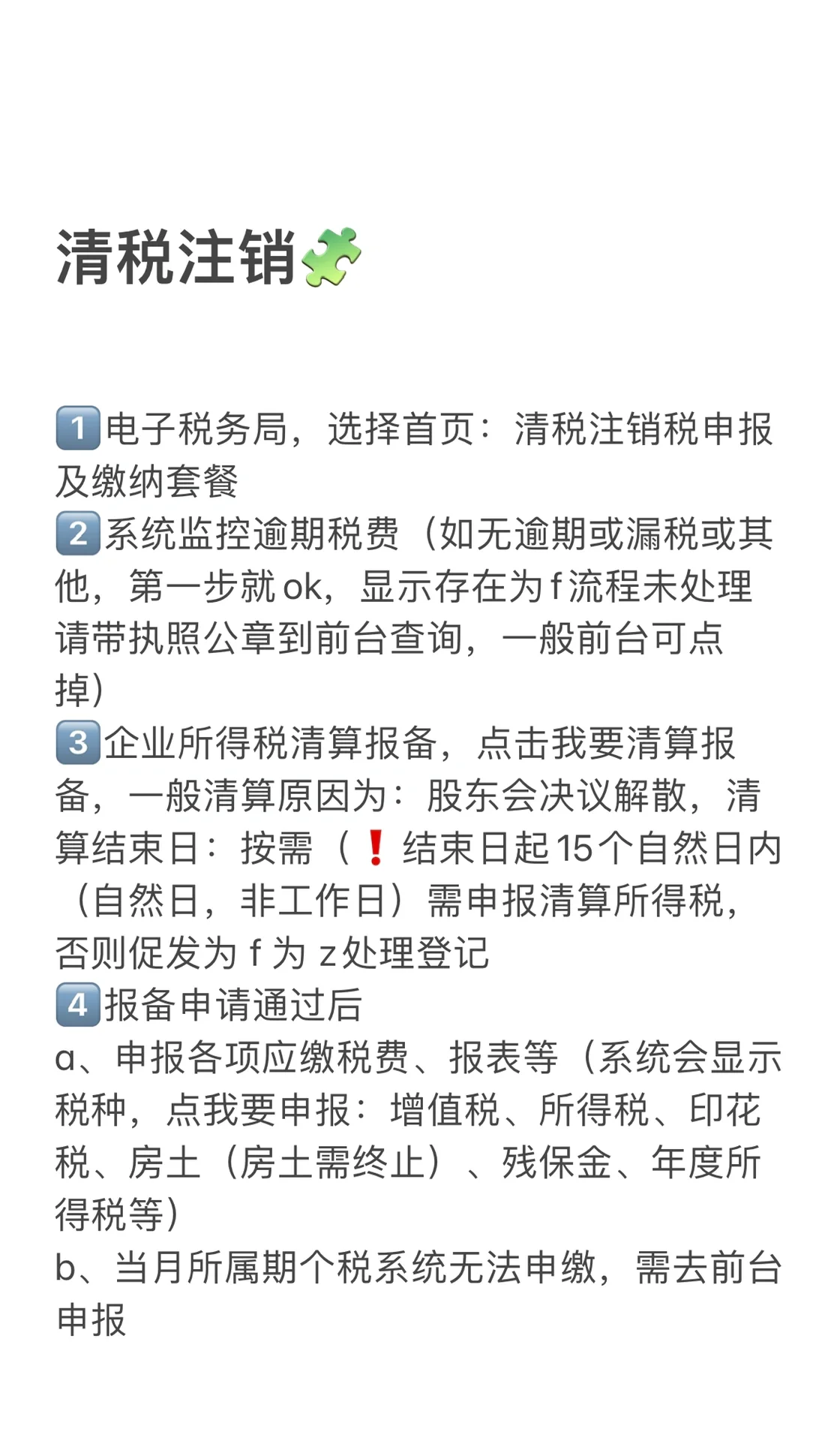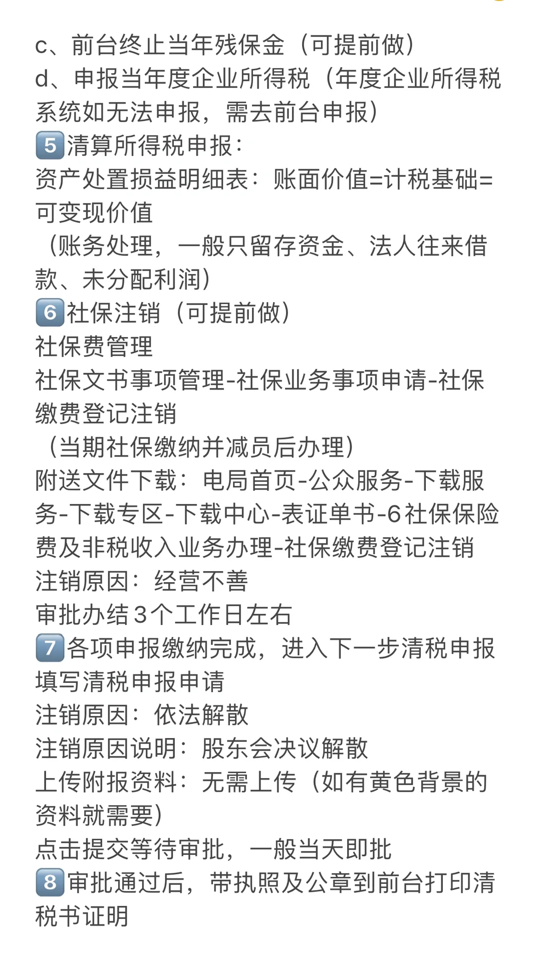 电子税务局,选择主页:清关和取消纳税申报和付款包 系统监控逾期税费(如果没有逾期或漏税等问题,第一步就可以了,说明有未处理的流程。请携带您的执照和公章到前台查询。一般情况下,前台可以点击删除) 企业所得税清算报告,点击“我要清算报告”(按照程序包步骤,如图3第二步所示)。一般清算的理由是:股东大会决定解散,清算结束日期视需要而定( 自清算结束之日起15个自然日(自然日、非工作日)内,需要申报清算所得税。否则,它将被提升为f并进行注册处理 注册申请获得批准后 a.申报各种应交税费、报表等(系统会显示税种,点击我要申报:增值税、所得税、印花税、房地产(房地产需终止)、伤残保险、年所得税等) b.当月个人所得税系统无法申请缴纳,您需要到前台进行申报 c.在前台终止当年的残疾保险福利(可以提前完成) d.申报当年企业所得税(如果年度企业所得税系统无法申报,需要到前台申报) 清算所得税申报: 资产处置损益表:账面价值=计税基础=可变现价值 (会计处理,一般只保留资金、企业借款和未分配利润) 社保取消(可以提前办理) 社会保障费管理 社会保障文件管理.社会保障业务申请.社会保障缴费登记注销 (待本次社保缴费和裁员后处理) 附件下载:电力局主页-公共服务-下载服务-下载专区-下载中心-表格证明书-6社保费及非税收入业务办理-社保缴费登记注销 取消原因:管理不善 审批过程大约需要3个工作日 完成所有申报和付款后,进入下一步的纳税申报 填写纳税申报申请 撤销理由:依法解散 撤销原因说明:股东大会决定解散公司 上传补充材料:无需上传(黄色背景材料需要上传) 点击提交审批,通常在同一天审批 批准后,带上您的执照和公章到前台打印清关证书 PS:适用于企业的简单注销