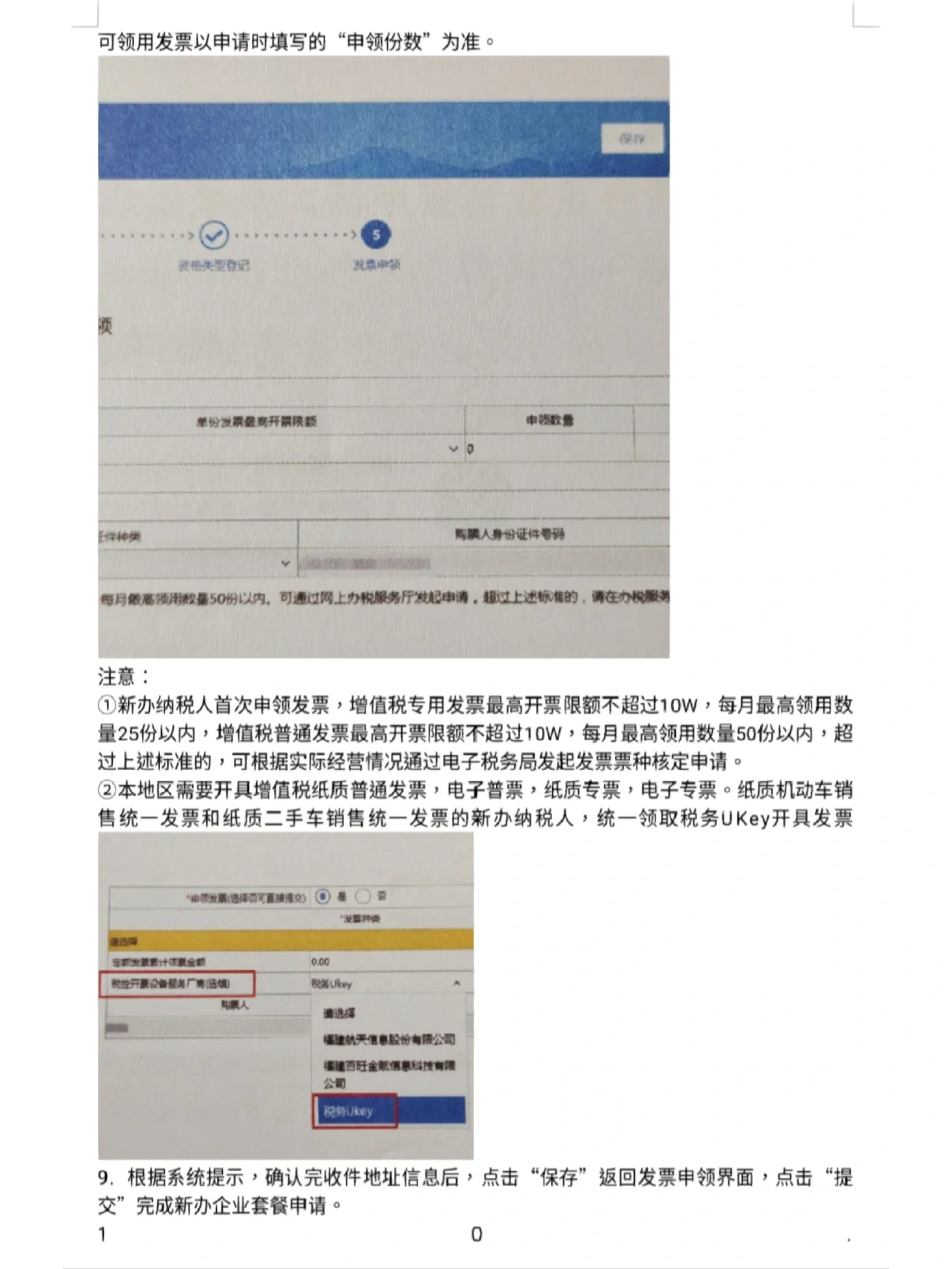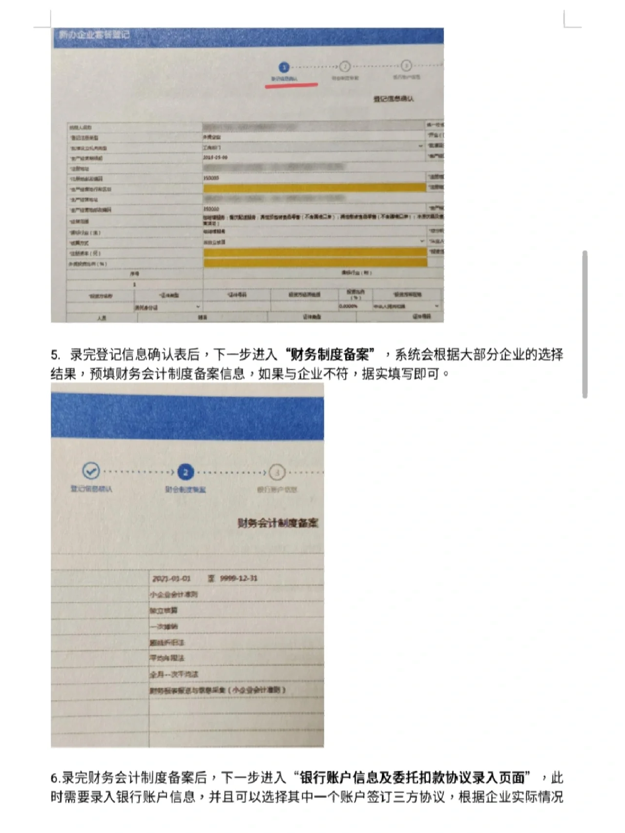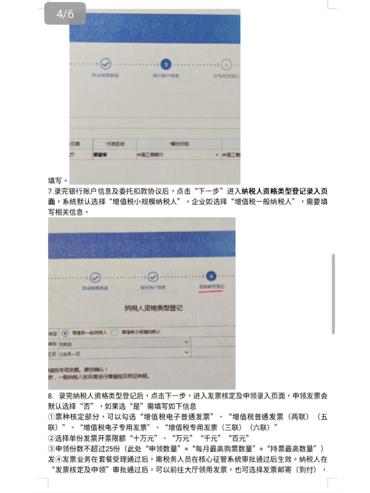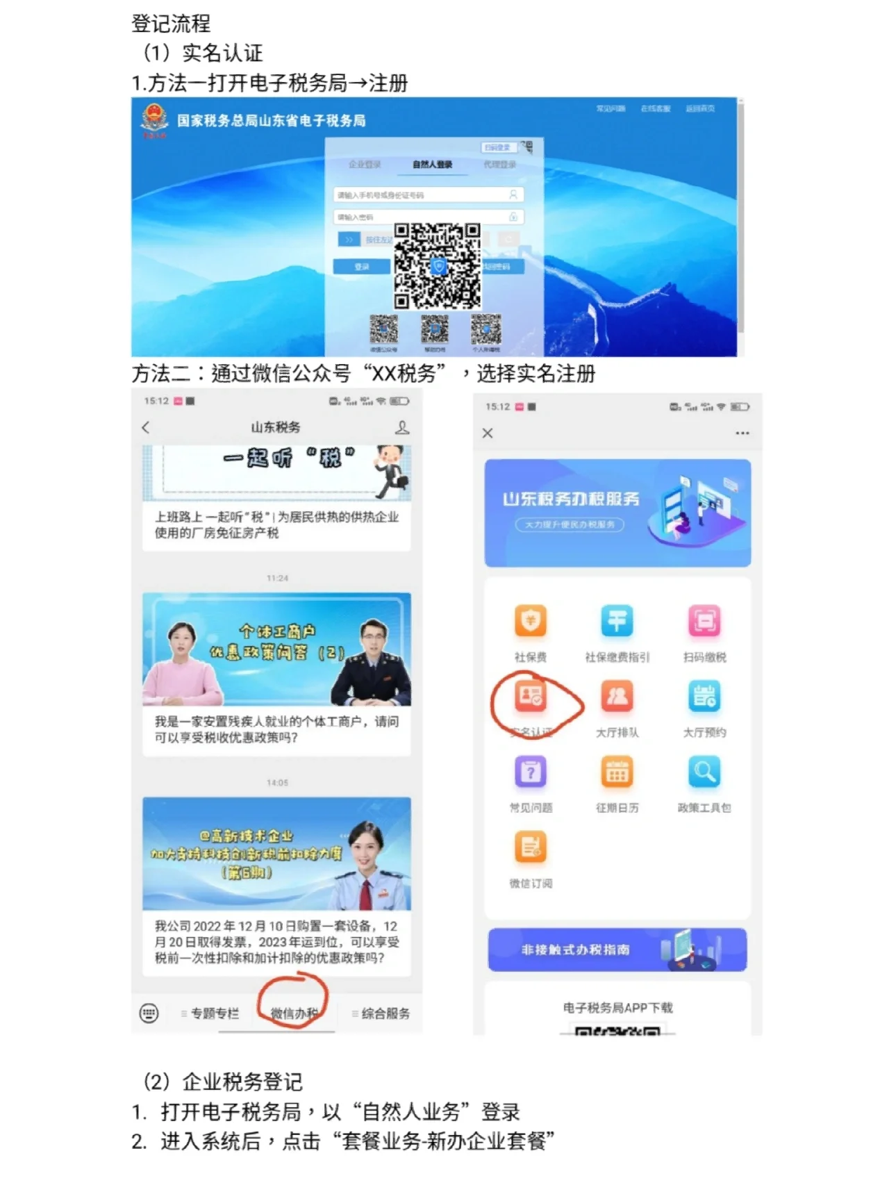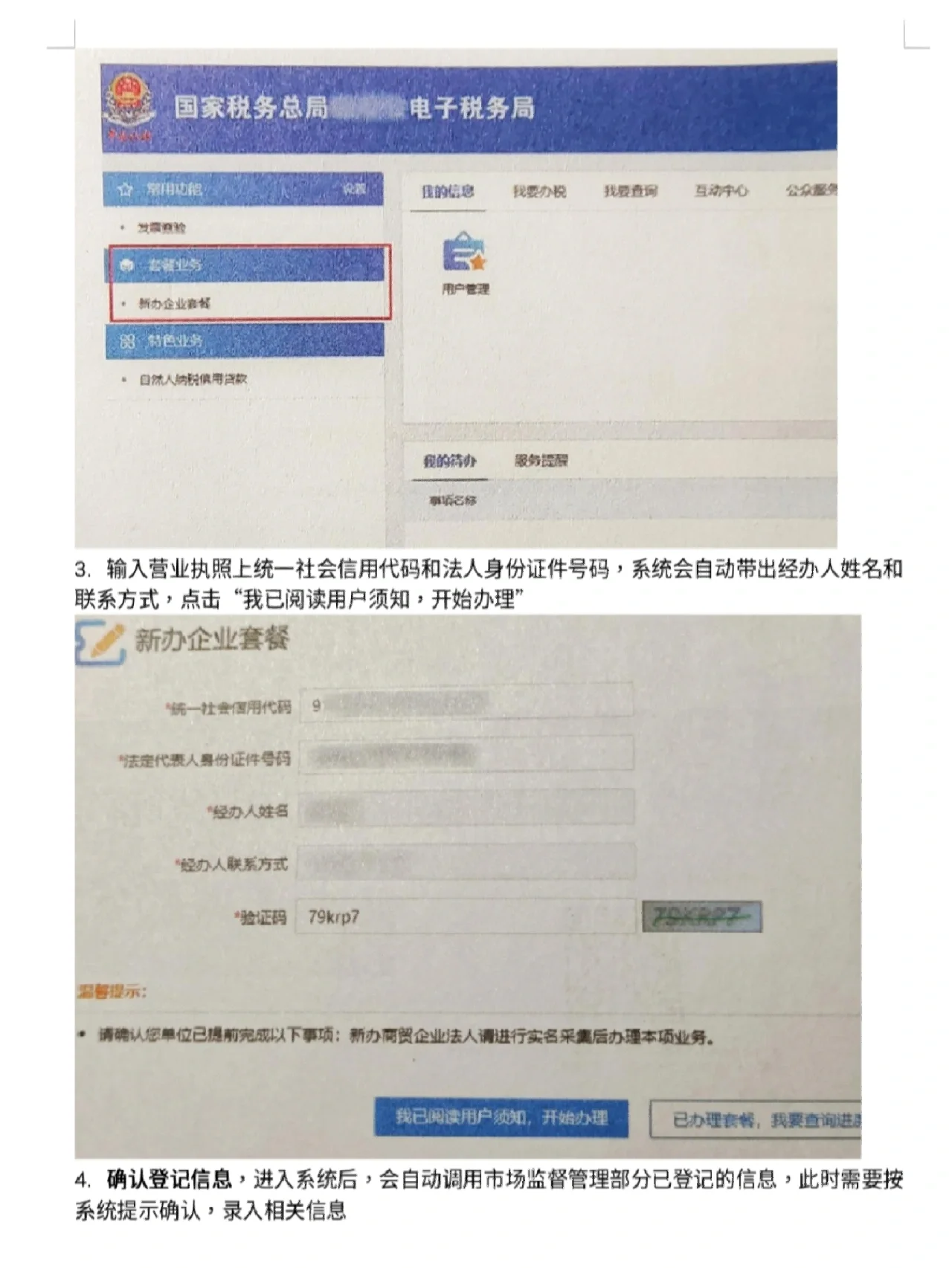 (1) 实名认证 1.方法一:打开电子税务局→ 登记 方法二:通过微信公众号“XX税务”选择实名登记 (2) 企业税务登记 1.打开电子税务局,以自然人身份登录 2.进入系统后,点击“套餐业务-新建企业套餐” 3.在营业执照上输入统一的社会信用代码和法定代表人身份证号码,系统会自动带出负责人的姓名和联系方式。点击“我已经阅读了用户说明并开始处理” 4.确认注册信息。进入系统后,它会自动调出市场监督管理部门的注册信息。此时,您需要按照系统提示进行确认并输入相关信息 完成注册信息确认表后,下一步是进入“金融系统备案”。该系统将根据大多数企业的选择结果预先填写财务会计系统备案信息。如果与企业不匹配,可以如实填写。 完成财务会计系统备案后,下一步是进入“银行账户信息及委托扣款协议录入页面”。此时,需要输入银行账户信息,可以选择其中一个账户签署三方协议,根据企业实际情况填写。 7.记录好银行账户信息和委托扣款协议后,点击【下一步】,进入纳税人资格类型登记录入页面。系统默认为“增值税小规模纳税人”。如果企业选择作为增值税一般纳税人,则需要填写相关信息。 8.注册纳税人资格类型后,点击〖下一步〗按钮,进入发票核验和申请录入页面。申请发票时,默认选择“否”。如果选择“是”,则需要填写以下信息 ① 对于发票类型验证部分,您可以查看“增值税电子普通发票”、“增值税普通发票(两份)(五份)”、“附加税电子专用发票”和“增值税专用发票(三份)(六份)” ② 选择一张发票,发票限额为10万元、1万元和1000元至100元 ③ 申请数量不得超过25张(申请数量=每月最高购票数量=最高持票数量)。包裹受理后,发票业务经核心税务管理系统税务人员批准后生效。“发票核验申请”审批通过后,纳税人可以到大厅领取发票,也可以选择邮寄发票(收款)。发票可以根据申请时填写的“申请数量”收取。 注意 ① 首次申领发票的新纳税人,增值税专用发票最高开票限额不超过10万张,每月最高开票数量不超过25张。增值税普通发票最高开票限额不超过10万张,每月最高开票数量不超过50张。如果超过上述标准,可以根据实际业务情况通过电子税务局发起发票类型验证申请。 ② 当地需要开具增值税纸质普通发票、电子普通发票、纸质专用发票和电子专用发票。新纳税人申请纸质机动车销售统一发票和纸质二手车销售统一发票的,应获得开具发票的统一税收UKey 9.根据系统提示,确认发货地址信息,点击“提交”,即可完成新企业包的申请。