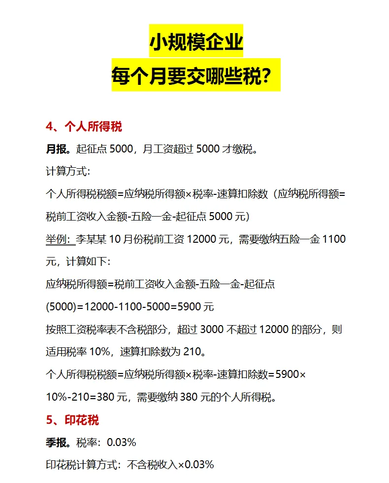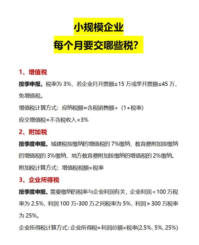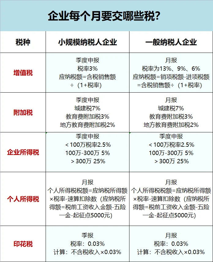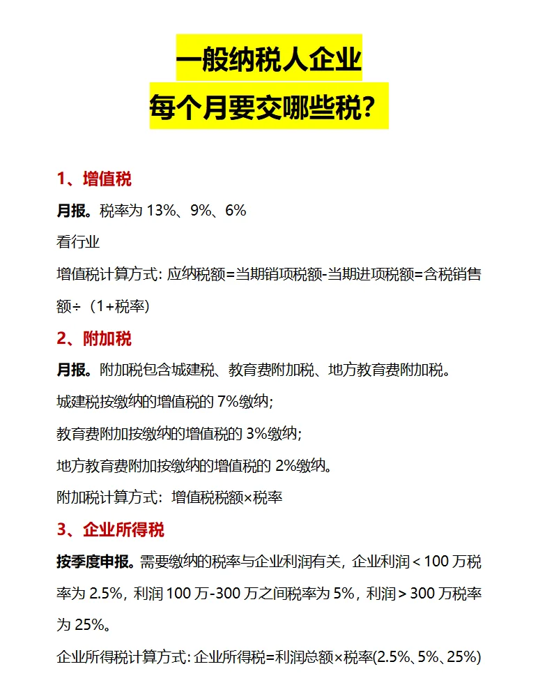 公司每月需要缴纳哪些税款 1、 小型纳税人企业 1.增值税 按季度申报。税率是3%。企业月发票金额≤15万,季度发票金额≤45万,免征增值税。 增值税计算方法:应纳税额=含税销售额÷(1+税率) 应交增值税=不含税收入x 3% 2.附加税 按季度申报。附加税包括城市建设税、教育附加、地方教育附加。城市建设税按已缴纳增值税的7%缴纳,教育附加按已缴纳的增值税的3%缴纳,地方教育附加按所缴增值税的2%缴纳。[吃瓜R] 附加税计算方法:增值税额×税率 3.企业所得税 按季度申报。需要缴纳的税率与企业的利润有关。企业利润100万以下的税率为2.5%,利润100万至300万的税率为5%,利润300万以上的税率为25%。 企业所得税的计算方法:企业所得税=利润总额x税率(2.5%、5%、25%) 4.个人所得税 月度报告。最低税点是5000,只有当月薪超过5000时才纳税。 计算方法: 个人所得税税额=应纳税所得额x税率-快速扣除额(应纳税所得税额=税前工资收入额-五险一金-起征点5000元) 5.印花税 季度报告。税率:0.03% 印花税计算方法:不含税收x 0.03% 2、 一般纳税人企业 1.增值税 月度报告。13%、9%和6%的税率 看看这个行业 增值税计算方法:应纳税额=当期销项税额-当期进项税额=含税销售额÷(1+税率) 2.附加税 月度报告。附加税包括城市建设税、教育费附加和地方教育费附加。 城市建设税按已缴纳的增值税的7%缴纳; 教育费附加按所缴增值税的3%缴纳; 地方教育费附加按所缴增值税的2%执行。 附加税计算方法:增值税额×税率 3.企业所得税 按季度申报。需要缴纳的税率与企业的利润有关。企业利润100万以下的税率为2.5%,利润100万至300万的税率为5%,利润300万以上的税率为25%。 企业所得税的计算方法:企业所得税=利润总额×税率(2.5%、5%、25%) 4.个人所得税 月度报告。最低税点是5000,只有当月薪超过5000时才纳税。 计算方法: 个人所得税税额=应纳税所得额x税率-快速扣除额(应纳税所得税额=税前工资收入额-五险一金-起征点5000元) 5.印花税 月度报告。税率:0.03% 印花税计算方法:不含税收x 0.03%