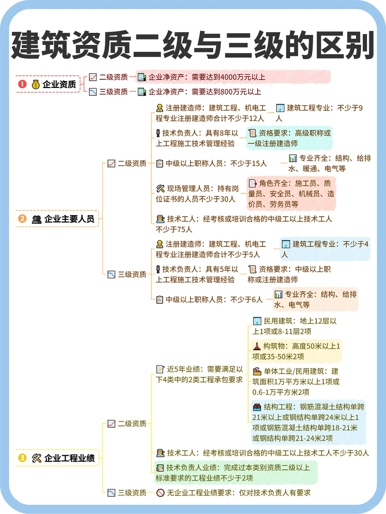 大家好,我是一名经验丰富的工程师,有10年的工作经验。我知道,对于从事建筑行业的人来说,建筑资质水平非常重要,因为它直接影响到你能接受的项目和企业的发展。所以今天,我将详细解释二级和三级建筑资质的区别。 企业资质 首先,我们来谈谈企业资质。二级和三级建筑资质之间的区别在这里非常明显。二级资质要求企业资产净值在4000万元以上,三级资质则要求企业资产净额在800万元以上。 企业关键人员 其次是企业的主要人员。二级建筑资质要求的人员配置比三级资质要求的严格得多。在二级资质中,技术负责人需要具有8年以上工程施工技术管理经验和相应的高级职称或一级注册建造师资格。具有三级资质的技术负责人只需具备5年以上工作经验和中级以上职称即可。 企业工程性能 最后,让我们来看看对企业工程性能的要求。第二级施工资质对业绩要求非常具体和严格,包括在过去5年中承担不同类型和规模的项目。然而,在这方面对3级资格没有明确的要求。 具体而言,二级建筑资质要求在过去5年内至少承担过2类大型工程,如地上12层及以上的民用建筑工程或50米及以上的构筑物。然而,对3级资格没有这样的要求。 我希望这篇文章能帮助你清楚地了解二级和三级建筑资质的区别,以便做出更合适的选择。