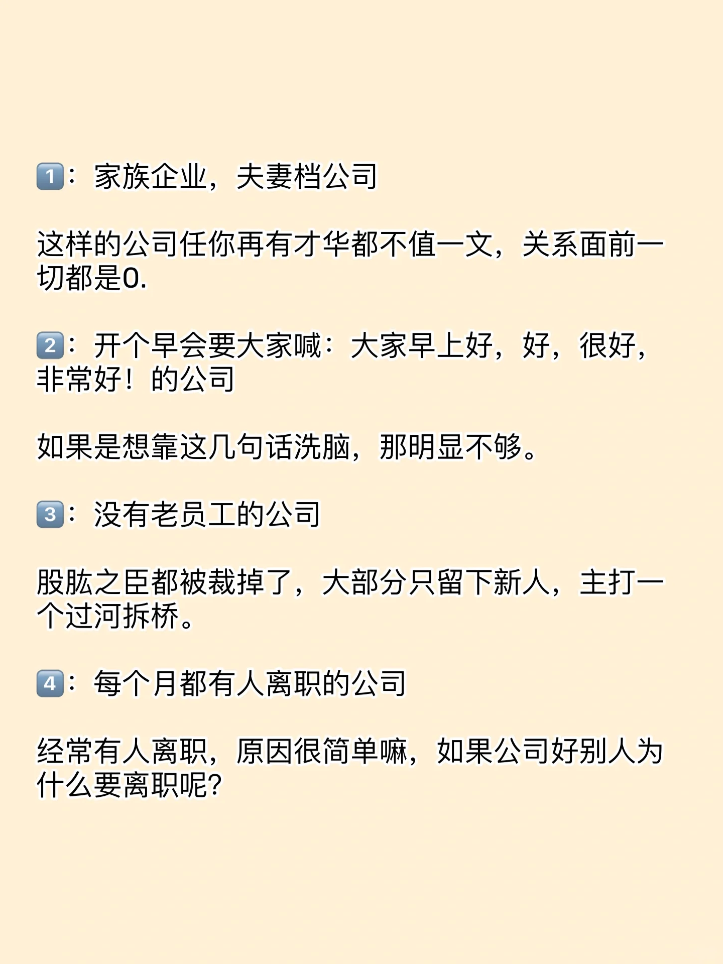 公司做得不好,老板做得怎么样 事实上,每个人都很相似。 工作方式: 事实是,如果你做得不好,你将不得不扣钱。 今天,我们来谈谈垃圾公司的一些特点。 如果你的公司是一样的,那么你仍然需要更聪明, 如果你赚不到钱,那就获得资格证书。如果你不能获得资格证书,那就建立关系。如果你什么都赚不到,最好利用它 家族企业,已婚公司。 这样的公司,不管你多么有才华,都不值一分钱。关系面前的一切都是零 开个早会,让大家喊一声:大家早上好,很好,非常好!我们公司 如果你想用这些话给自己洗脑,那显然是不够的。 没有高级员工的公司 该领域的所有官员都被解雇了,他们中的大多数人只留下新来的人,专注于破桥渡河。 员工每月离职的公司 人们经常离职,但原因很简单。如果公司很好,为什么其他人要离开 下班后开会的公司 我只想说,你在工作时间做什么你不能在工作中开会,你一完成工作就开会吗 经常监控员工的公司 当我去上班检查手机时,我会被叫到办公室喝茶,如果我长时间去洗手间,我也需要和别人说话 总有一双眼睛在公司的监视下看着你,一举一动都在监视之下。 分工不明确的公司 有多少人做一个人的工作,不管是不是你的工作,都取决于你。如果你累了,那就不取决于你了。如果你做不好,那都是你的责任。 不支付加班费的公司 加班应是自愿的,并应支付加班费。 更不用说无薪加班了,还是要增加的!如果没有添加,则扣除款项。 领导素质差的公司 作为一个领导者,我有一种奇怪的阴阳气场,一种糟糕的性格,高举低踏,缺乏技巧,恶心。 : 不定期支付工资的公司 这种公司可以用一句话来概括:赶紧离开! 多呆一秒钟可以吗缺乏尊重。 1.系统频繁变化的公司 规章制度都取决于领导人的心情。今天换这里,明天换那里。 2.将一切与绩效挂钩的公司 你能挣多少工资从来都不是一个固定的数字! 什么是性能它被称为鼓励每个人积极改进并努力提高绩效。 一个多疑的人,辛苦工作一个月后,他的血汗工资被扣除了。