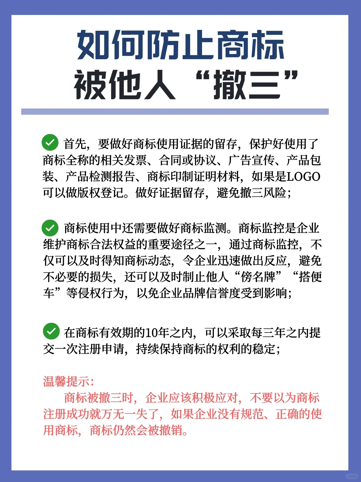 首先,要保留商标使用的证据,保护使用商标全称的相关发票、合同或协议、广告、产品包装、产品检测报告和商标印刷证明材料。如果是标志,可以进行版权登记。保管好证据,避免撤回证据的风险;