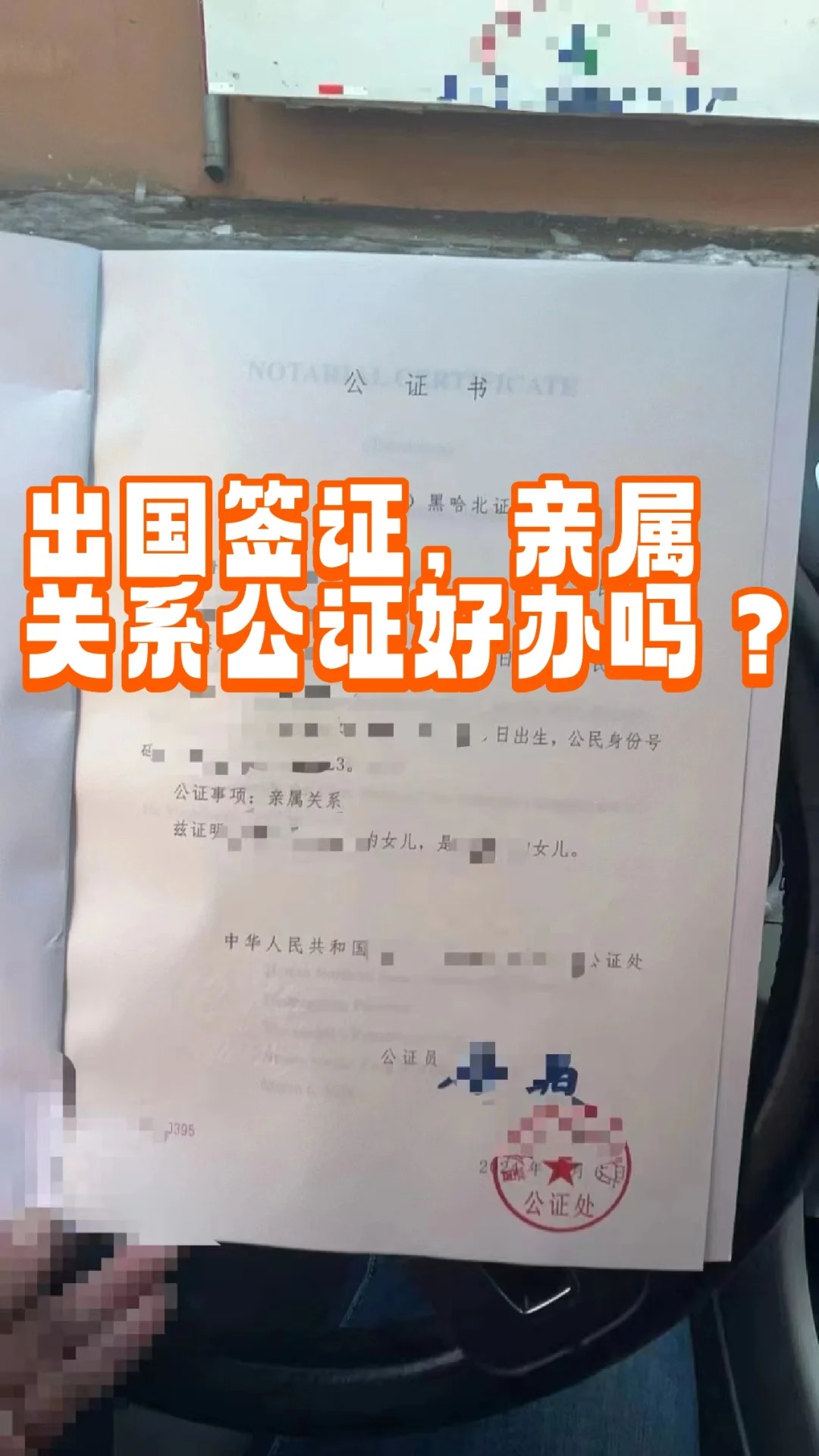 出国签证需要办理的亲属关系公证并不复杂,一般在3-5个工作日左右就可以拿到公证书。 提到签证,我们大家都知道是出国会办理的手续,然而不是只要有签证就可以出国的,还会要求办理其它手续,但很多人是首次出国,并不清楚怎样办理,碰巧就有人问,出国签证亲属关系公证好办吗?好办吗? 据了解,出国签证需要办理的亲属关系公证并不复杂,这是由于亲属关系是常见的公证事项之一,办理的流程并不是很复杂,办理的时间也不会很久,一般在3-5个工作日左右就可以拿到公证书,办理的费用也不会很高。 办理人准备好有关材料就可以到所在地的涉外公证处提出办理申请了,因为是出国使用的公证书,公证书必须要翻译为目的国家的语言才可以,但只有拥有涉外资质的公证处才具备该翻译职能。材料须知 需要提醒办理人的是,亲属关系的材料不是固定的,要依据不同的亲属关系来准备,其中基本的材料有: 1、申请人跟关系人的身份证,户口本; 2、办理人与关系人之间的亲属关系证明(包括出生医学证明、独生子女父母光荣证、亲子鉴定报告、收养证、原始户籍底册、人事档案材料等;证明父母与子女的关系,可以根据自身情况选择材料) 3、父母结婚证。 关于出国签证亲属关系公证是否好办就介绍到这里了,有任何不清楚的,欢迎随时咨询我