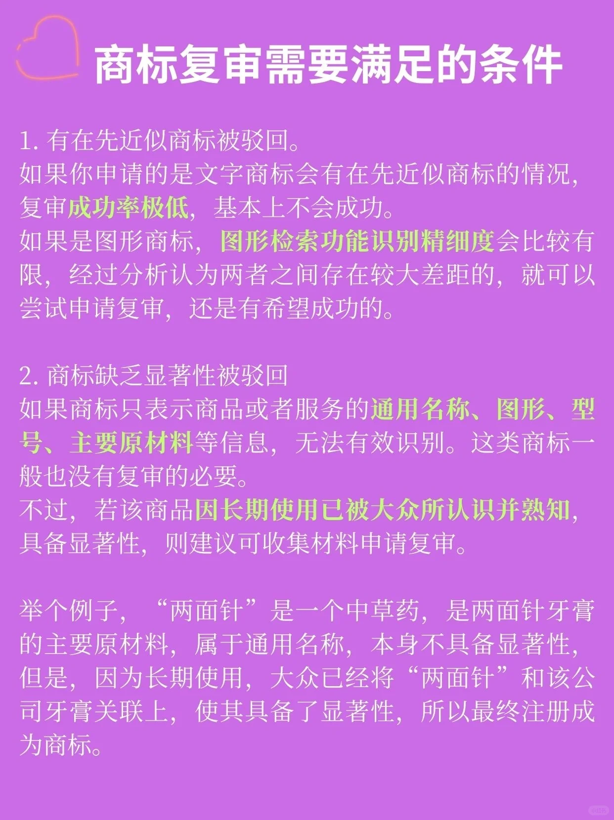 这个商标被拒了吗进行审查的官方费用是675元,但这仍然是一个在线申请!如果根本没有希望,那不是在浪费钱 小编为大家整理了这些最常见的拒绝原因,将帮助大家分析哪些情况不需要复查。 先前的类似商标被驳回。 如果你申请的是书面商标,可能会出现商标与前一个类似的情况,复审成功率极低,基本上不成功。 如果是图形商标,图形检索功能的识别精度会相对有限。经过分析,认为两者差距较大,可以尝试申请复试,仍有希望成功。 商标缺乏显著性被驳回 如果商标仅代表商品或服务的通用名称、图形、型号、主要原材料等信息,则无法有效识别。一般来说,没有必要对此类商标进行复审。 但是,如果该产品因长期使用而被公众认可和熟知,并具有重要意义,建议收集材料并申请复检。 例如,“良眠珍”是一种中草药,是良眠珍牙膏的主要原料。它是一个通用名称,本身没有显著性。然而,由于长期使用,公众已经将“良眠珍”与该公司的牙膏联系在一起,使其更加突出。因此,它最终被注册为商标 由于商标的条件和成分不同,有不同的可能性,我无法与大家一一列举。如果您需要咨询有关商标的信息,可以私信给我。