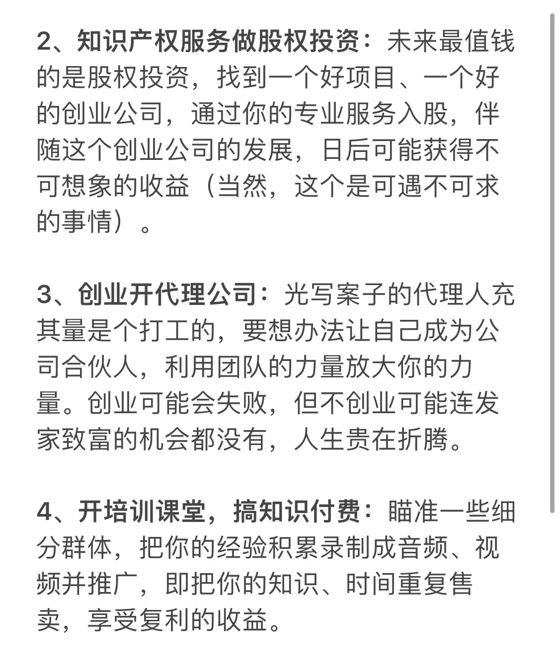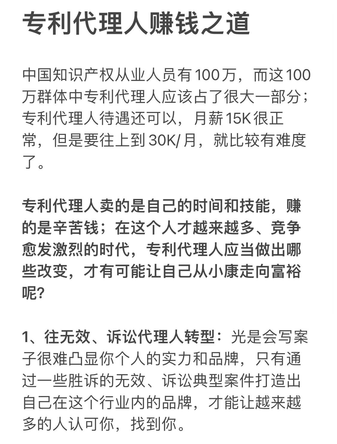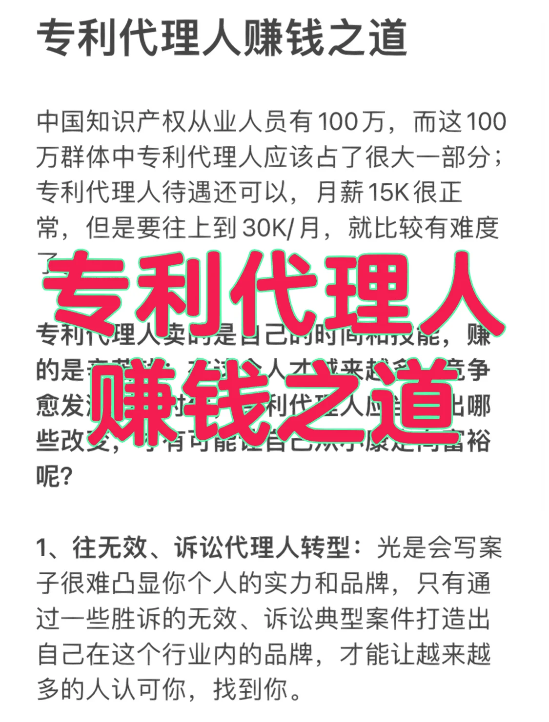 中国有100万知识产权从业者,专利代理人应占这一群体的很大一部分; 专利代理人的待遇不错,月薪15K是正常的,但要提高到月薪30K是相当困难的。 专利代理人出卖自己的时间和技能,赚取辛苦赚来的钱;在这个人才日益增长、竞争激烈的时代,专利代理人应该做出什么改变,才能从小康社会走向繁荣 1.向无效和诉讼代理人的转变:仅仅通过写案例很难突出你的个人实力和品牌。只有通过一些典型的无效案例和胜诉的诉讼案例,在这个行业建立你的品牌,才能让越来越多的人认可你,找到你。 2.股权投资的知识产权服务:未来最有价值的是股权投资。找一个好的项目或创业公司,通过你的专业服务进行投资,随着创业公司的发展,你可能会在未来获得难以想象的利润(当然,这是可以遇到但不受追捧的事情)。 3.创业,开代理公司:只写案例的代理充其量是兼职。你需要找到成为公司合作伙伴的方法,并利用团队的力量来扩大你的力量。创业可能会失败,但如果没有创业,一个人甚至可能没有致富的机会。人生的价值在于起起落落。 4.开设培训班,从事知识付费:针对特定的小众群体,将你积累的经验记录到音频和视频中,并进行推广,即反复转售你的知识和时间,享受复合利润。 5.做一个网红,整合资源:出版书籍、演讲等,为你的个人品牌包装和吸引追随者,因为你的品牌规模和你能整合的资源量可以为你赚同样多的钱。
