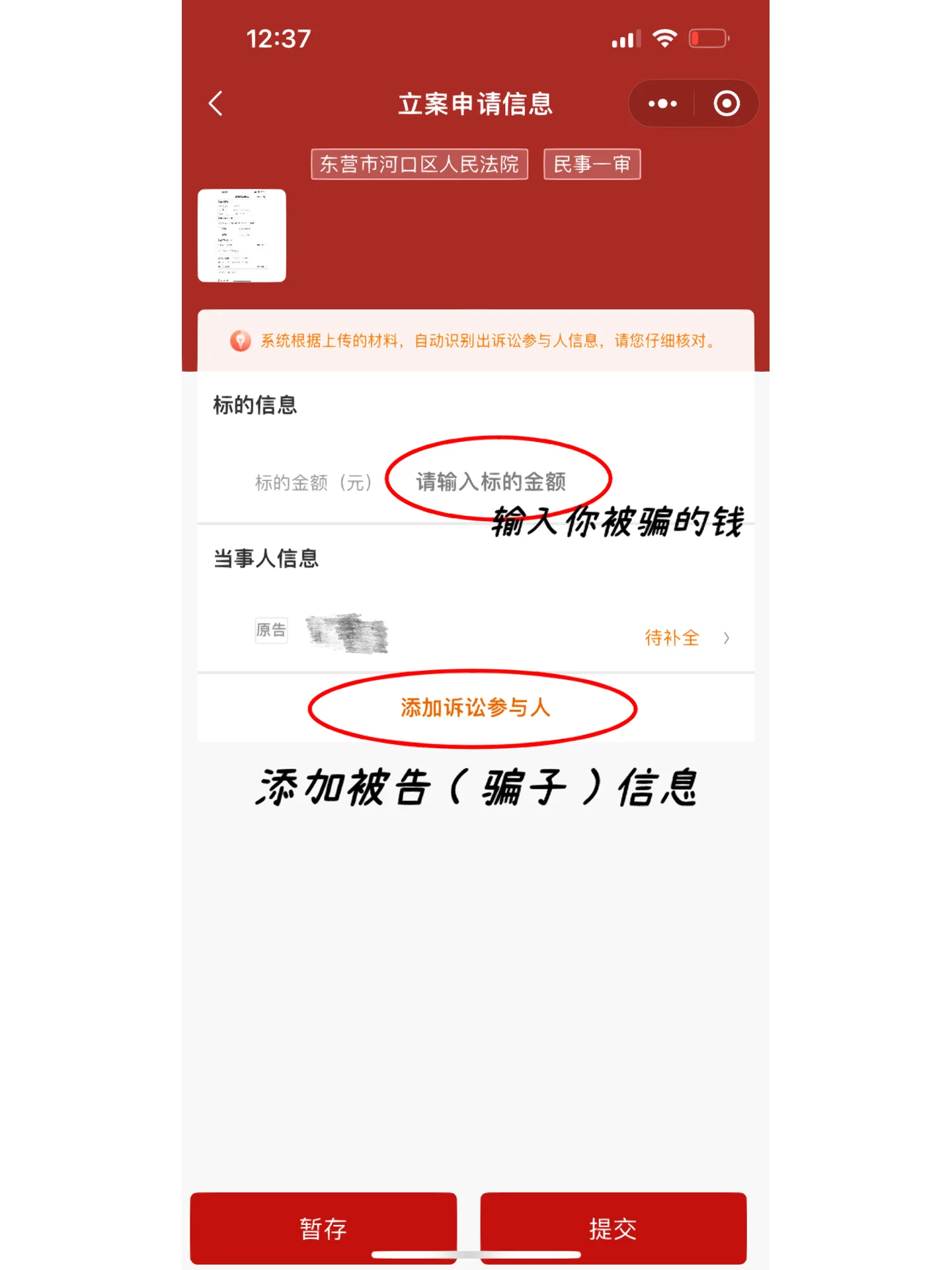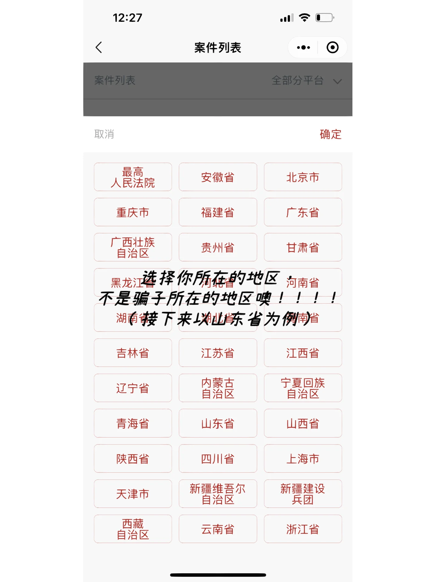 在上一篇关于被骗以及如何通过自己的努力拿回钱的文章之后,有很多红薯在网上询问立案的详细步骤。你可以参考图片 一些额外的解释: 最高人民法院认为,通过信息网络订立的买卖合同,标的物通过信息网络交付的,以买受人的住所地为合同履行地;标的物以其他方式交付的,收货地为合同履行地。因此,我们应该选择我们当地的法院,而不是骗子所在的法院。 投诉可以是手写的,但如果你不知道如何写,你可以参考小程序中提供的例子或在网上找到模板。 整个过程完成后,将进入法庭审查材料阶段。在法院审查材料(长时间)并确认立案后,需要支付诉讼费。因此,提交材料的过程不产生任何费用。即使你最终没有考虑诉讼费用,你也可以在起诉书中声明,本案发生的所有诉讼费用将由被告承担。 如果诈骗金额较大,建议尽快向您所在地和诈骗分子所在地的派出所报案。 最后,一些建议 任何提前确认收据的人都是骗子 任何不在平台上交易的人都是骗子 交易任何物品,尤其是电子产品等贵重物品,都必须谨慎!