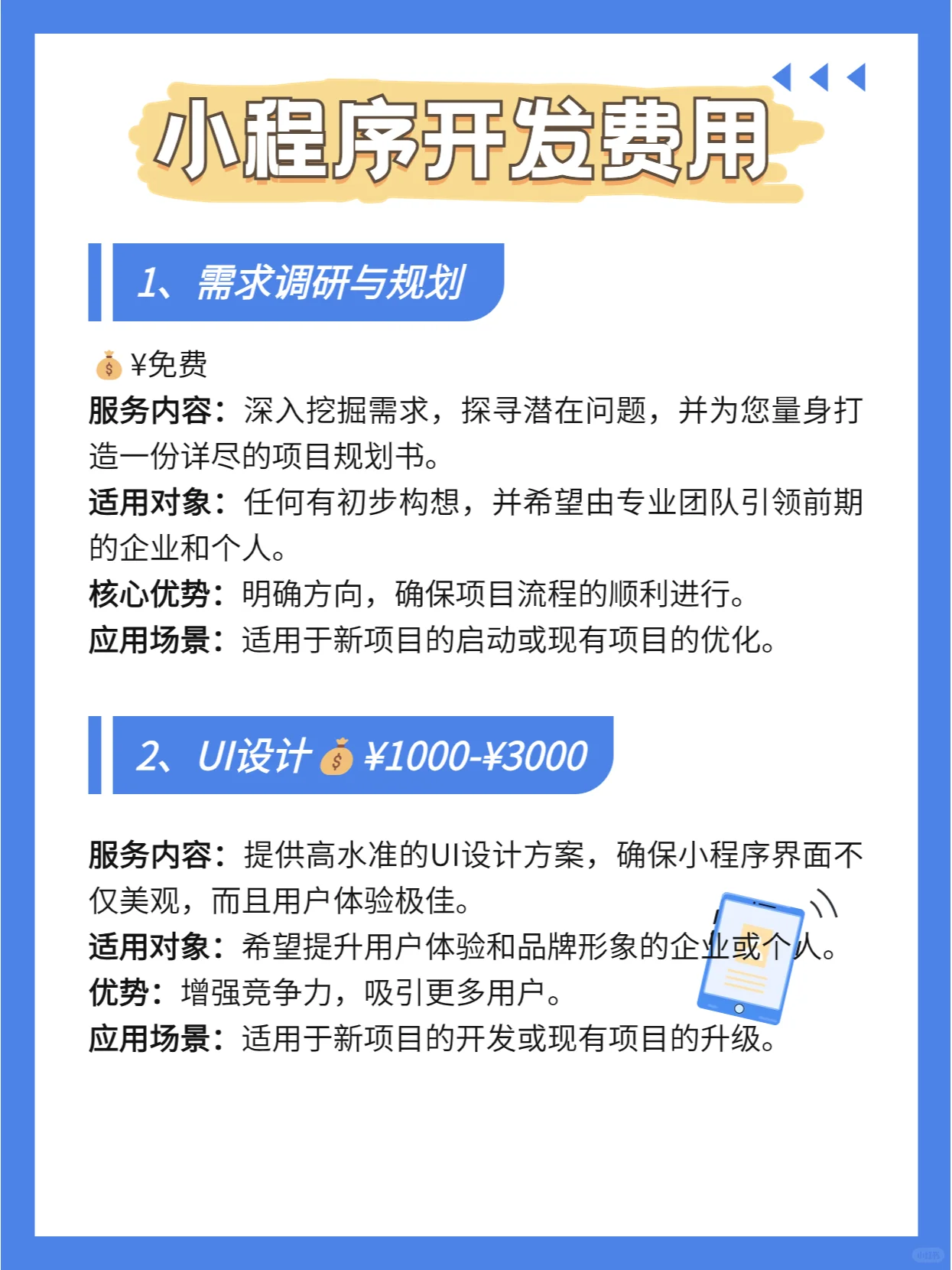 认证费 迷你程序的身份验证至关重要,因为它涉及到用户是否可以正常启动和搜索迷你程序。认证费用主要分为微信认证和支付宝认证。 微信认证费:300元,个人和企业均可进行认证。个人认证需要提供身份信息,企业认证需要提供营业执照和组织机构代码证书等。 域名费 给迷你程序起个好名字很重要,但你也需要注册一个专用域名。 注册费:大约在50到100元之间,你可以选择后缀,如.com,。cn,。net等。 服务器 运行迷你程序的后端需要强大的服务器支持,选择一台好的服务器至关重要。 购买成本:根据您需要的配置(如CPU、内存、硬盘容量等),大约在1000到3000元之间。 程序开发 开发成本是小程序开发中最大的支出,主要涉及前端、后端和服务器租赁。 开发成本:大约在5000到20000元之间。这需要专业的开发人员根据设计师的设计草案来开发所需的迷你程序功能。 以上是小程序开发的基本成本。当然,这只是基本成本,不包括推广和后期维护等其他费用。我希望这对你有帮助。如果你还有其他问题,随时可以问