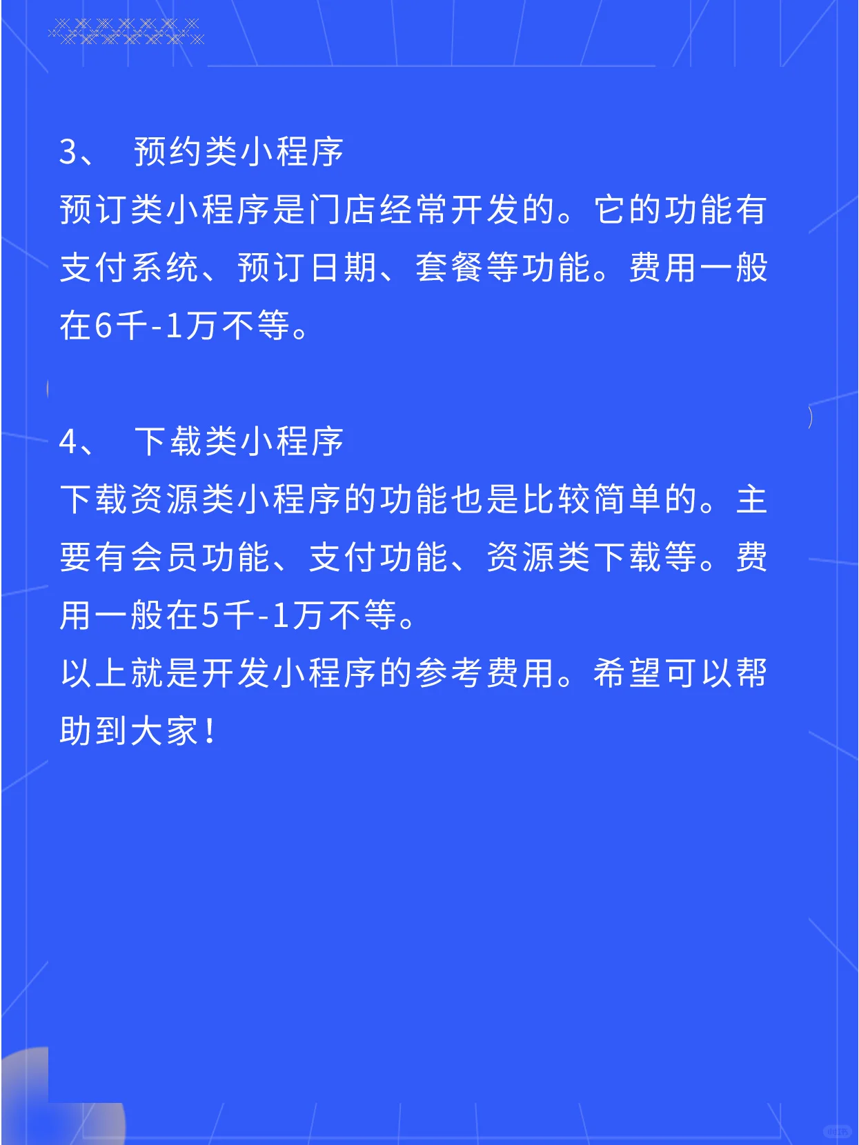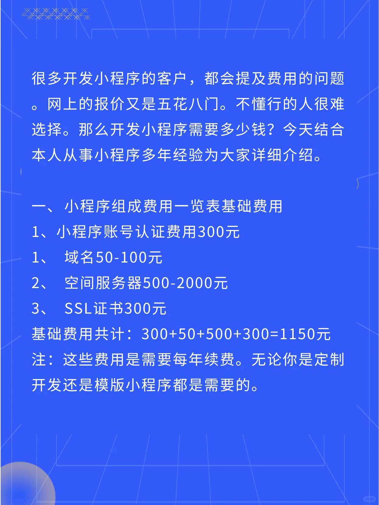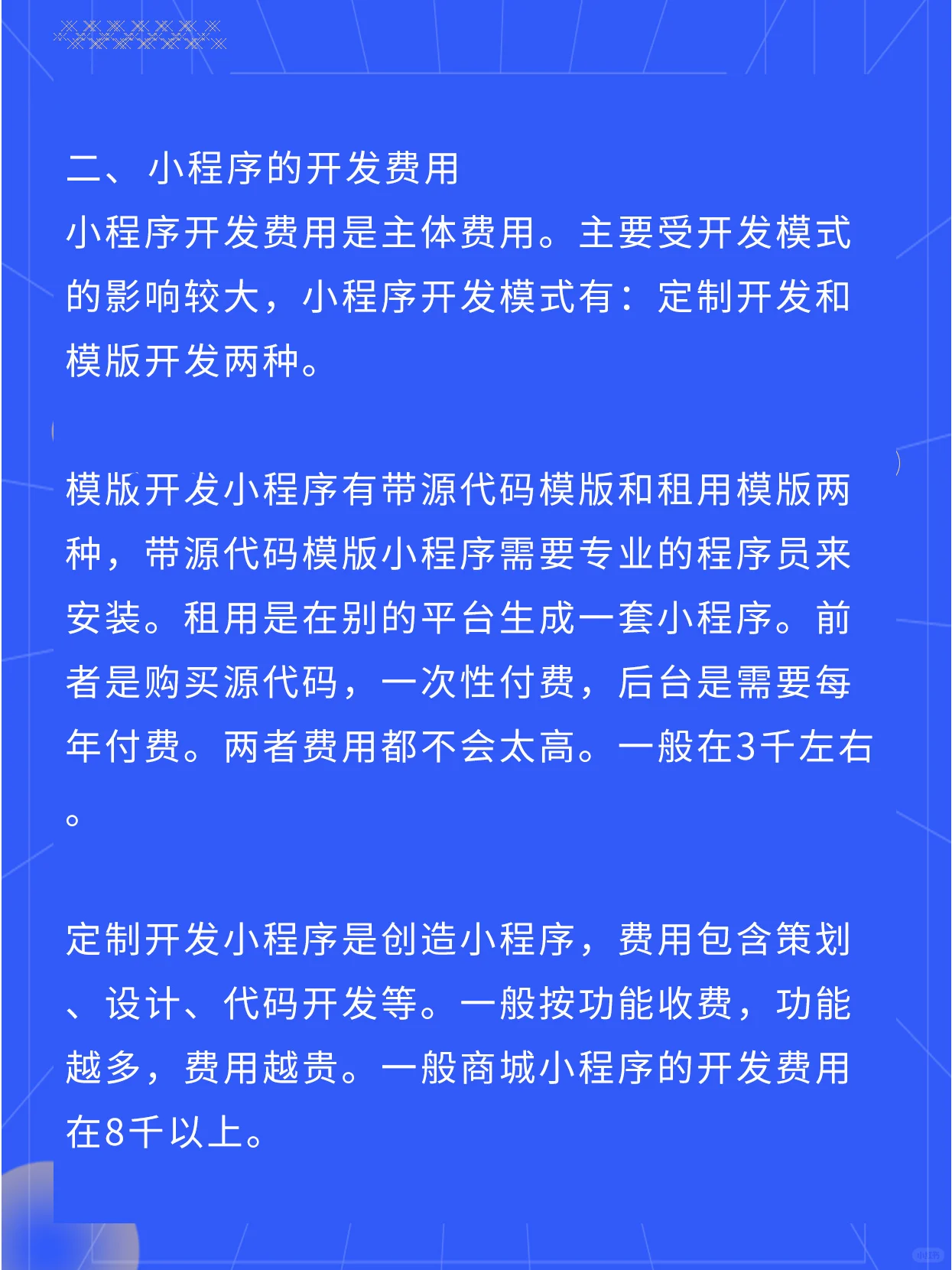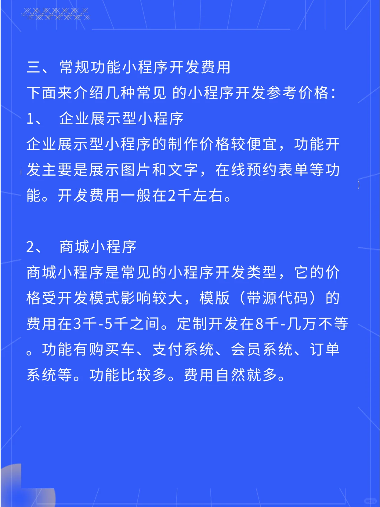 许多开发迷你程序的客户都会提到成本问题。网上的报价多种多样。不了解这个行业的人很难选择。那么开发一个迷你程序需要多少钱呢今天,我将根据我多年从事迷你程序工作的经验为您提供详细的介绍。 [颜色R]1。小程序组成成本列表基本成本 1.小程序账号认证费300元 2.域名50-100元 3.太空服务器500-2000元 4.Ssl证书300元 【萌R】基本费用合计:300+500+500+300=1150元 【吃瓜R】注意:这些费用需要每年更新一次。自定义开发和模板小程序都是必需的。 [金土豆R]二、。小程序开发成本 小程序的开发成本是主要成本。主要受开发模式的影响,微程序开发模式有两种:自定义开发和模板开发。 有两种类型的模板开发小程序:源代码模板和租赁模板。带有源代码模板的小型程序需要专业程序员安装。Renting正在其他平台上生成一组迷你程序。前者涉及一次性付款购买源代码,而后端则需要每年付款。这两种成本都不会太高。通常在3000左右。 迷你程序的定制开发是迷你程序的创建,成本包括规划、设计、代码开发等。通常按功能收费,功能越多,成本越高。一个典型的商城小程序的开发成本超过8000元。 【自拍R】三、常规功能小程序开发成本 以下是小程序开发的几个常见参考价格: [吻R]1。Enterprise Display迷你程序 企业显示小程序的制作价格相对便宜,功能开发主要包括显示图像和文本、在线预约表格等功能。开发成本一般在2000元左右。 [颜色R]2。购物中心迷你程序 商城小程序是一种常见的小程序开发类型,其价格受开发模式的影响很大。模板(带源代码)的成本从3000到5000不等。定制开发从8000到数万不等。功能包括购车、支付系统、会员系统、订单系统等,功能比较多。成本自然会增加。 [哇R]3。预约小程序 预订迷你程序通常由商店开发。它的功能包括支付系统、预订日期、套餐等。费用一般在6000元到10000元之间。 [可爱的R]4。下载小程序 下载资源小程序的功能也相对简单。主要功能包括会员资格、支付和资源下载。费用一般在5000元到10000元之间。 以上是开发迷你程序的参考成本。我希望它能帮助到每个人!