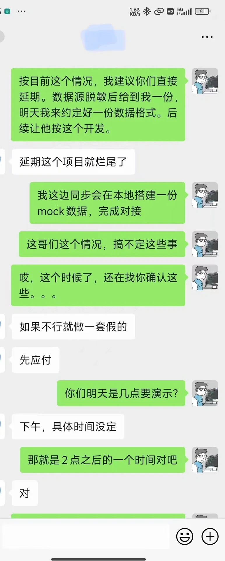 程序员太难了。软件定制和开发,当在线接单后遇到不可靠的后端时,项目工期直接增加1天,成为紧急订单。增加数量而不增加价格,不留任何损失的余地! [Wow R]在接受订单之前:最初在1月初讨论的视觉数据屏幕估计需要3天时间。由于之前沟通对方还有很多工作要做,友好的价格是每人每天1000元,报价3000元,一周内和周末。 收到订单后:我有一周没有回复任何人,页面设计也没有回复!周日晚上开始催促!我说我不得不延迟他们提供的接口! [失望的R]他变得焦虑起来:周日对齐后,他承诺提供一天的接口,但一直拖延。星期六中午,他变得很焦虑,需要在星期天中午之前完成。对方后台表示在下午5:30之前提供接口。 [石化R][石化R][石油化工R][石油石化R]时间紧任务重。我本想在未来进行长期合作,但我一直在敦促和等待。晚上11:30,对方后端还没有提供第一个批量接口!我在群里一直担心我用不上…兄弟,我很担心你! [叹息R]解决方案: 【一个R】周六晚上11点后:愤怒![再见R]与对方负责人沟通,要求提供脱敏数据。在18分钟内完成3个界面!平均每3分钟一次!你只是说,有这么多东西,怎么一天他都无法完成一个可用的界面!看看最后三个,数据还没有被拆分!雷霆滚滚!你这些天都在做什么客户提供给您的原始表格!以上就是催促的内容!睡觉 星期天早上9点左右,我被儿媳叫了过来,从头至尾地走着。群里的后端开发团队通知,今天下午4:30左右可以提供接口!我不买账,准备好拯救现场!不要在群里联系这个骗局,我会自己做的! 周日下午1:20,为客户负责人在线部署一个版本的对齐!微调!好吧,没什么大问题。下午4:30,客户:领导已经审核了,将在周一向地区领导报告! [四个R]你应该知道如何部署它!按照我的封装你的接口!继续打雷!10:30的界面还没有完成!按照约定,周六5:30之前或周日4:30之前怎么样你马上说了多少次了一直绕圈子是不是很有趣如果不是因为我无法访问互联网环境,我会自己做的!各种问题。。。各种左右拖动。。。省略一万字 [5R]周一晚上,客户:在区领导要求之前,我们的计划不一样。新年前,我们需要从主页上再添加四个详细页面,哪些是次要页面和其他模块的页面新年后继续! 好吧,好吗有工作,但又变得紧迫了![哭着挑衅R]