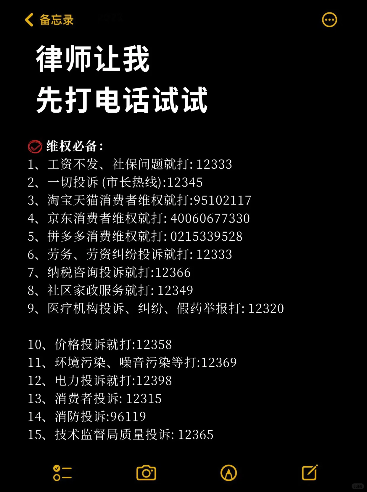 权利保护至关重要: 如果没有工资或社会保障问题,请拨打12333 所有投诉(市长热线):12345 淘宝、天猫消费者维权电话:95102117 京东消费者维权电话:40060677330 拼多多消费者维权电话:0215339528 劳动争议投诉请拨打12333 税务咨询投诉请拨打12366 社区家政服务热线:12349 医疗机构投诉、纠纷、假药举报:12320 价格投诉:12358 环境污染、噪声污染等打印:12369 如有电力投诉,请拨打12398 消费者投诉:12315 火灾投诉:96119 技术监督局质量投诉:12365 公共卫生监督:12320 电信投诉:12300 法律援助:12348 妇女权利保护:12338 农民工维权:12333 国家烟草局投诉:96300 城建服务热线:12319 全国公安机关举报电话及互联网举报平台:12389 全国法院诉讼服务热线:12368 国土资源局设立的违法土地矿产活动举报投诉热线是12336 互联网违法不良信息举报中心:12377 国家纪检监察机关:12388 工业和信息化部:12321