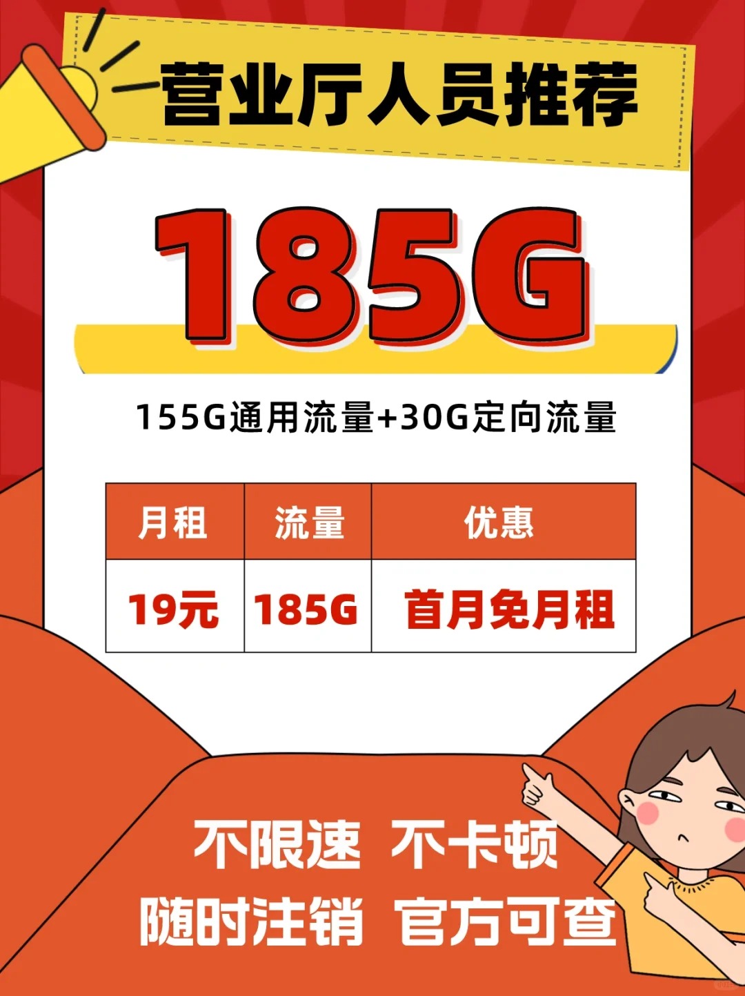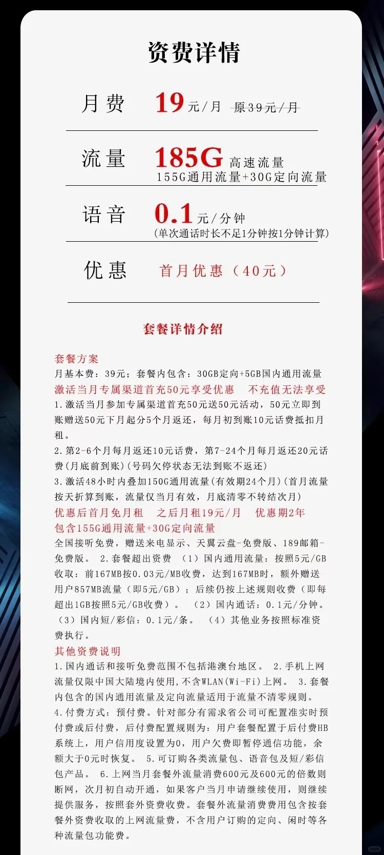 【流量】:每月185GB流量(155g通用流量+30g定向流量)