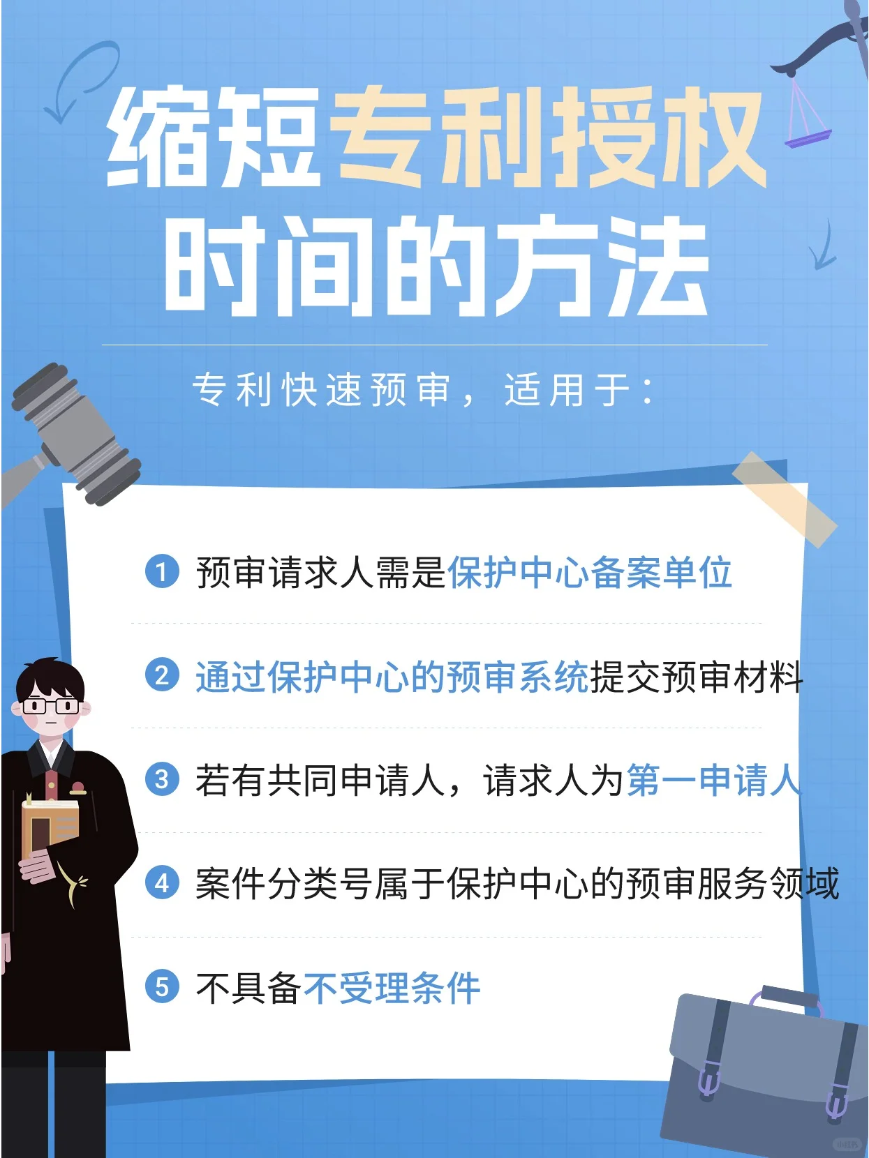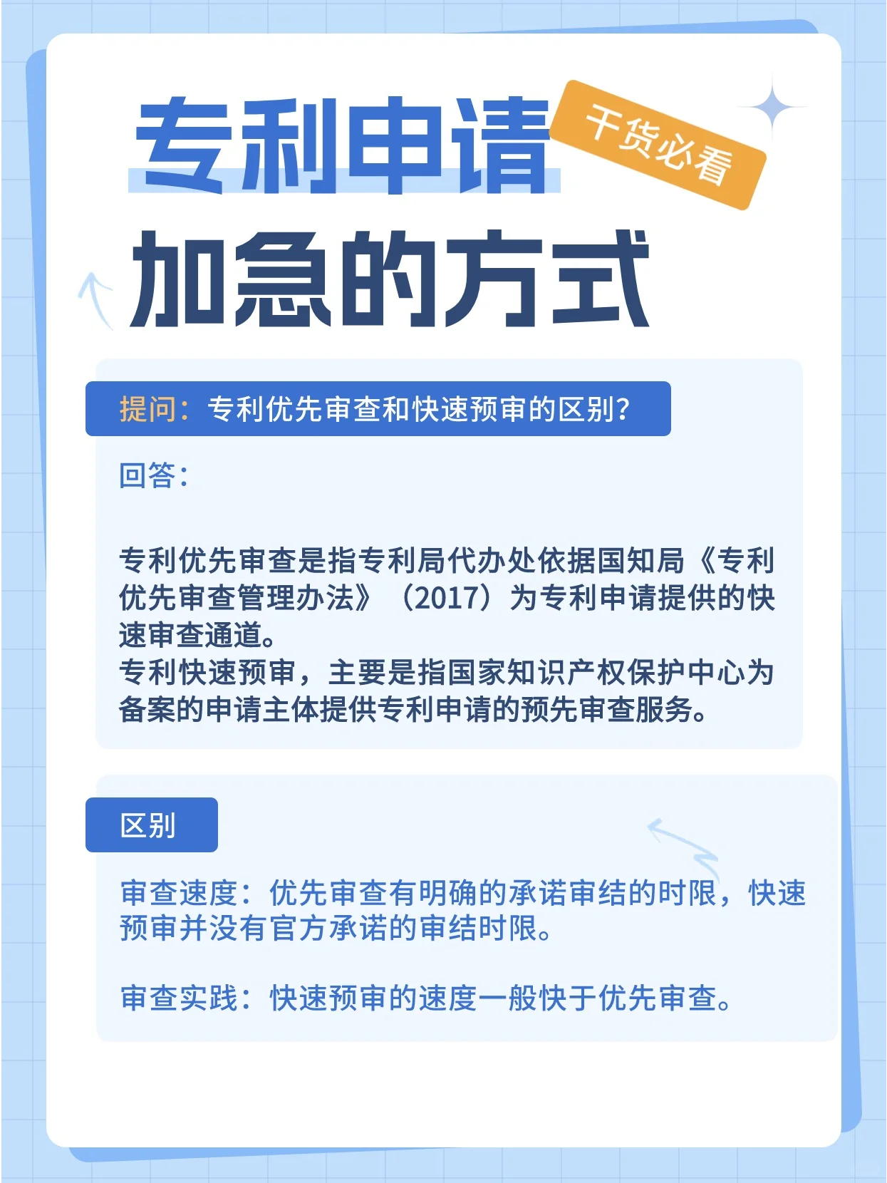 普通的专利申请过程复杂而耗时,尤其是发明专利,通常需要2-3年甚至更长的时间。尽管普通专利申请对申请人的限制较少,但随着技术竞争的日益激烈,一些高科技行业对专利的需求与日俱增。普通的专利申请程序对产品升级快的企业几乎没有优势,因此对于这类企业,中国国家知识产权局先后推出了【优先审查】和【快速预审】两个加速通道。 ❊ 专利优先权审查: 专利局根据《专利优先审查管理办法》(2017年),为符合要求的发明、实用新型和外观设计专利申请提供快速审查渠道。 ❊ 快速专利预审: 主要是指地方知识产权保护中心为备案申请人提供专利申请初审服务,中国国家知识产权局加快对通过保护中心初审的专利申请进行复审,缩短专利申请授权周期。 那么,专利预批准的速度有多快 理论上,各类专利的授权时间如下: 发明专利的授权期限可以从2-3年缩短到3-6个月左右; 实用新型专利的授权期限可以从6-9个月缩短到2个月左右; 外观设计专利的授权期限可以从3-6个月缩短到1个月左右。