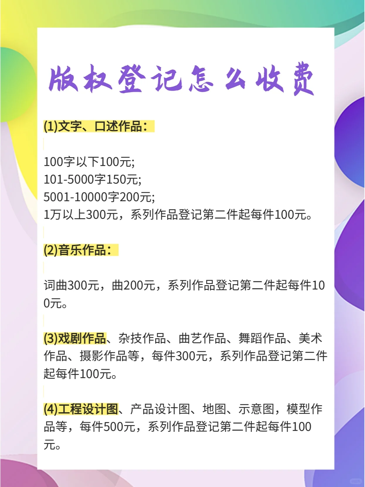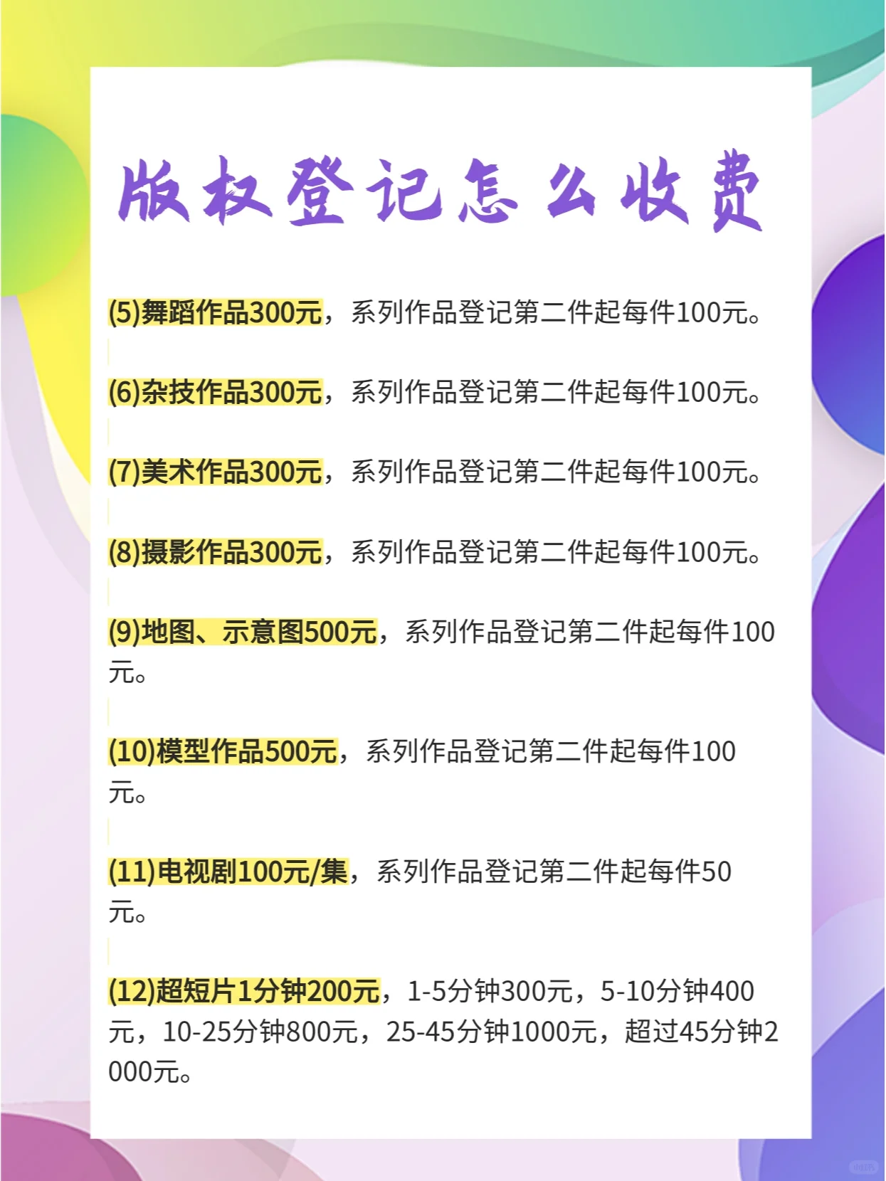 版权登记是否基于自愿原则在现实中,一些作品的所有者往往选择注册[深蹲R],以获得更多的保护。但我不知道要多少钱,所以让我们一起了解一下版权注册是如何收费的 书面和口头作品:100字以下作品100元;101-5000字,150元;5001-10000字,200元;一万多元300多元,从系列二次注册开始,每件100元 音乐作品:词曲300元,音乐200元,系列第二次注册起,每首100元 戏剧作品、杂技作品、曲艺作品、舞蹈作品、美术作品、摄影作品等,定价300元/件。从第二次注册开始的一系列作品,价格是每件100元吗 工程设计图、产品设计图、地图、原理图、模型作品等,每幅售价500元。从系列第二件的注册开始,每件的价格是100元吗 舞蹈作品300元,从系列第二次报名开始,每首100元 杂技作品300元,从系列第二次报名开始,每件100元 艺术作品300元,从系列第二次注册开始,每件100元 摄影作品300元,从系列第二次报名开始,每件100元 地图和图表要500元,从该系列的第二次注册开始,每幅要100元 模型作品500元,从系列作品二次注册开始,每件100元 电视剧100元/集,从剧集二次注册开始,每部50元 超短片每分钟200元,每1-5分钟300元,每5-10分钟400元,每10-25分钟800元,每25-45分钟1000元,每45分钟2000元#版权登记费